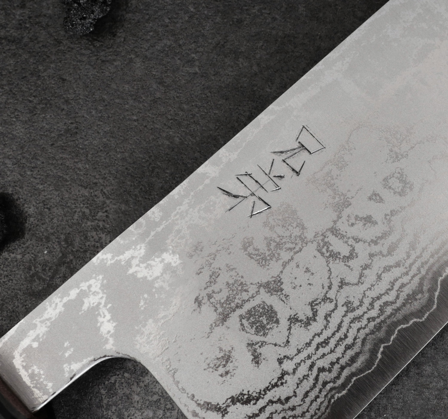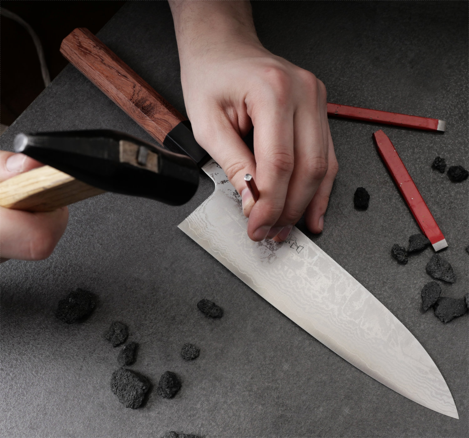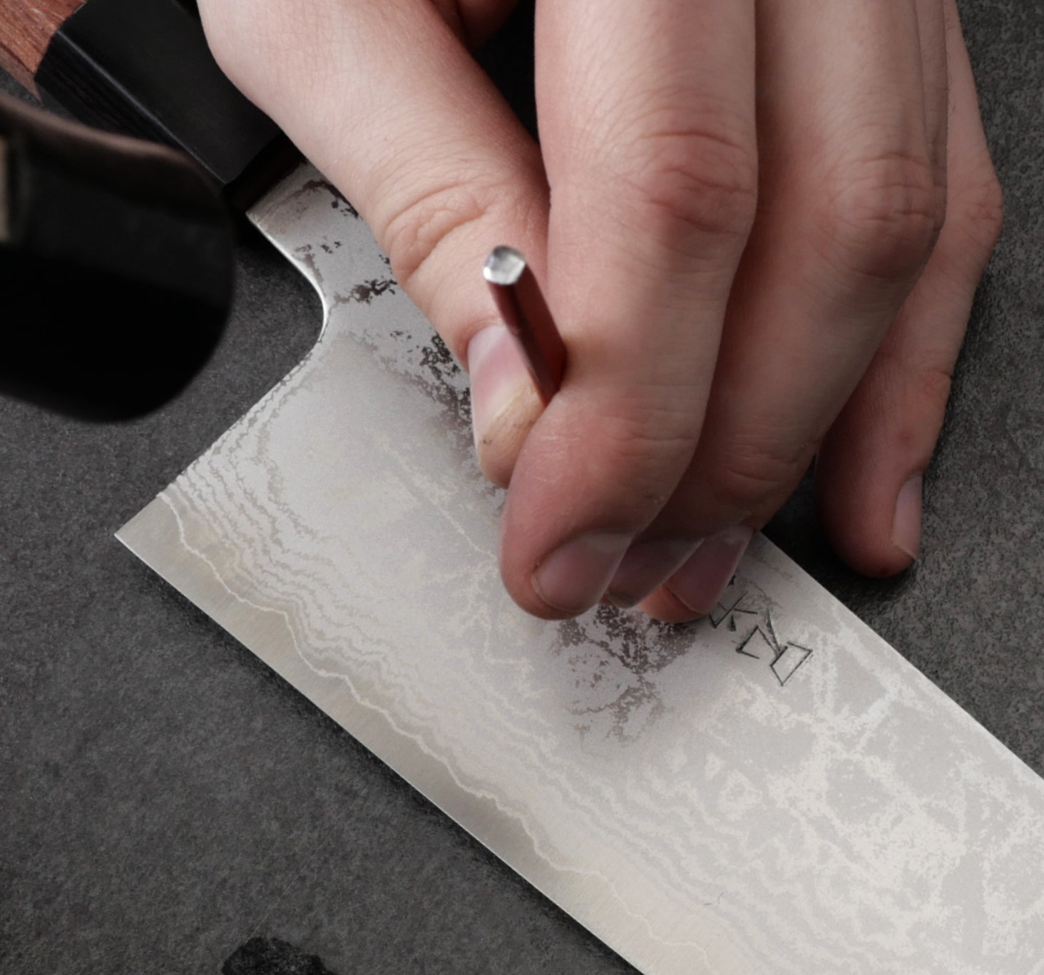 Kanji graveras med en traditionell mejsel och en liten hammare, på samma sätt som smederna ofta signerar sina handgjorda knivar på i Japan.