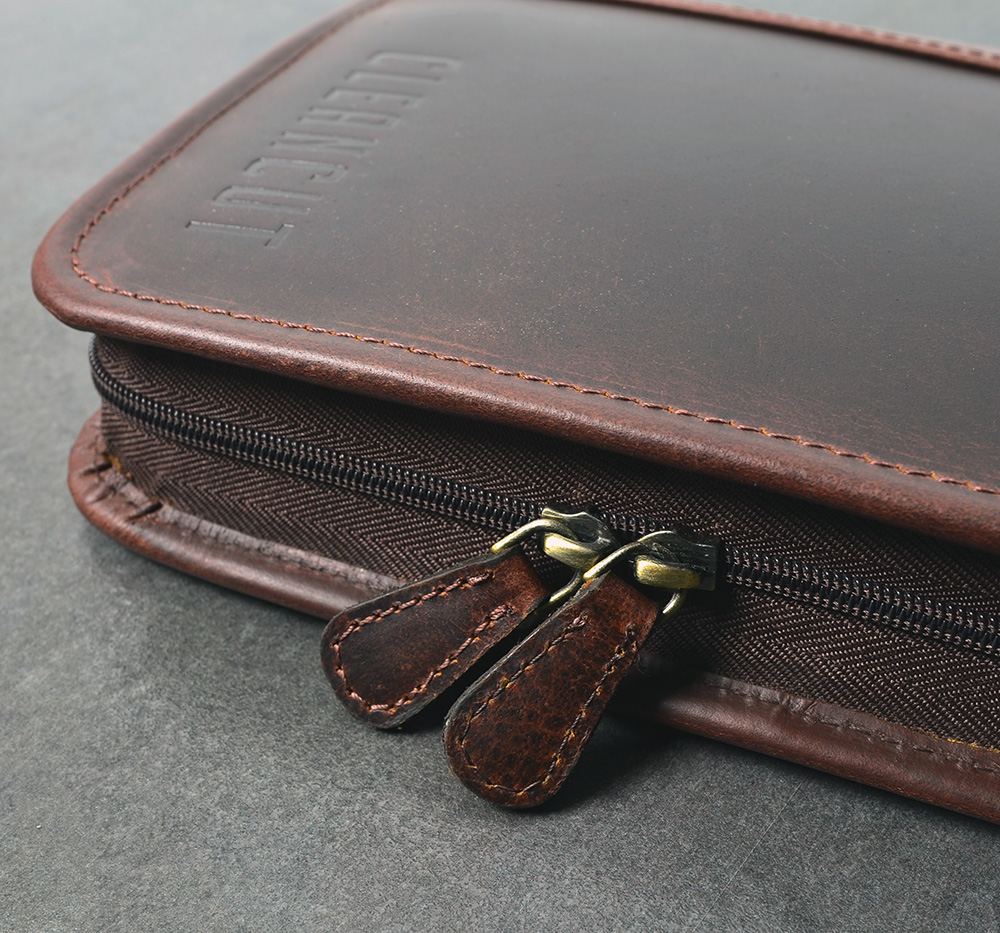 En riktigt högkvalitativ produkt. Doften av genuint läder är underbar och sömmarna andas kvalitet. Knivväskan stängs med kraftig blixtlås och bärs sedan i handen eller i en väska.