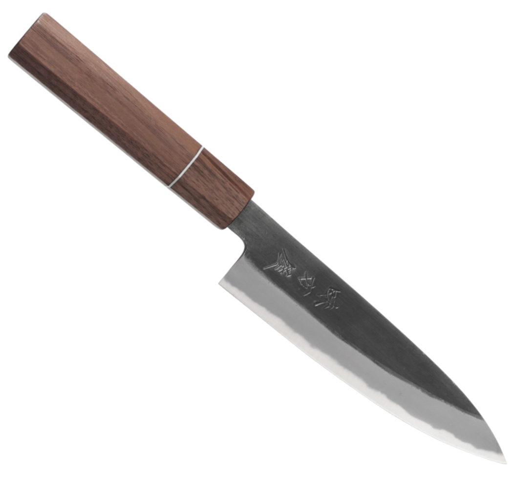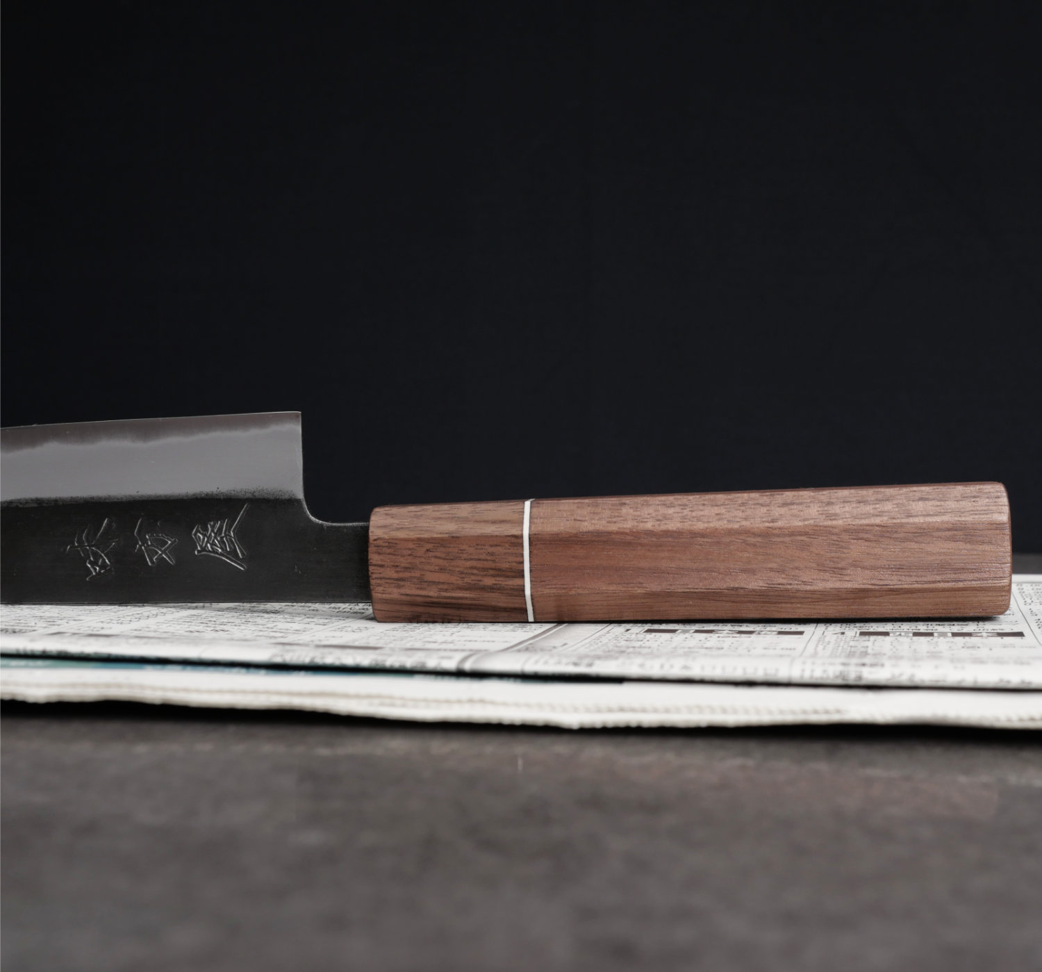 Allkniv från Mutsumi Hinoura med 138 mm långt blad. Skaftet är åttakantigt och tillverkas av valnöt med en vit spacer.