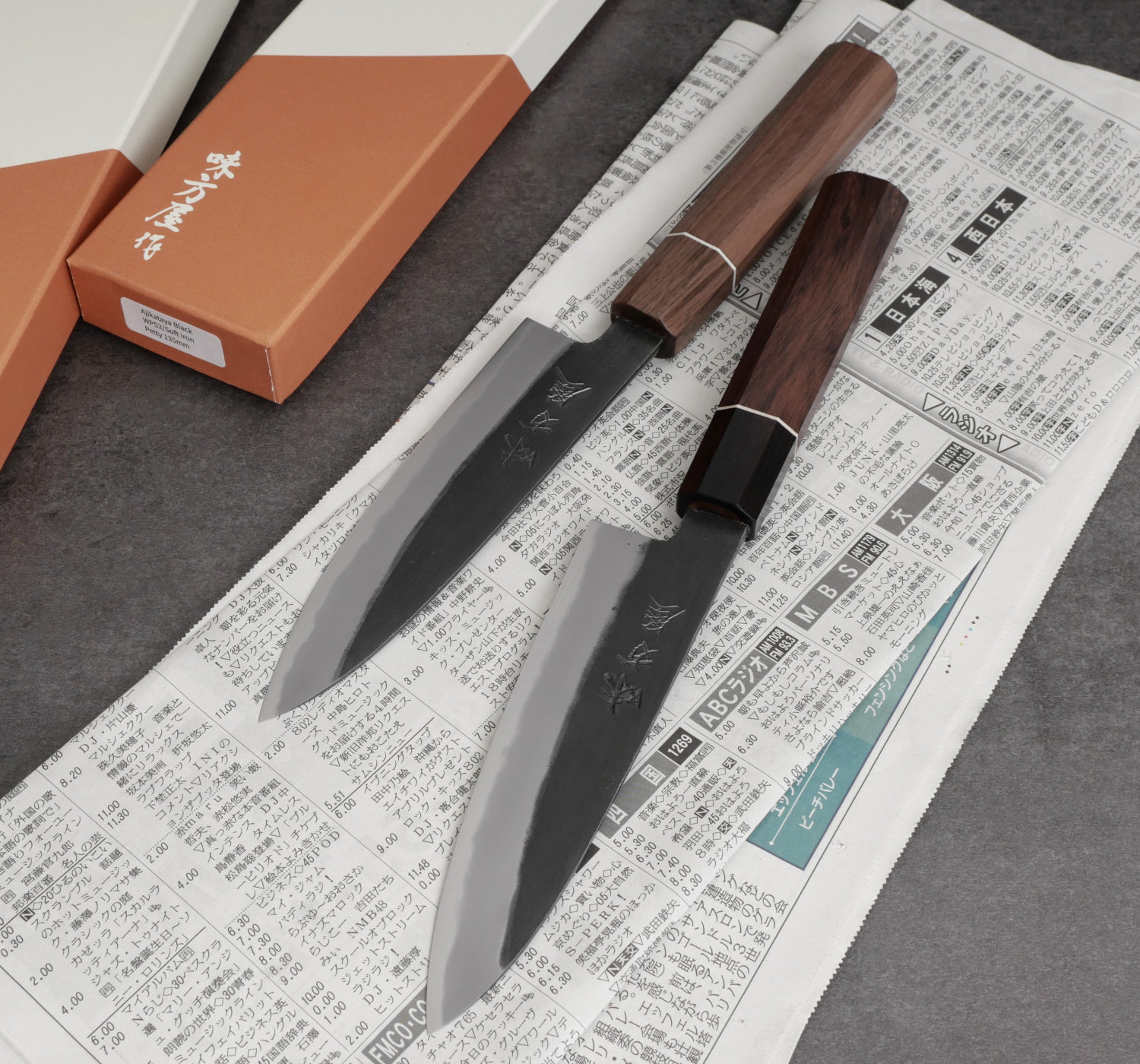 Ajikataya heter en serie knivar som tillverkas i samarbete mellan sonen Mutsumi och fadern Tsukasa. Knivarna tillverkas i kolstålet shirogami#2 och finishen på bladen är bedårande vackra. Familjen Hinoura är en av de främsta smidesfamiljerna i Japan. Alla knivar varmsmids för hand och inget blad lämnar Hinouras händer innan det är sylvasst och smitt till perfektion. I serien Ajikataya används kolstålet shirogami #2 som härdas till 63 HRC. Det är ett mycket hårt kolstål som tar en rakbladsvass egg. Hinouras knivar är våldsamt populära och leveranstiden är mycket lång. Finishen på bladet kallas nashiji-kurouchi vilket är en grov och svartoxiderad yta som ger en mycket rustik och genuin känsla.