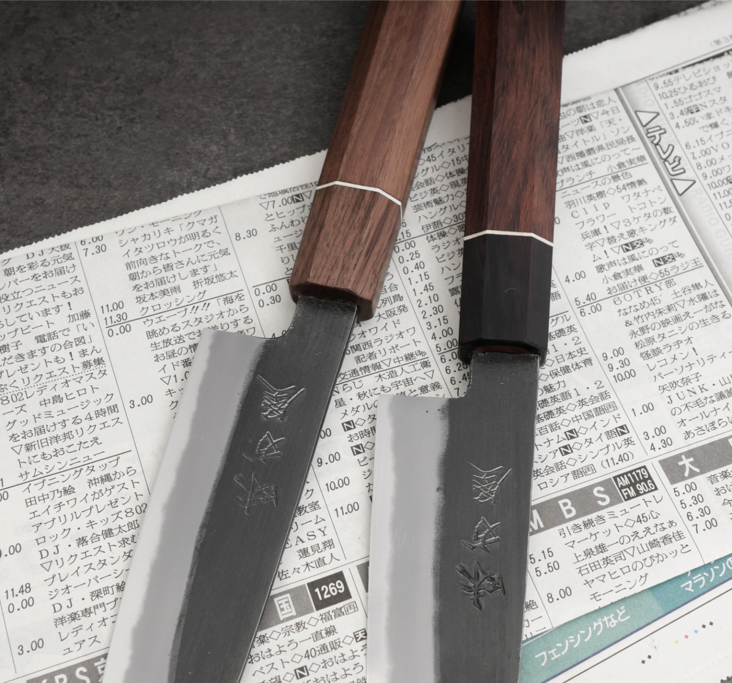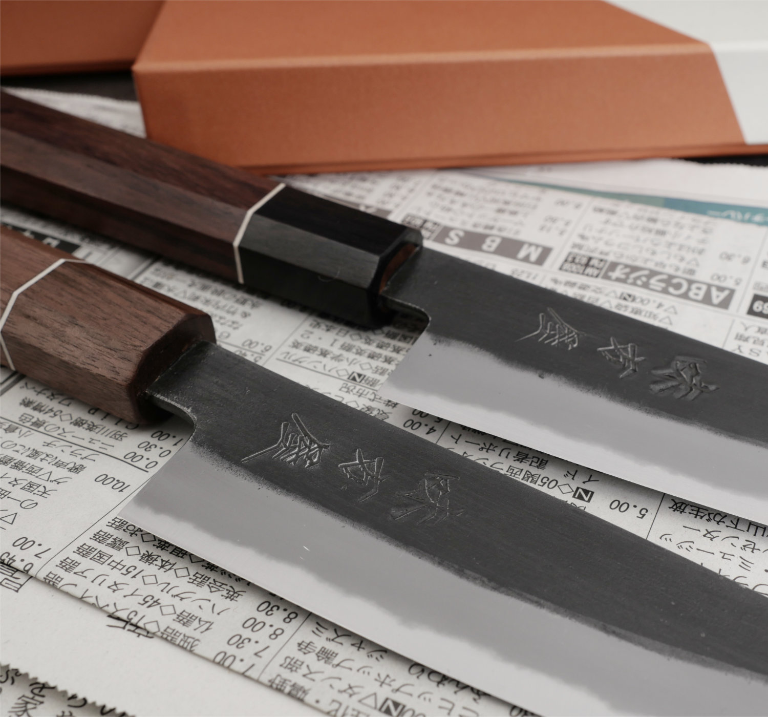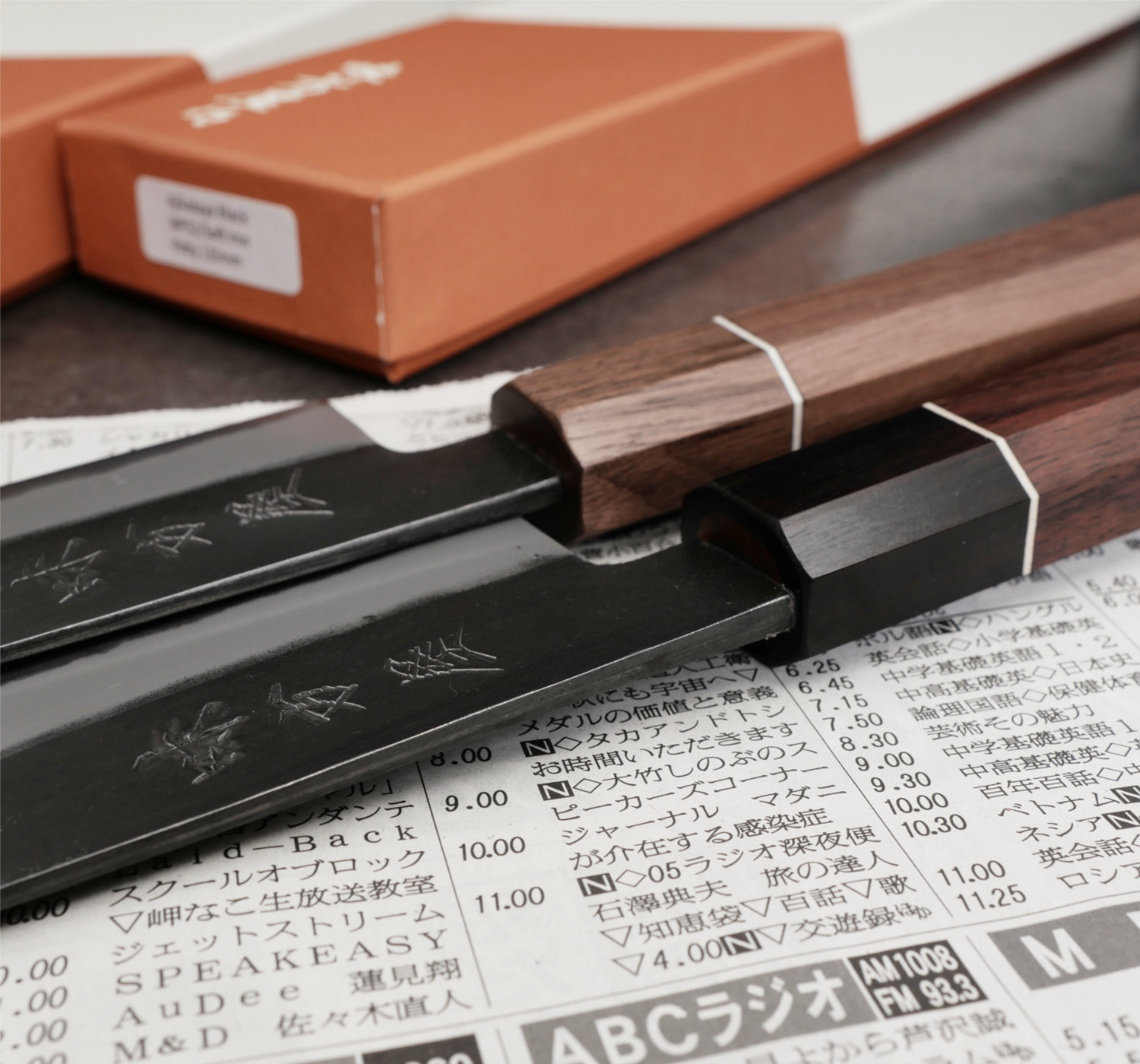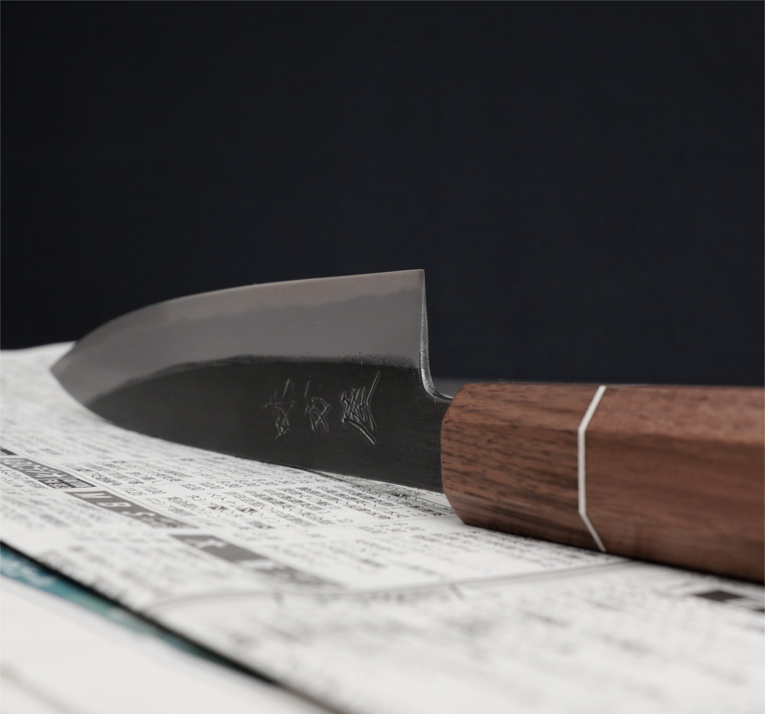 Som avslutning har den tunna och fina eggen försetts med en mycket vacker kasumifinish. Kasumi är en dimmig och silkeslen finish som förhöjer kontrasten mellan det blanka kärnstålet och det utanpåliggande mjukare lagret. Det är få knivar som levereras med så vacker finish på bladet.
