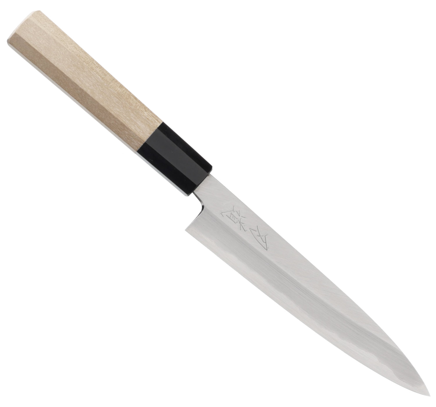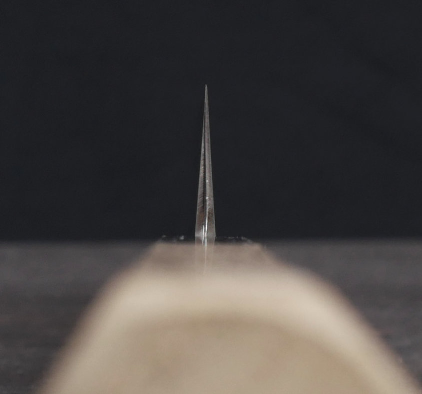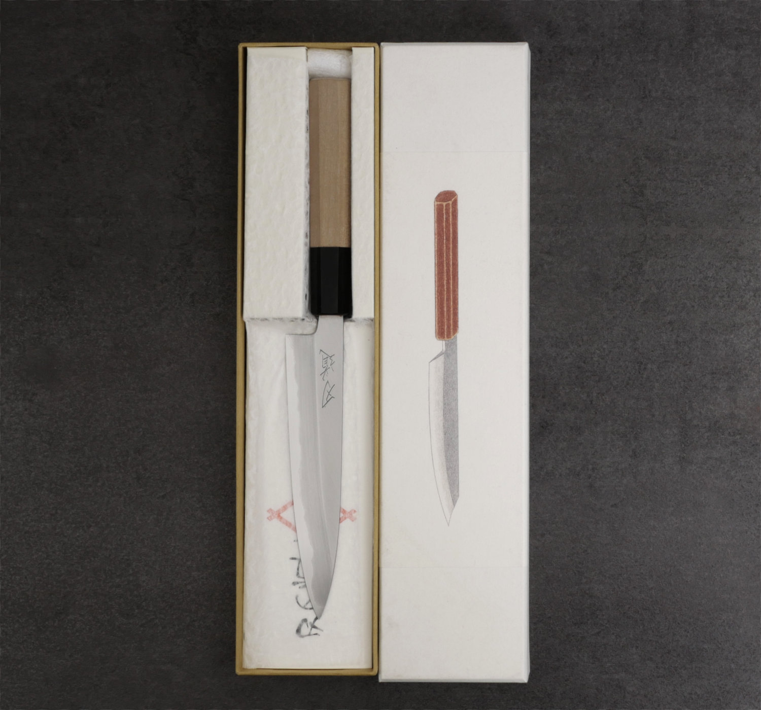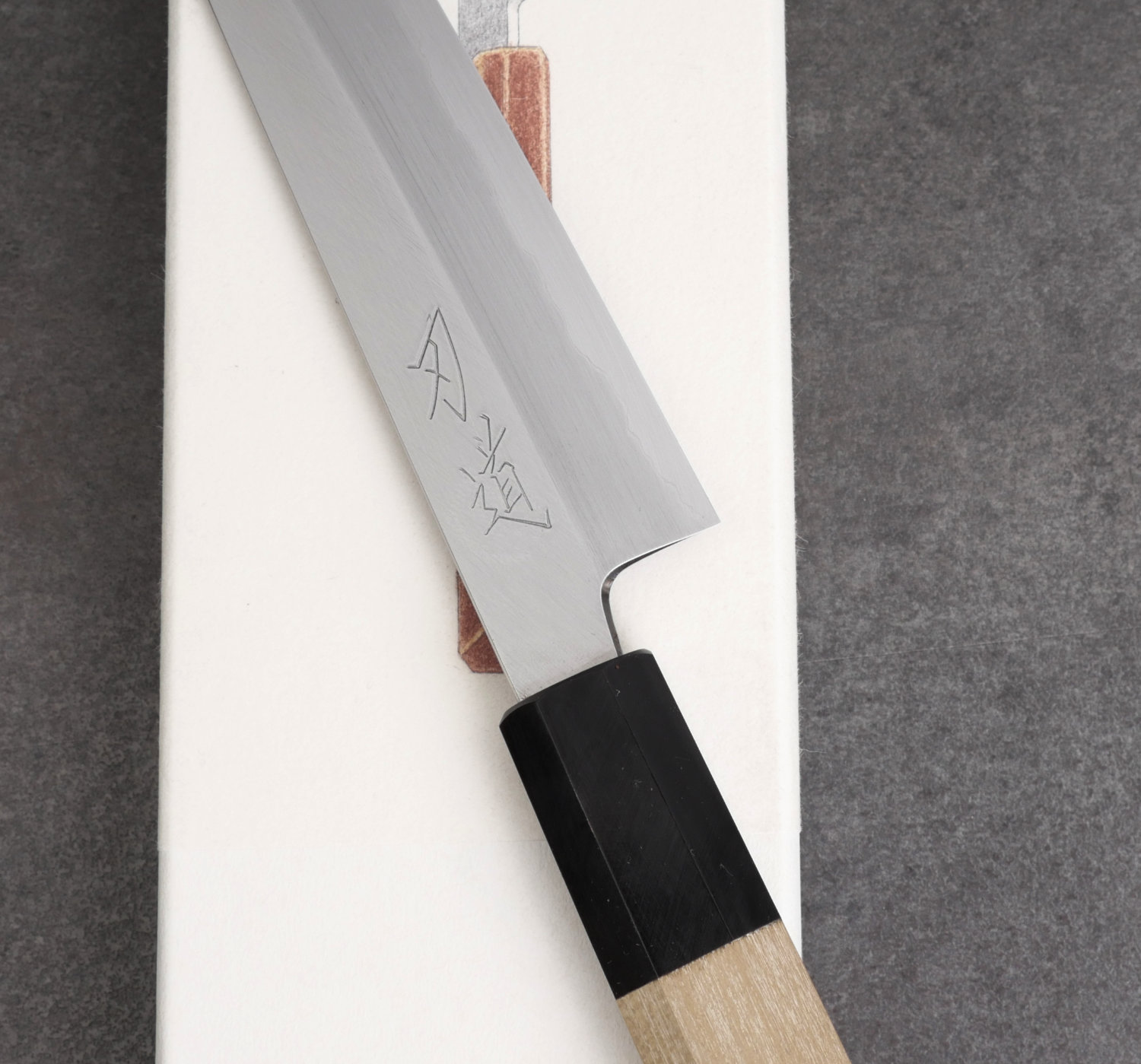 Bladet har en kärna av Shirogami #1 kolstål härdat till 62 HRC, klädd i rostfritt stål som skyddar kärnan och förenklar underhåll. Slipningen är tunn och jämn med dubbel fas. Migaki-finish med polerad rygg och blad ger låg friktion och god kontroll i skäret. Kniven är tillverkad i Sakai av HADO, med fokus på konsekvent värmebehandling och hög slipkvalitet. Skaftet är åttakantigt i magnoliaträ enligt klassisk japansk wa-design.