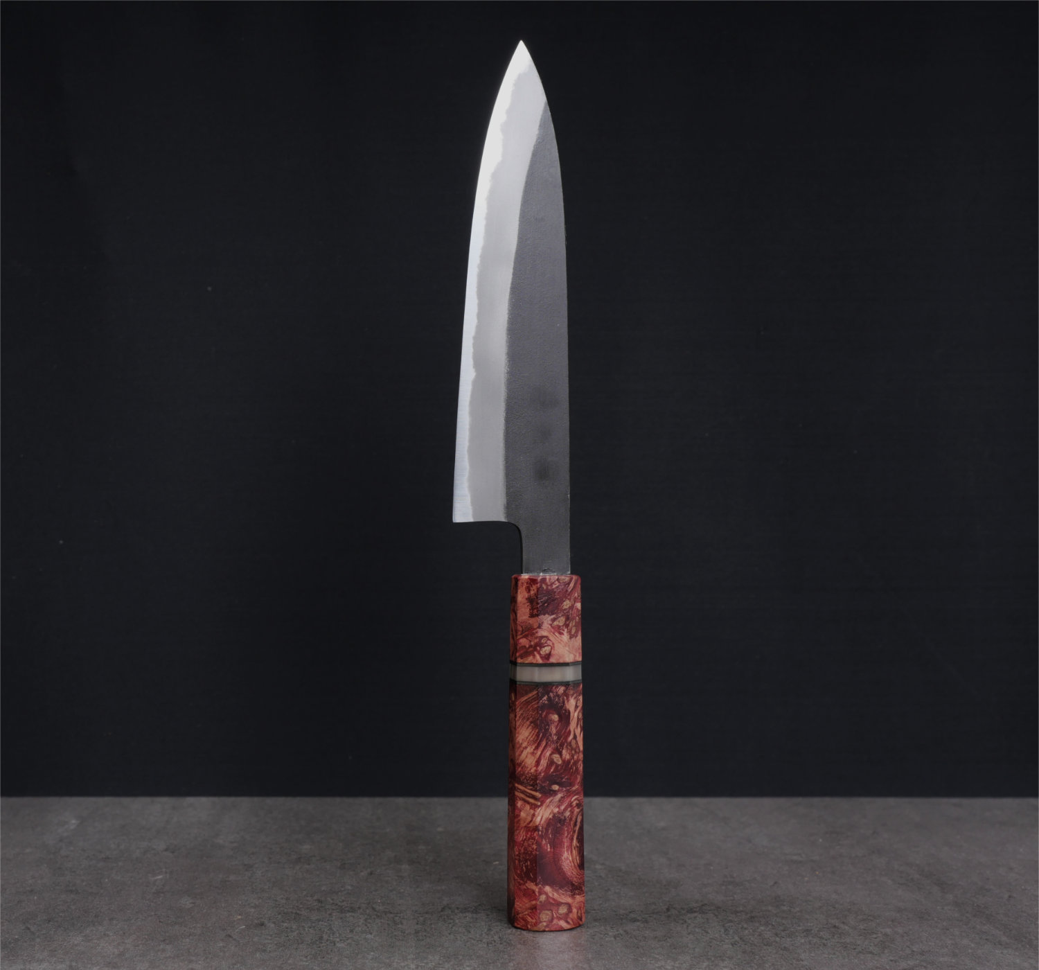 Allkniv, kallas petty i Japan, med 155 mm långt blad och ett vackert skaft i stabiliserad lönn med en spacer i buffelhorn.