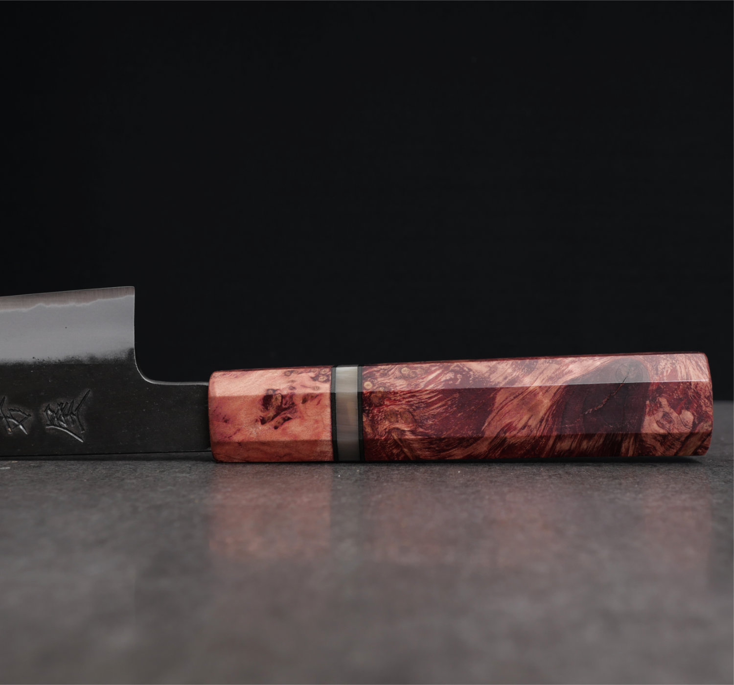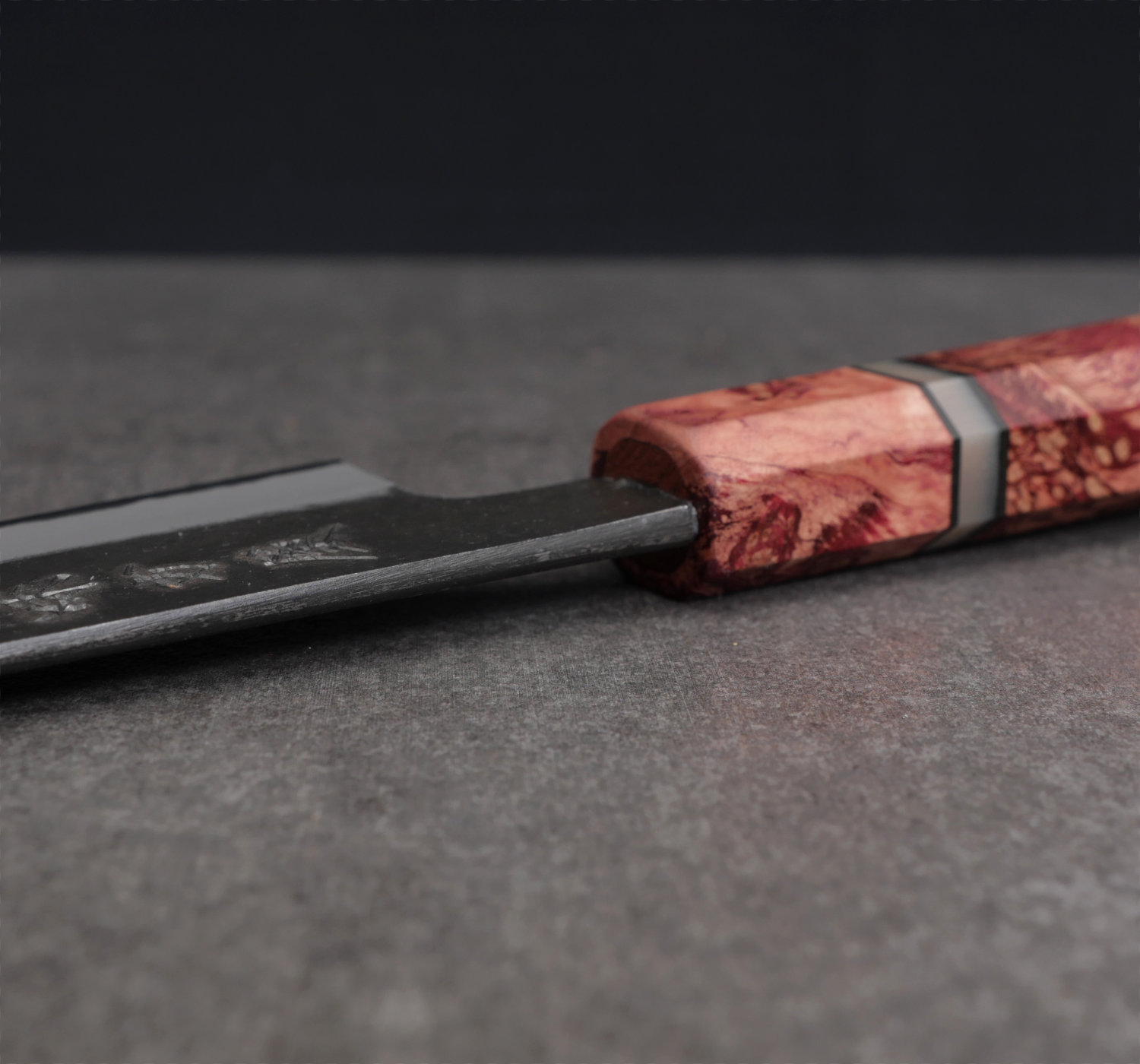 Som avslutning har den tunna och fina eggen försetts med en mycket vacker kasumifinish. Kasumi är en dimmig och silkeslen finish som förhöjer kontrasten mellan det blanka kärnstålet och det utanpåliggande mjukare lagret. Det är få knivar som levereras med så vacker finish på bladet.