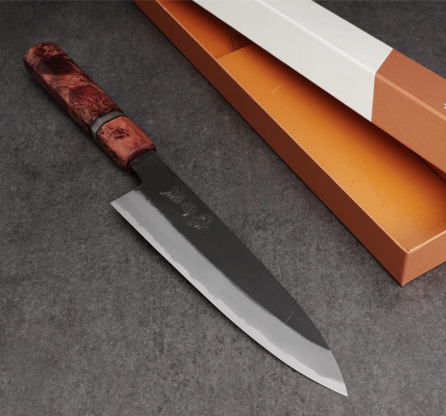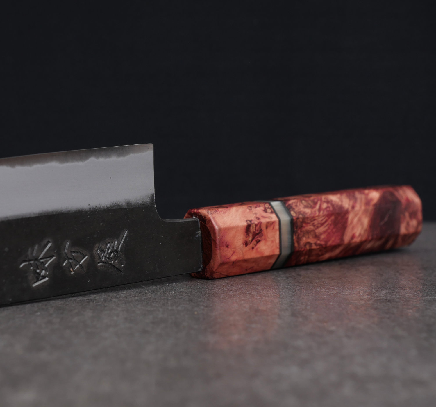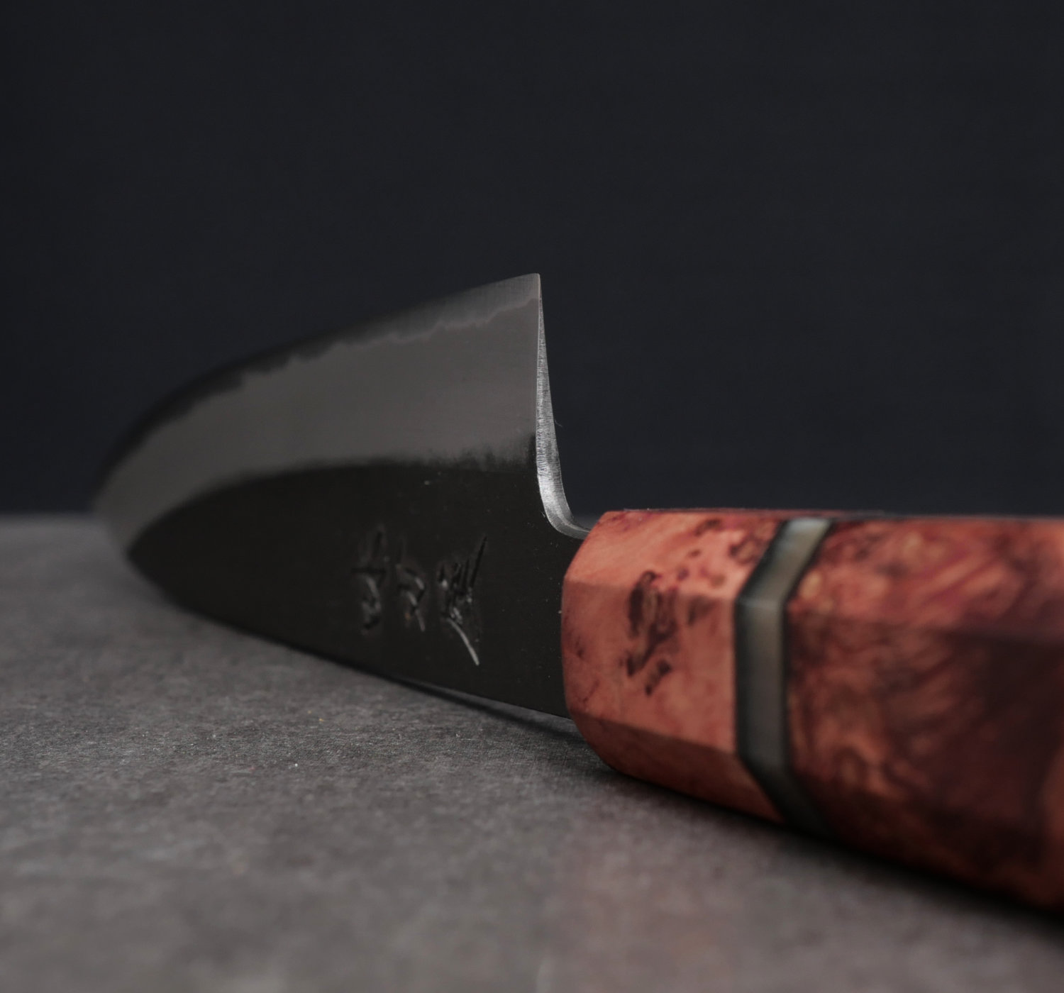 Kniven har en kärna av kolstål och en kappa av järn med svart kurouchi finish