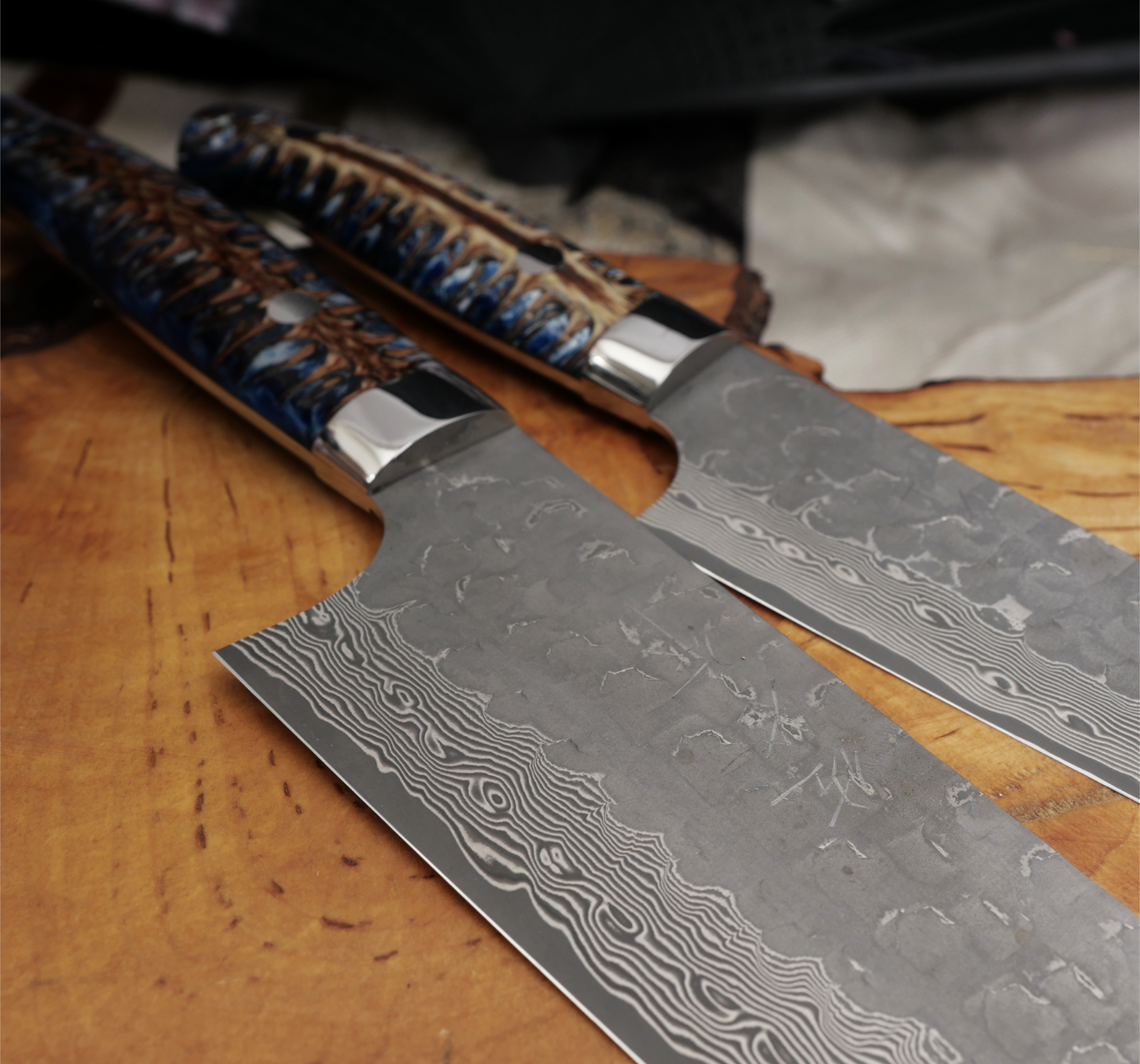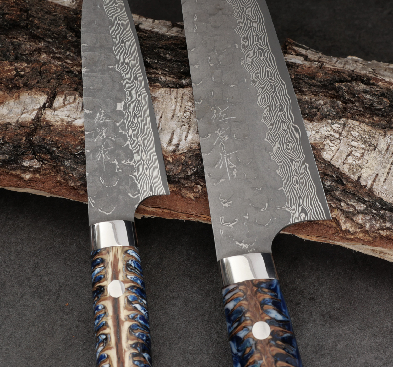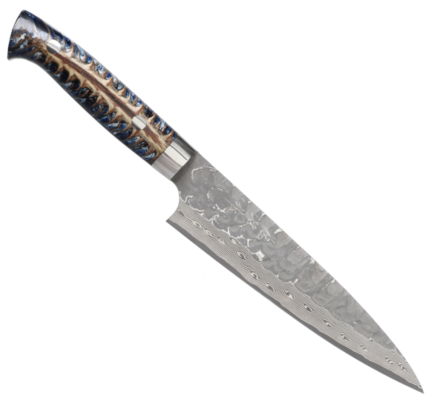 En lyxigt vacker kniv med enastående formgivning. Bladets lager av nickeldamask har mycket fin kontrast mot den grå kappan. skaftet tillverkas av stabiliserad kotte. Det här är en riktigt vacker och lyxig kniv som smids för hand av smeden Takeshi Saji. Han arbetar i den japanska staden Takefu och Saji bär sedan länge den aktade titeln 'Dento Kogeishi', en titel som delas ut av den japanska staten till landets skickligaste hantverkare.