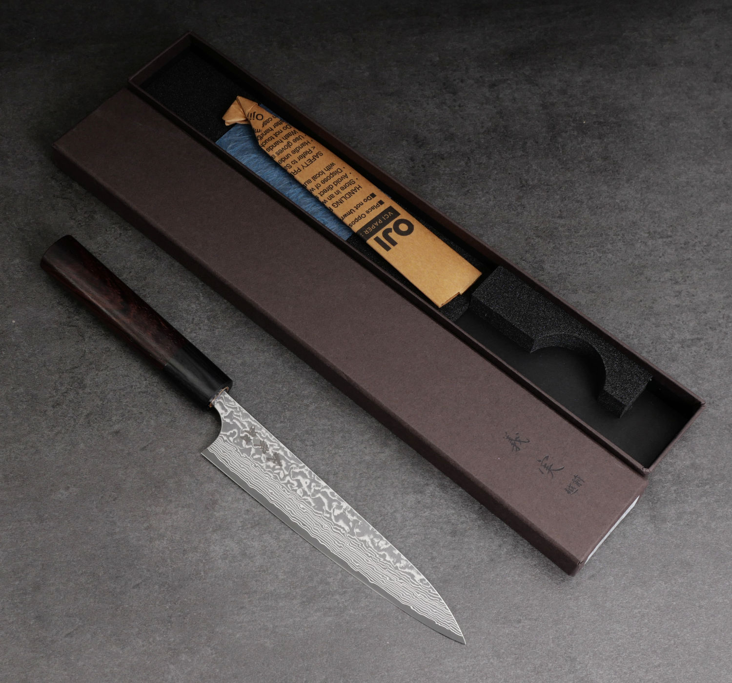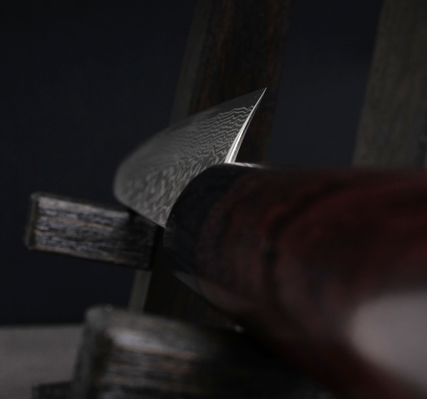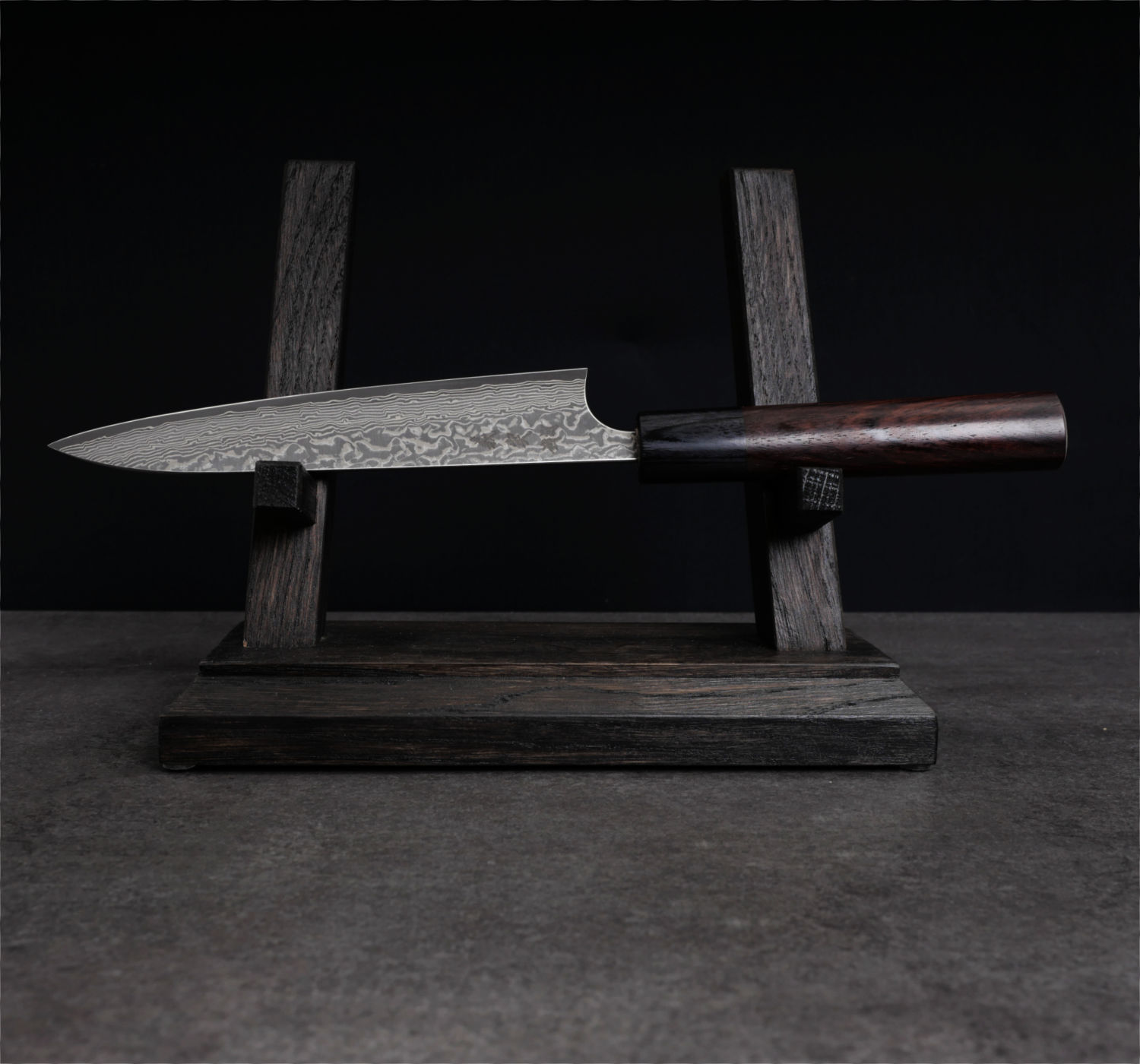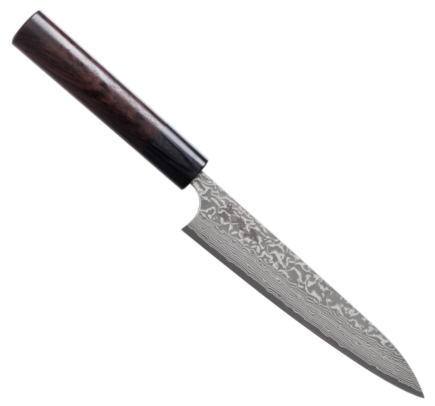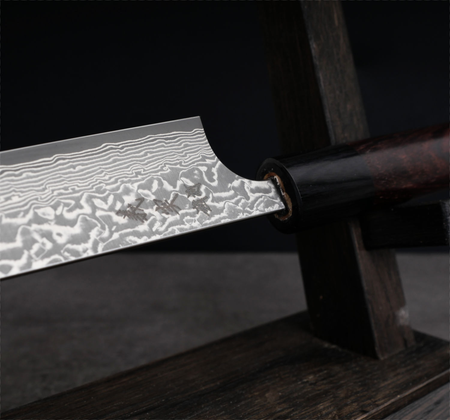 Yoshimi Kato är en mycket talangfull smed från staden Takefu i Japan. I denna vackra knivserie kombinerar han ett kärnstål av VG-10 med en kappa av nickeldamaskus. resultatet blir en kontrastrik blandning av blankt och mörkt, något som ger ett minst sagt spektakulärt intryck. Kniven ligger perfekt i handen och det tunna bladet går att slipa vasst som ett rakblad.