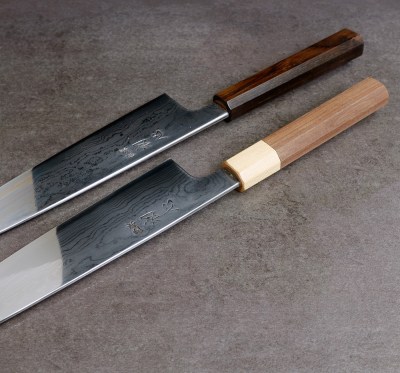 Stål: Aogami#1 med damaskusstål som kappa. HRC 63-64 (EJ rostfritt)