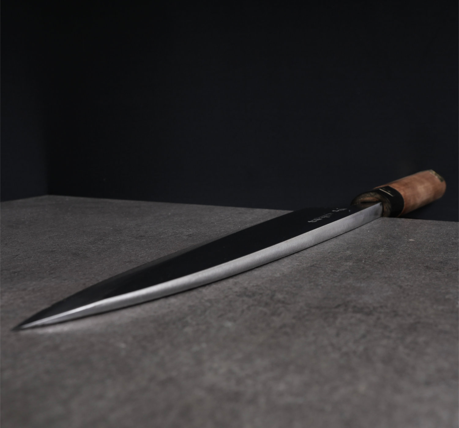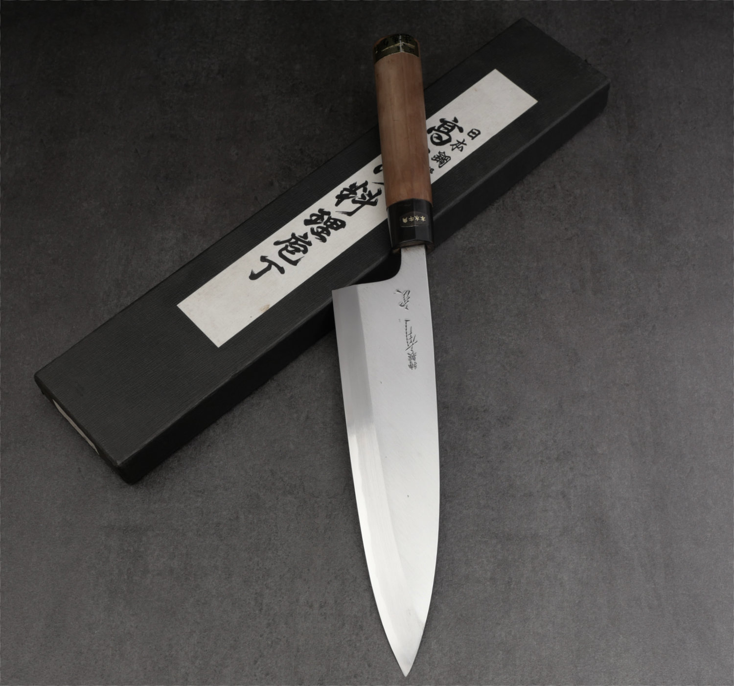 En mycket ovanlig deba med hela 230 mm bladlängd. Kniven är helt ny i kartong och har aldrig tagits i bruk. Vi har fått ta över kniven efter att den legat orörd hos en distributör i 30 år! Bladet är mycket välsmitt vilket märks på hur plan uran är, trots det enorma bladet.