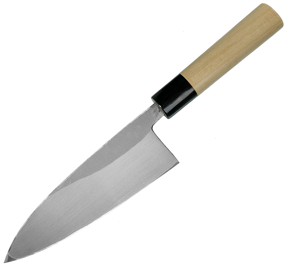 Kniven smids helt för hand i kolstålet shirogami#2. Eggen är enkelslipad (högerslipad) och kniven har en kraftig rygg för att ge rätt slipfas. Skaftet tillverkas av ho-trä med bolster i svart buffelhorn