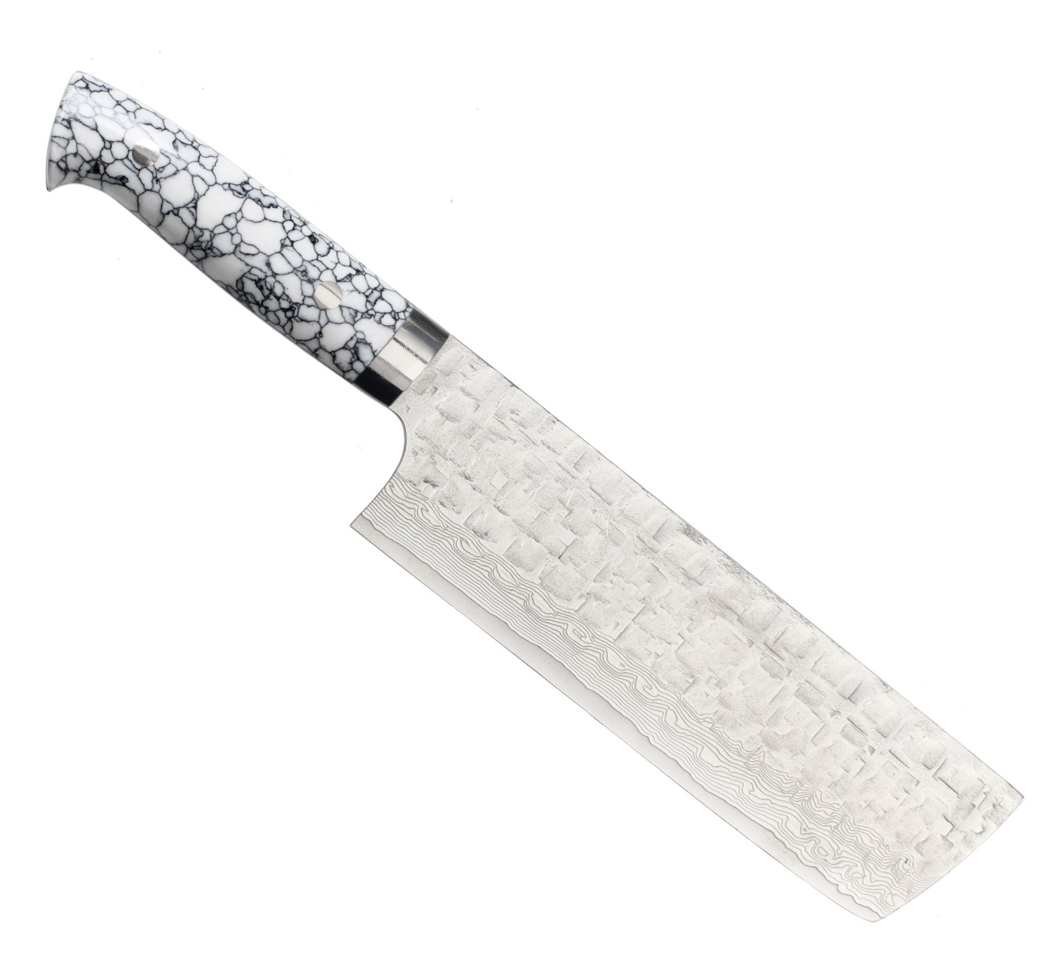 Ett vackert mästerverk från mästaren Takeshi Saji - Nakiri med 16,5 cm lång skäregg. Bladet är högblank med vackert damaskusstål med hammarbankad finish.