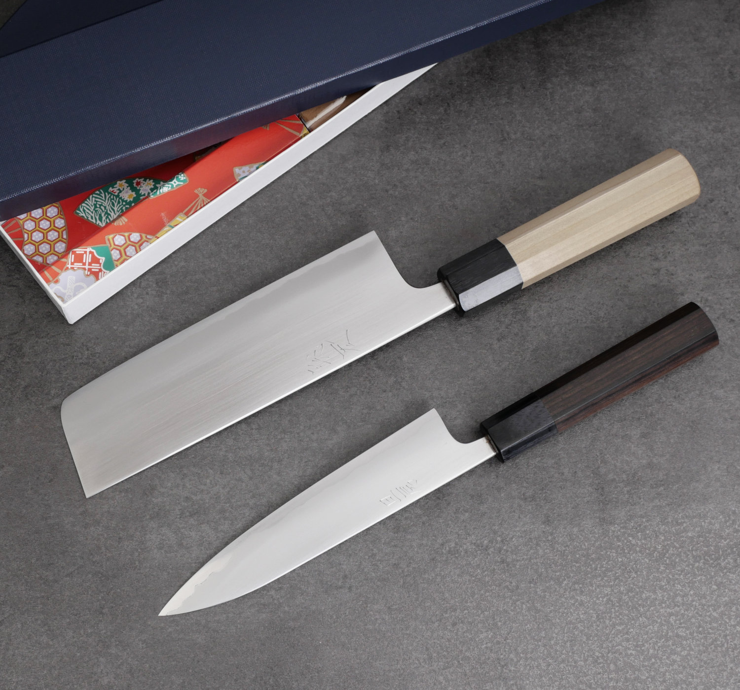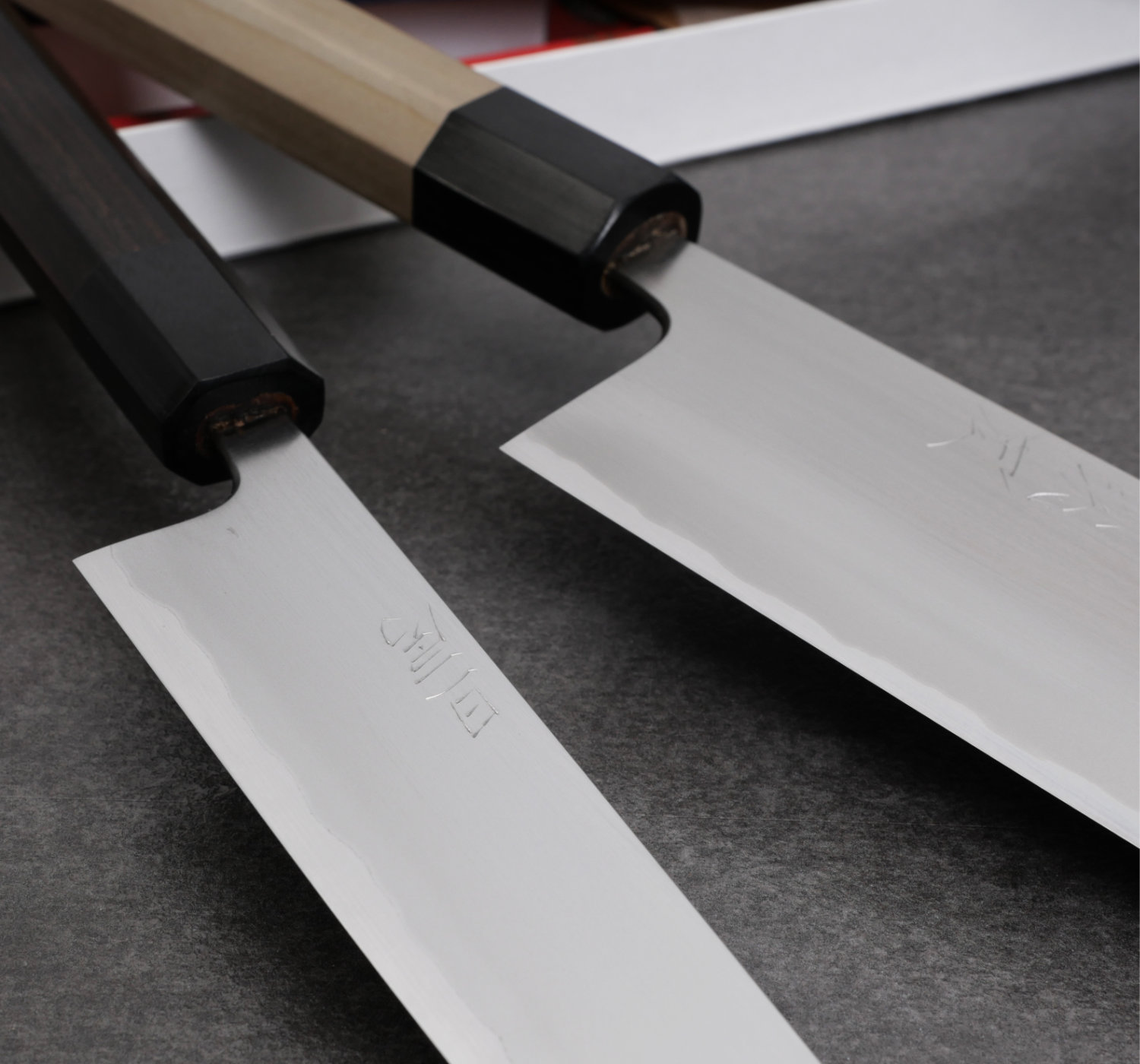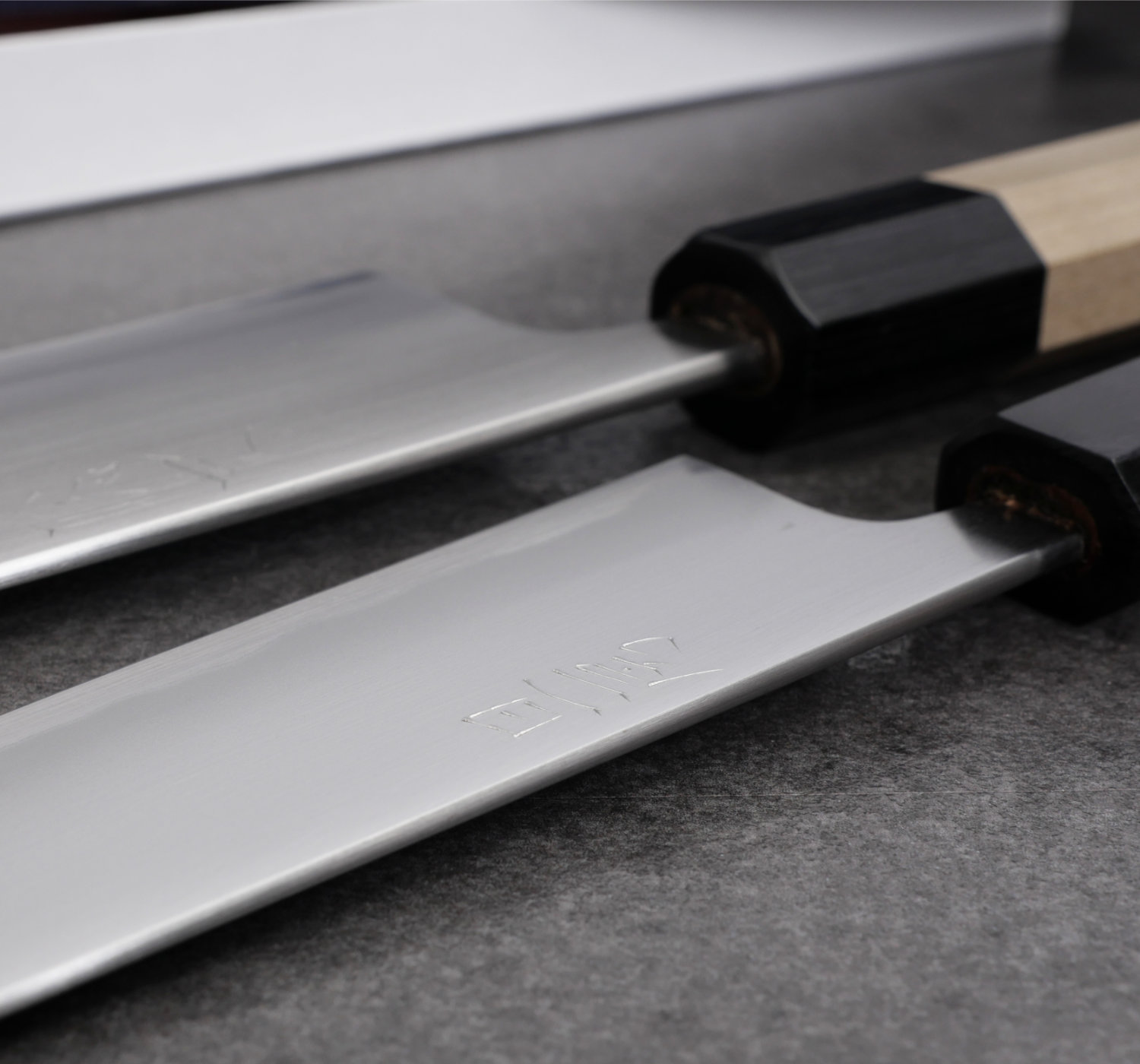 Obs: Shirogami#2 är ett kolstål som inte är rostfritt. Även om bladet är laminerat med rostfritt stål är eggen blottlagd. Se därför till att torka bladet efter användning. Var även försiktig när du använder kniven eftersom den tunna och mycket hårda eggen lätt kan ta skada om du hackar i hårdare partiklar.