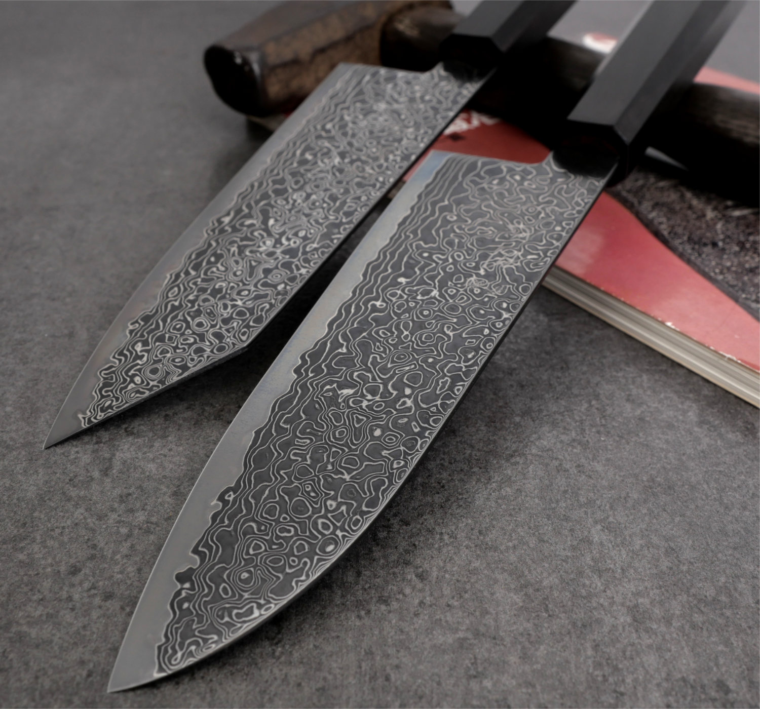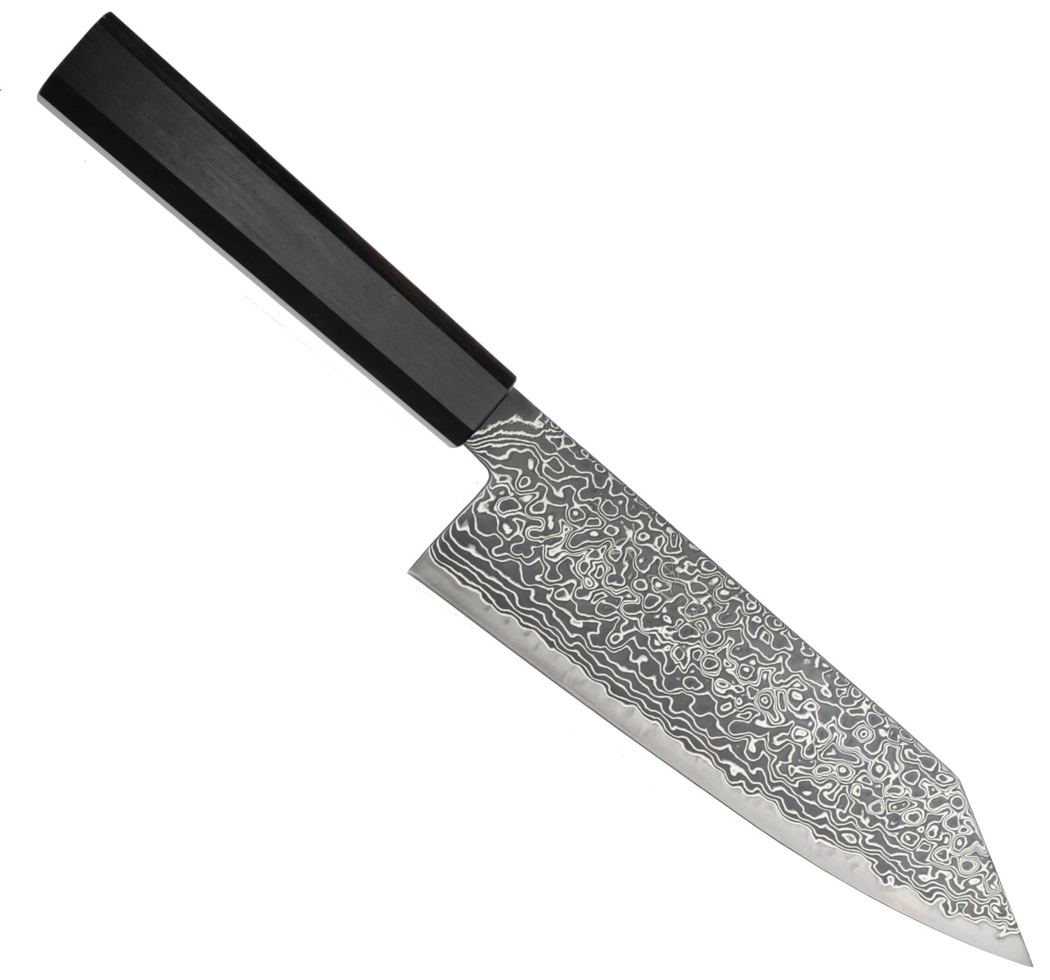 Ryuhyo från Hatsukokoro är en mycket spektakulär kniv i det rostfria toppstålet SG-2 pulverstål. Runt kärnstålet ligger en kappa av mörketsad nickel-damask med otroliga kontraster. Eggen är tunn och kniven skär som ett rakblad. Det är en högpresterande 'laser' som är bedårande vacker att se på. Skaftet tillverkas i ebenholts.