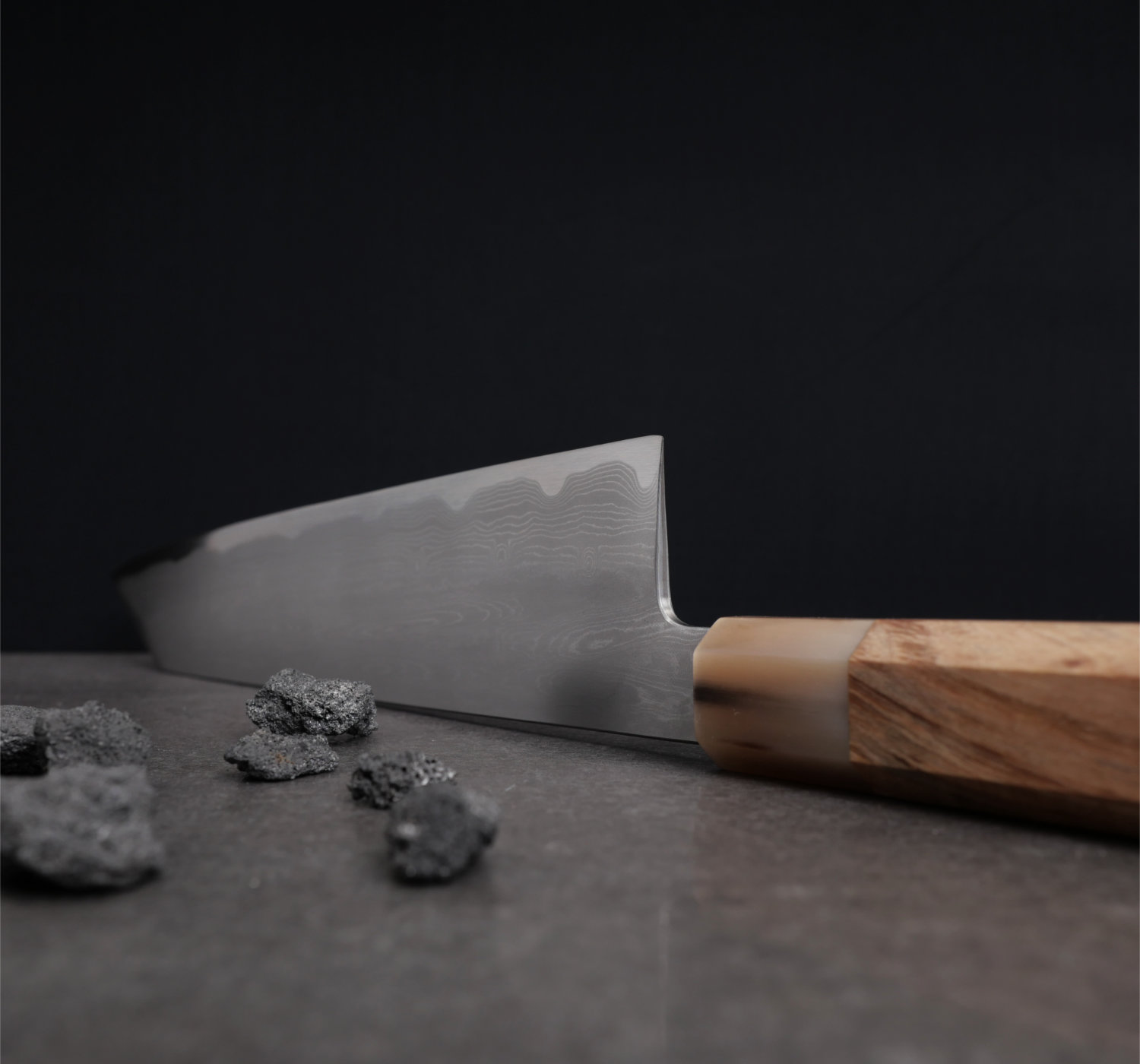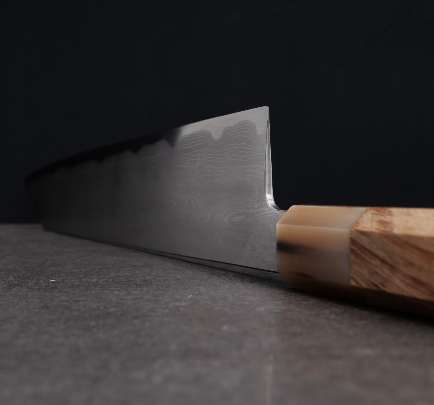 En unik kniv, smidd och värmebehandlad av Satoshi Nakagawa. Kniven har levererats till oss som en 'blank', dvs att formen är satt, men helt utan grind eller finish. Vår gode vän och kollega i branschen, Erik Mases på Shinogi Sliperi i Stockholm, har lagt ner mycket tid på att ge detta mästerverk en grind och profil den verkligen förtjänar! När bladet färdigställts monterade vi det finaste skaftet vi kunde hitta; quince wood med ett bolster i blont buffelhorn.