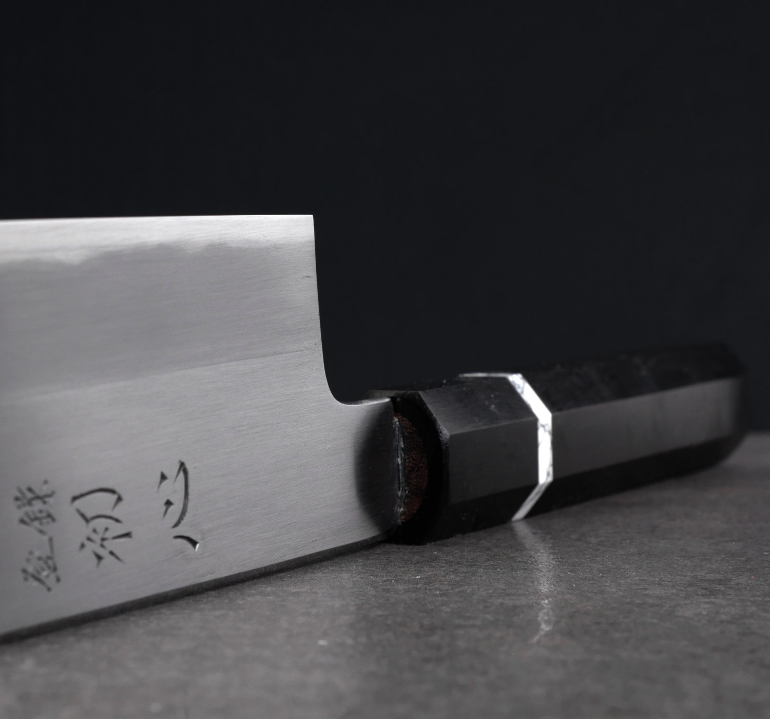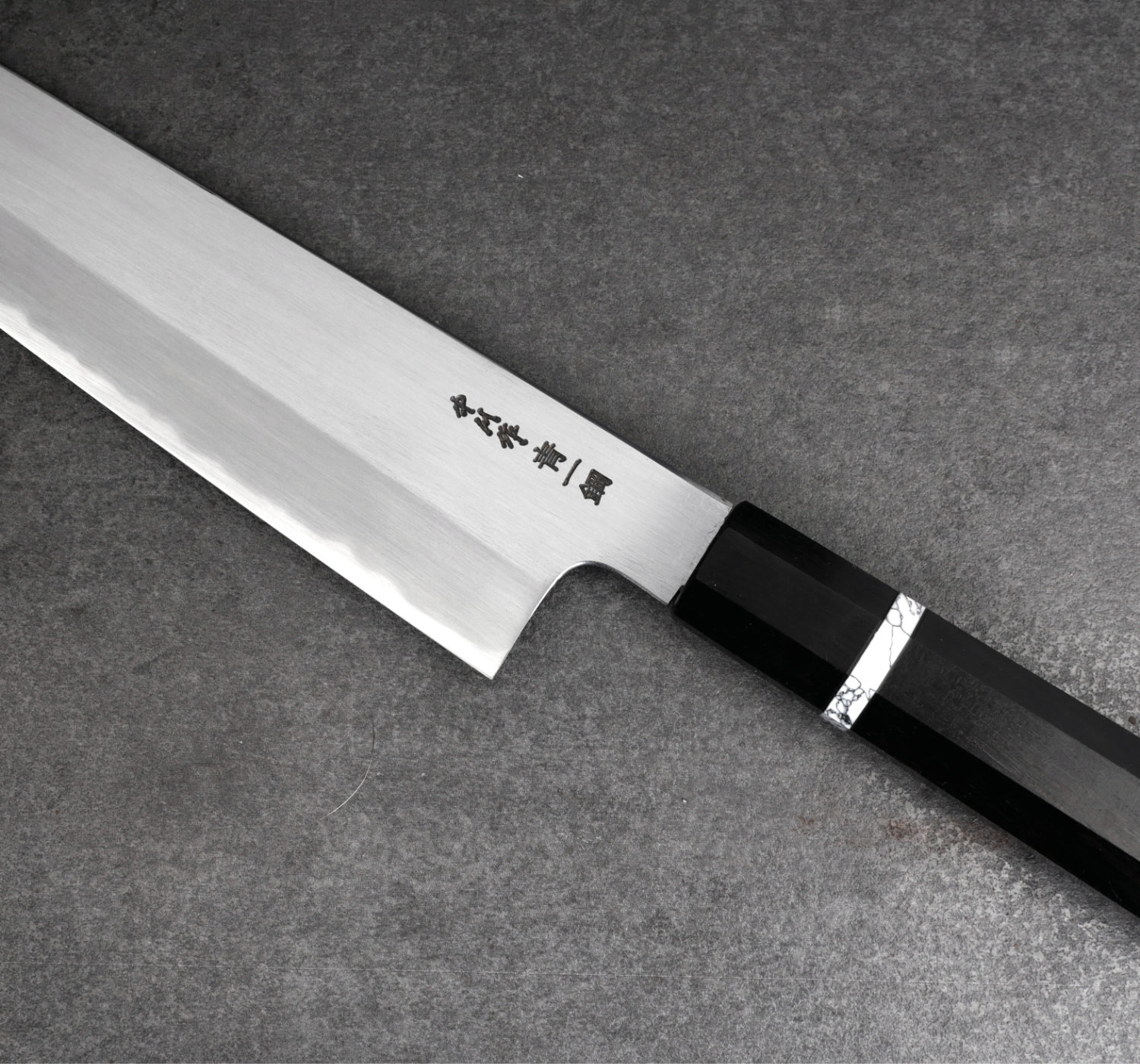 Kiritsuke med 212 mm långt blad (mätt från spets till häl). I denna kniv används kolstålet Aogami#1 som tar en läskigt vass egg.