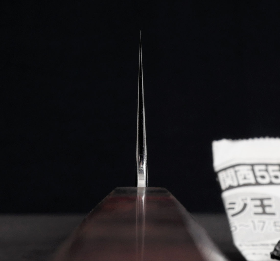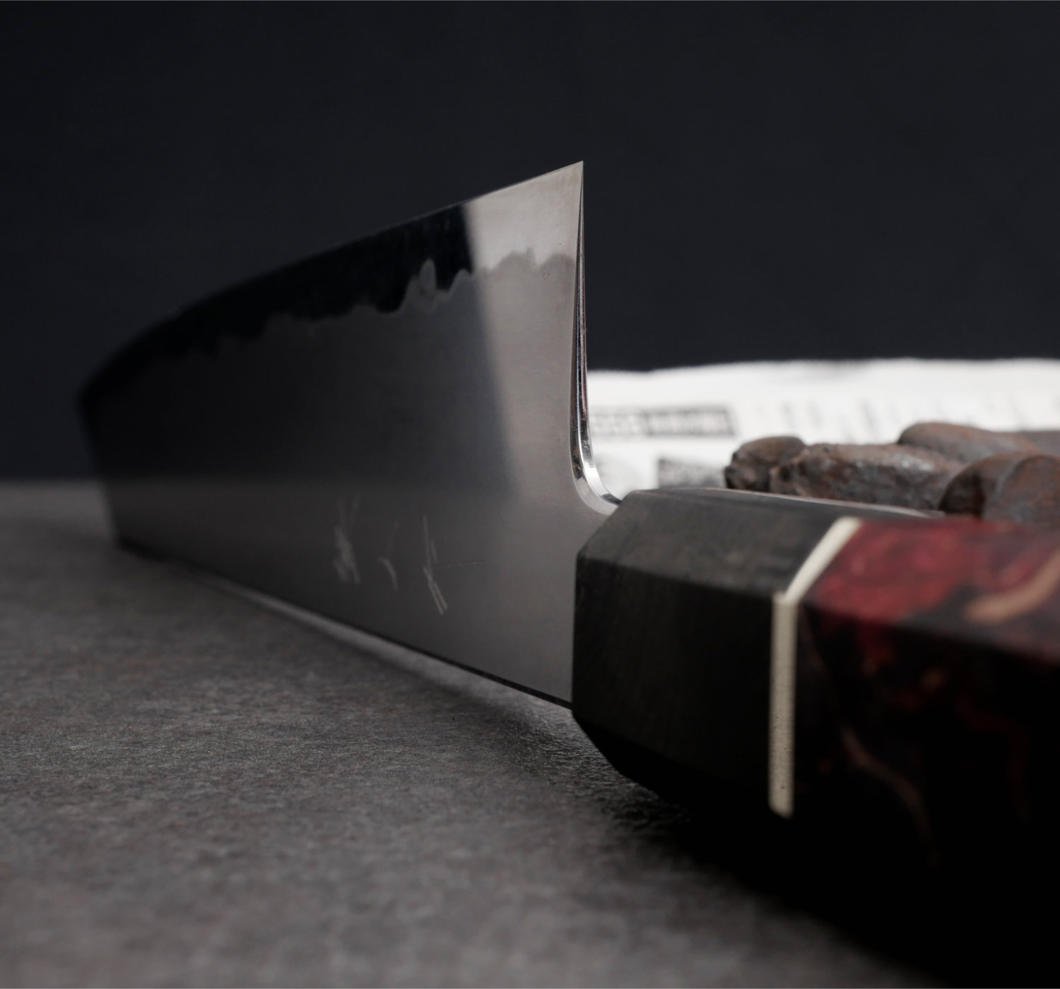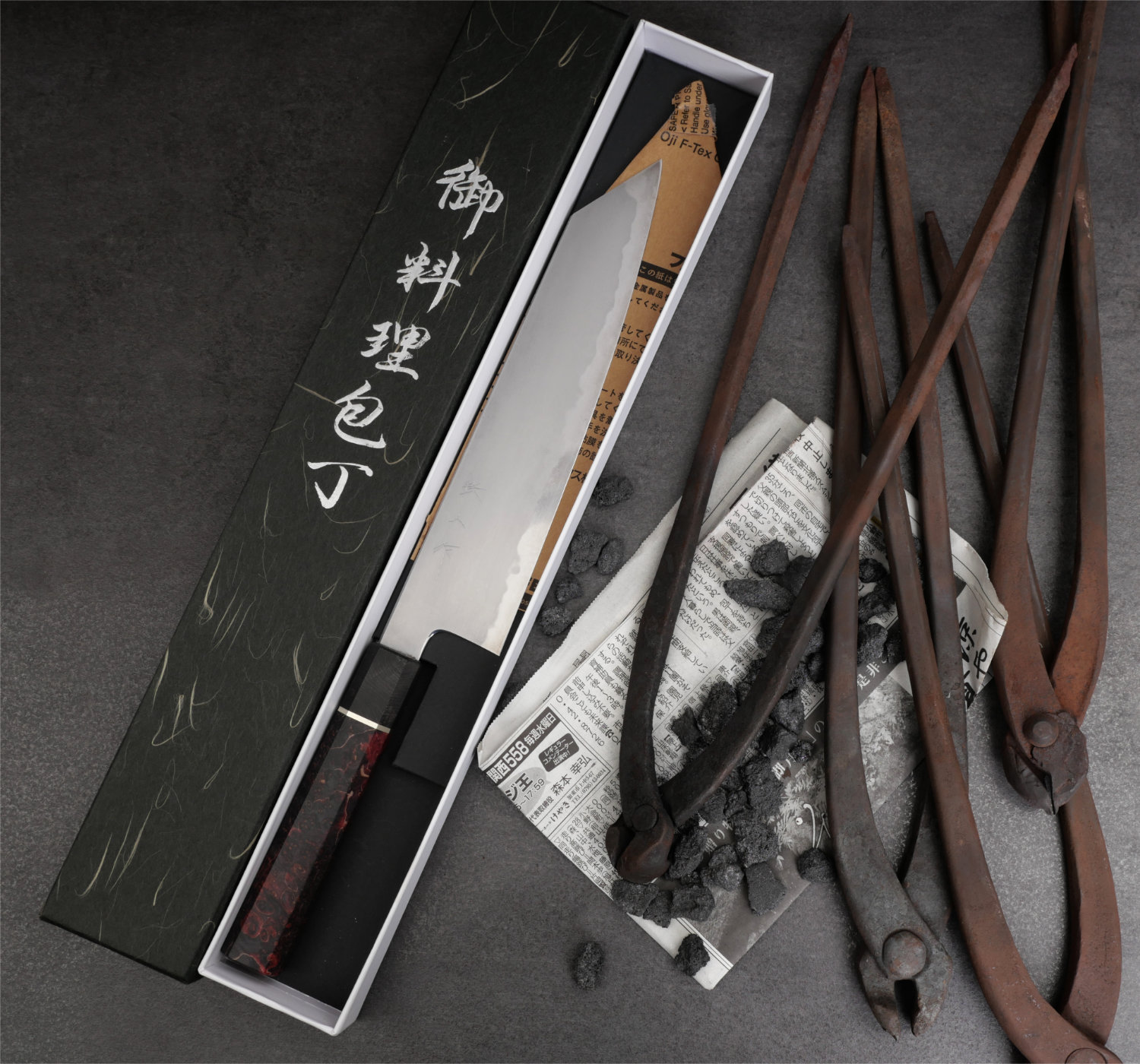 Tillsammans tillverkar dom premiumknivar i kolstålet Aogami #2. Smidet är extremt finkalibrigt i klassisk Sakai-anda. Kniven ligger stabilt i handen och har en lugn gång. Eggen är tunn med lagom egg-flex.