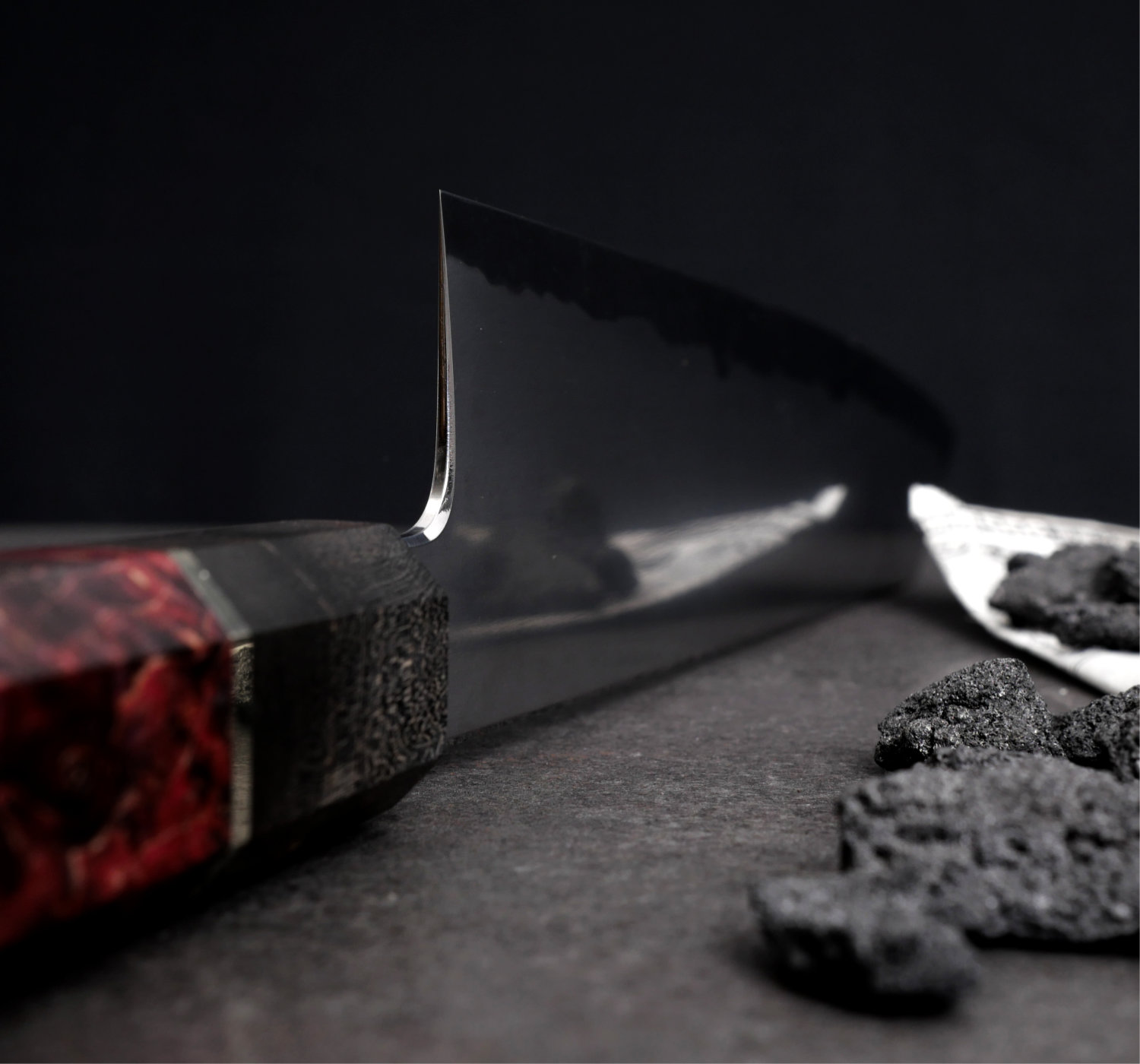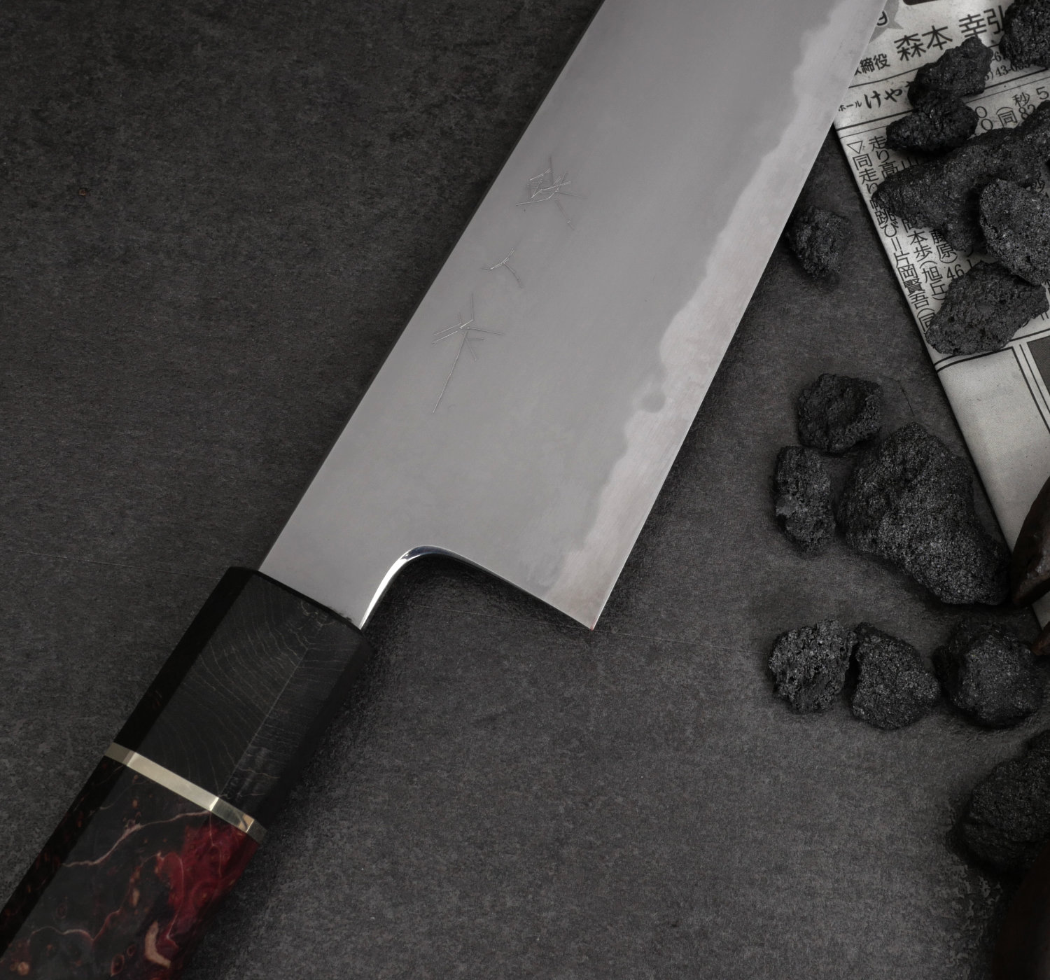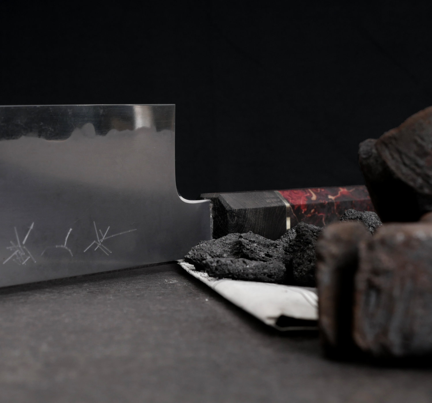 Tillsammans tillverkar dom premiumknivar i kolstålet Aogami #2. Smidet är extremt finkalibrigt i klassisk Sakai-anda. Kniven ligger stabilt i handen och har en lugn gång. Eggen är tunn med lagom egg-flex.