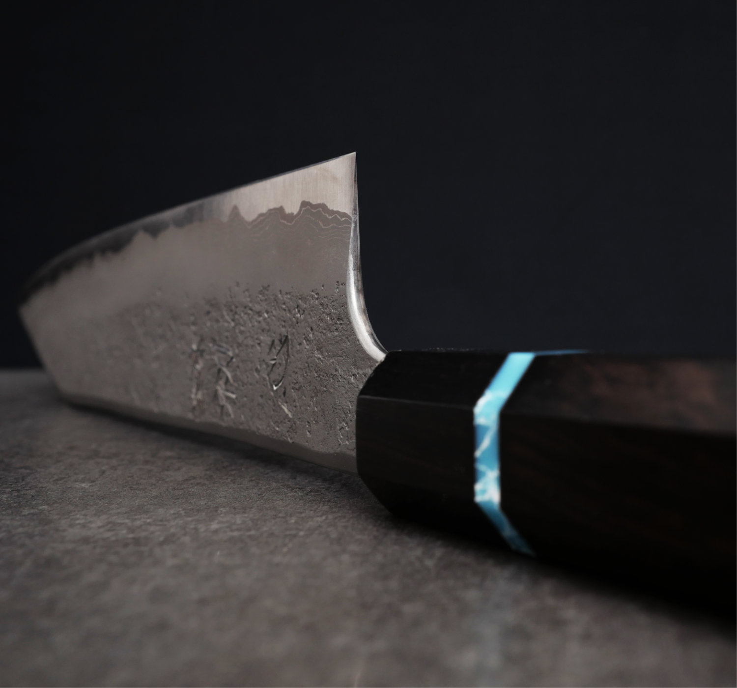 En japansk kiritsuke, kockkniv, med 196 mm långt blad, med kraft, precision och elegans.