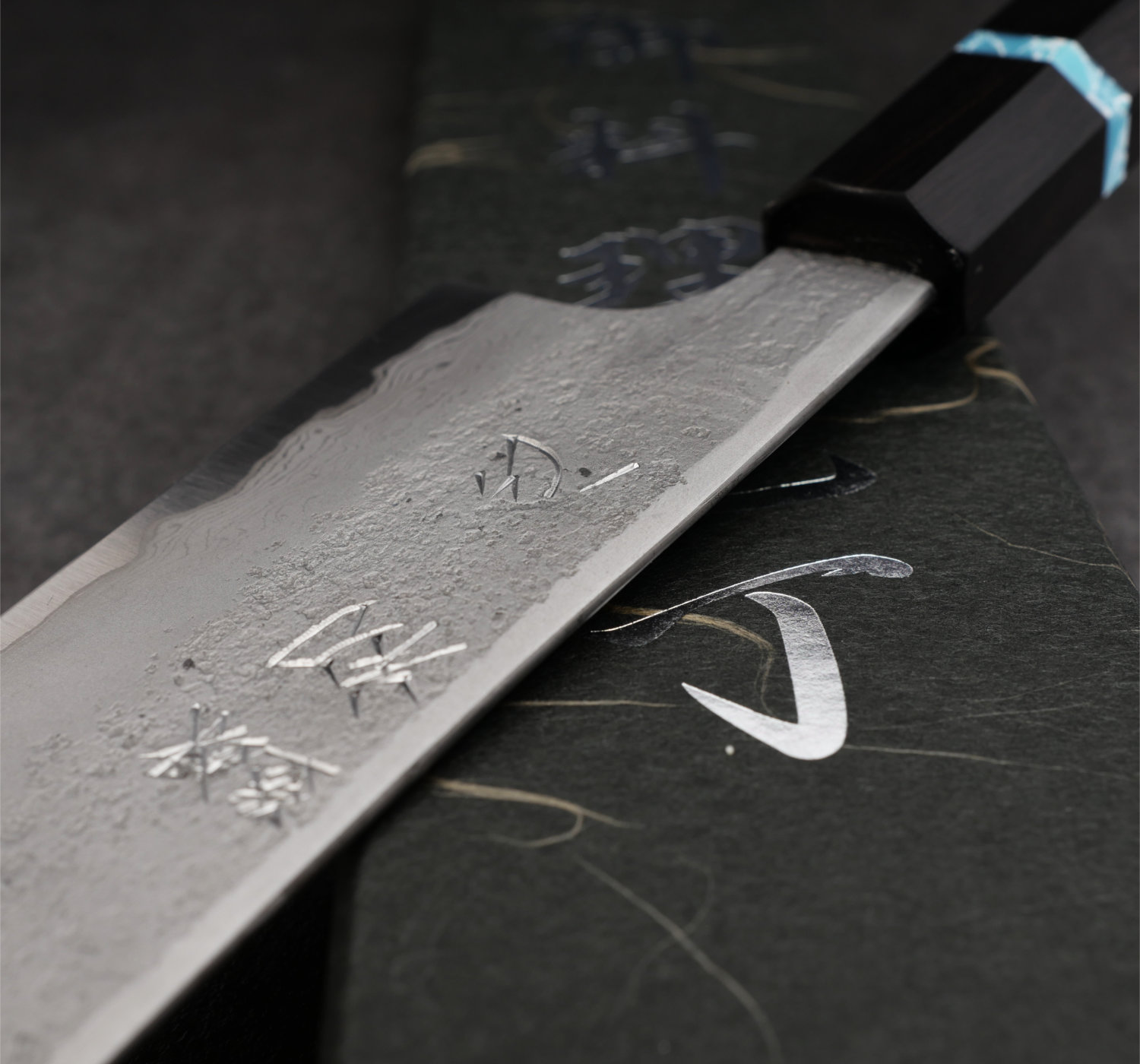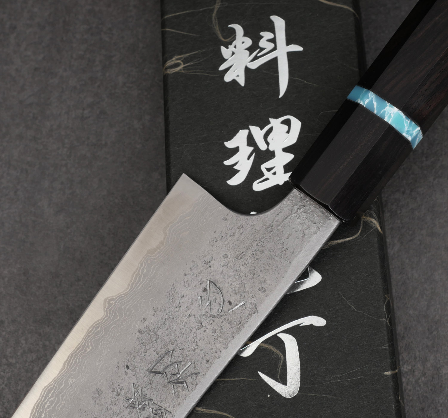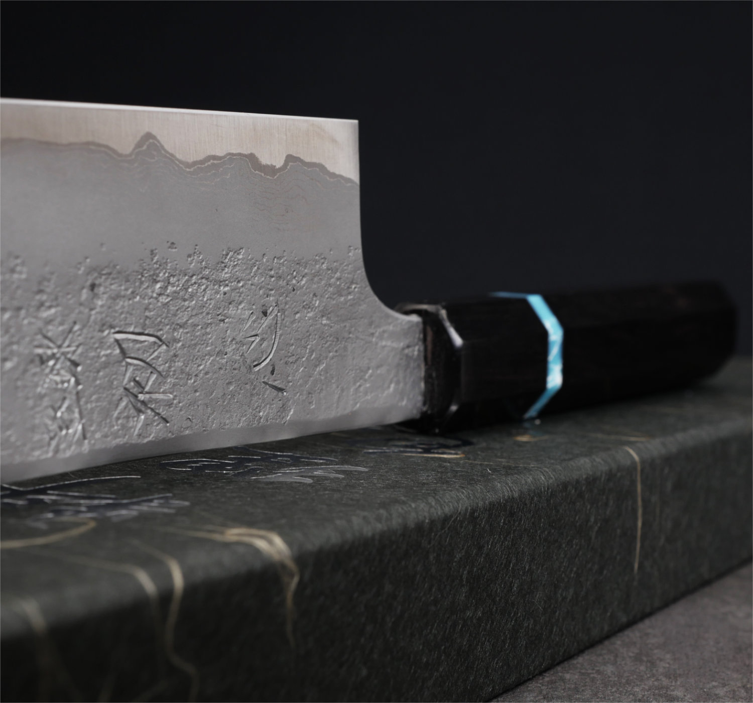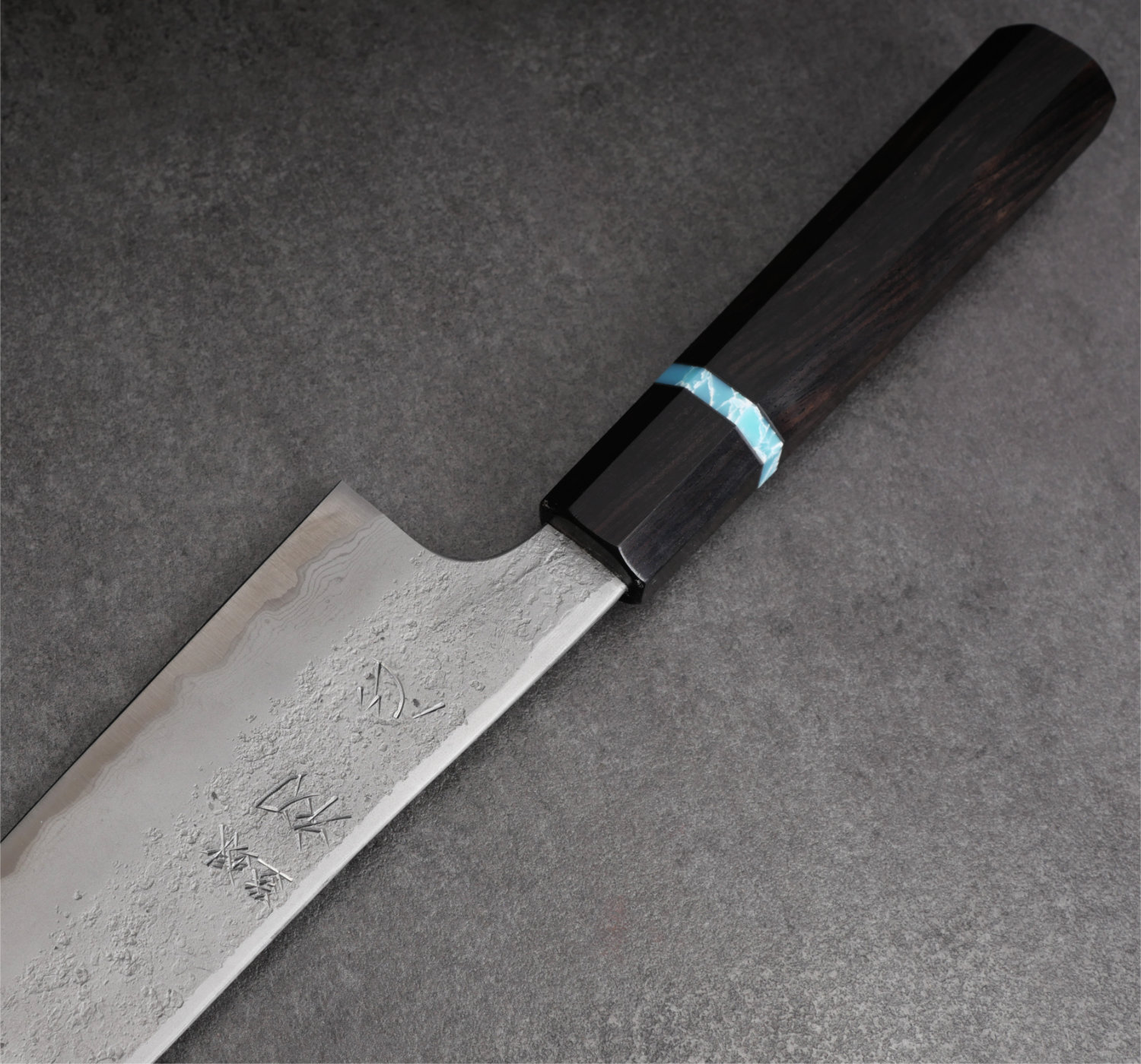 Kärnstål: Aogami #2 (Blue #2). Kolstål med hög skärpa och utmärkt skärpevarighet