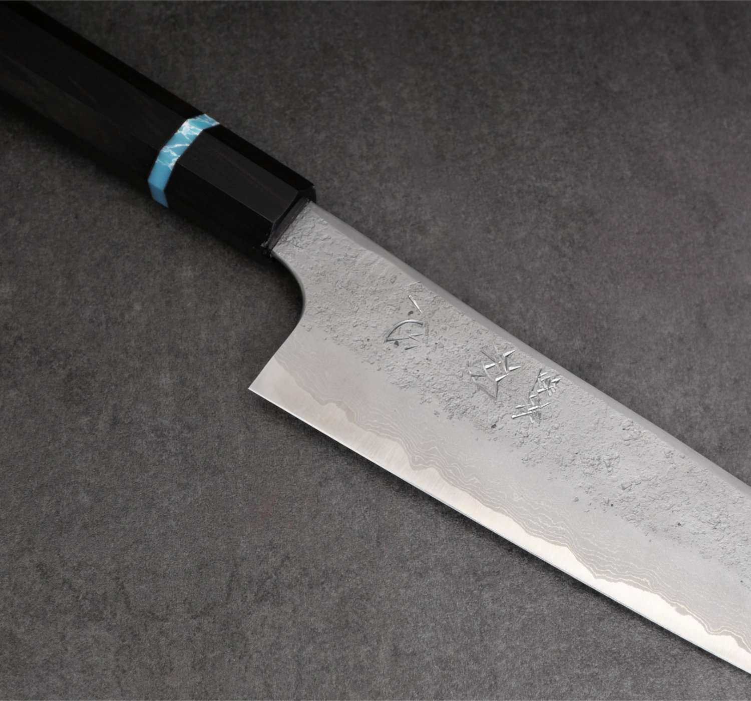 Aogami#2 ger fantastisk balans mellan skärpa, hållbarhet och enkel återskärpning. Ytan i rostfritt damaskusstål skyddar kärnan och gör kniven lättare att skydda från rost och patina. Kärnstålet är dock inte rostfritt så det är viktigt att kniven hålls torr efter användning, särskilt om du skurit i råvaror med hög syra såsom tomat eller citrus.