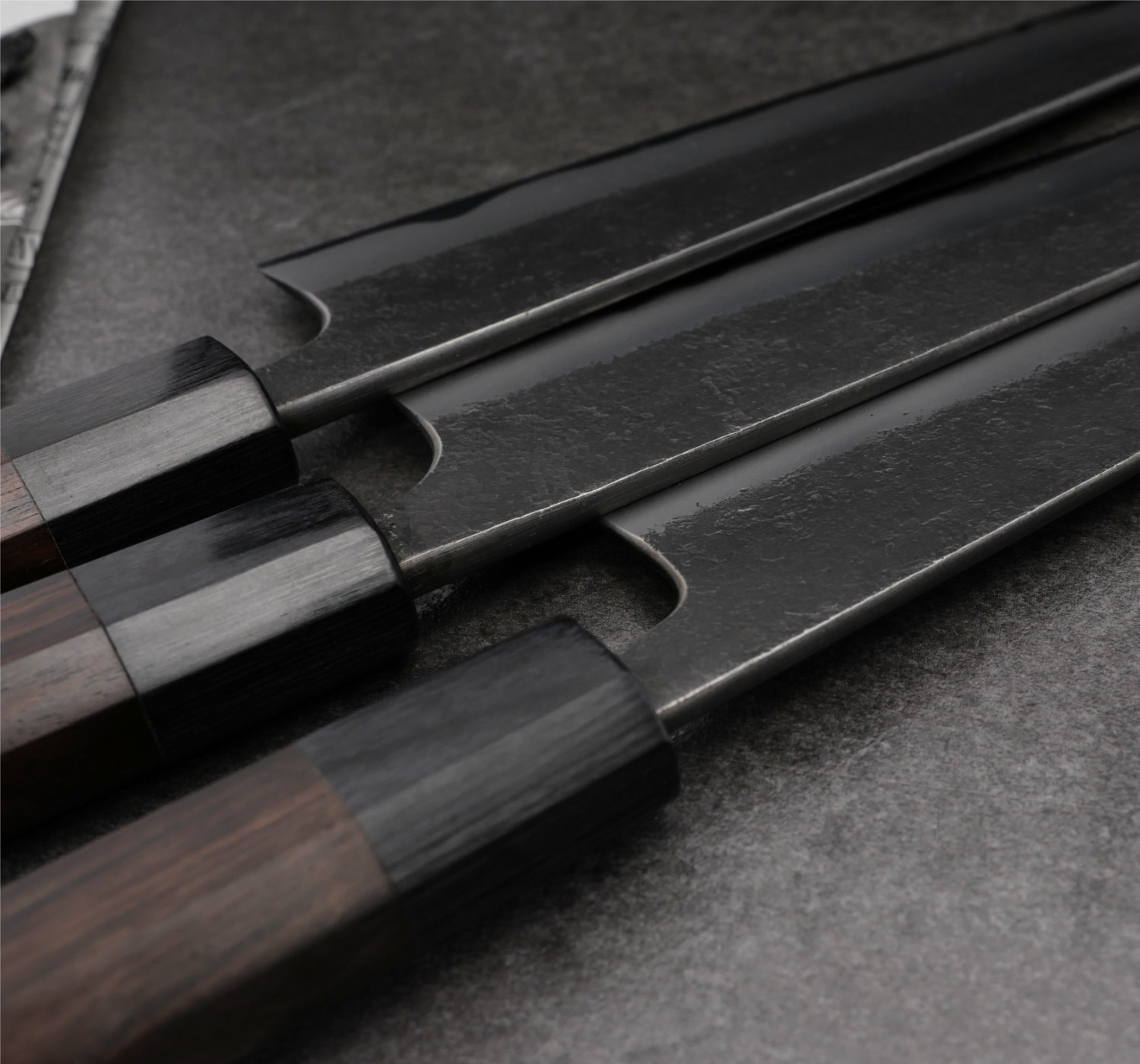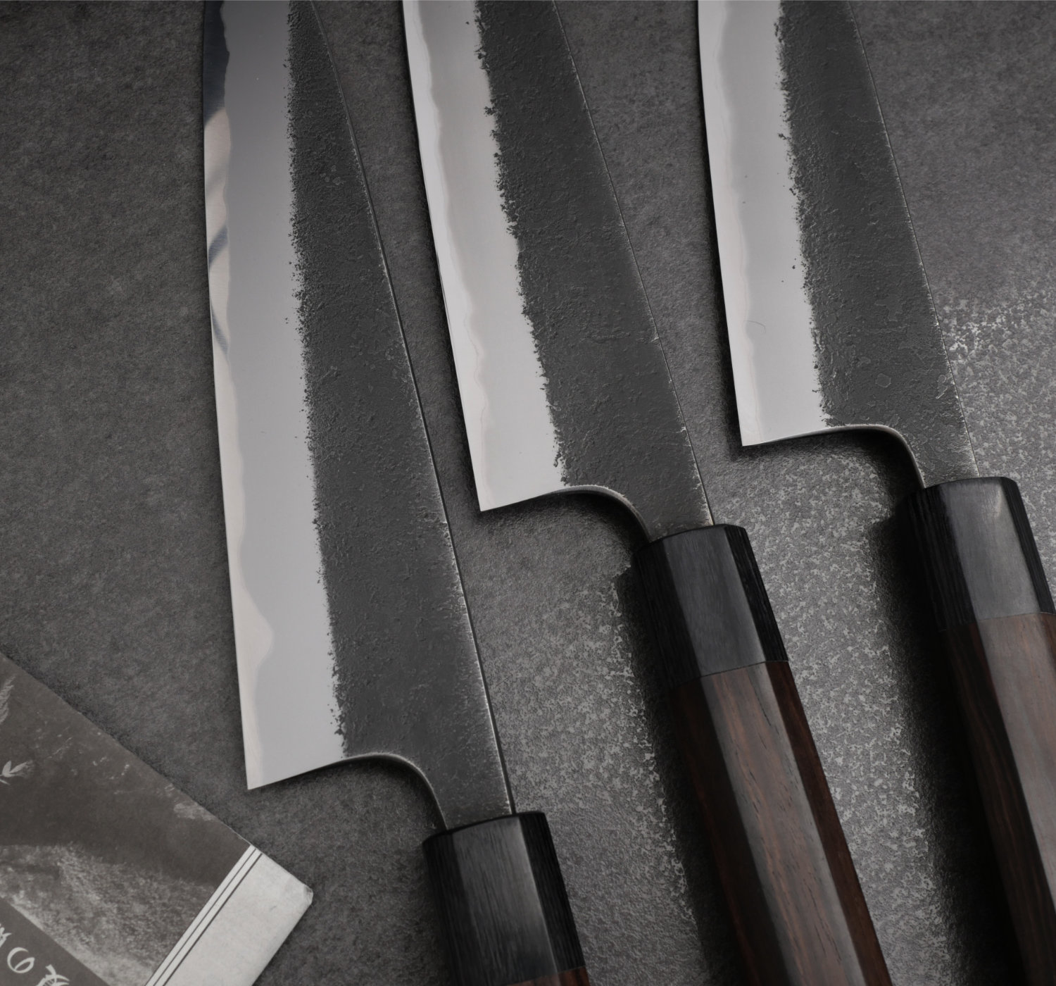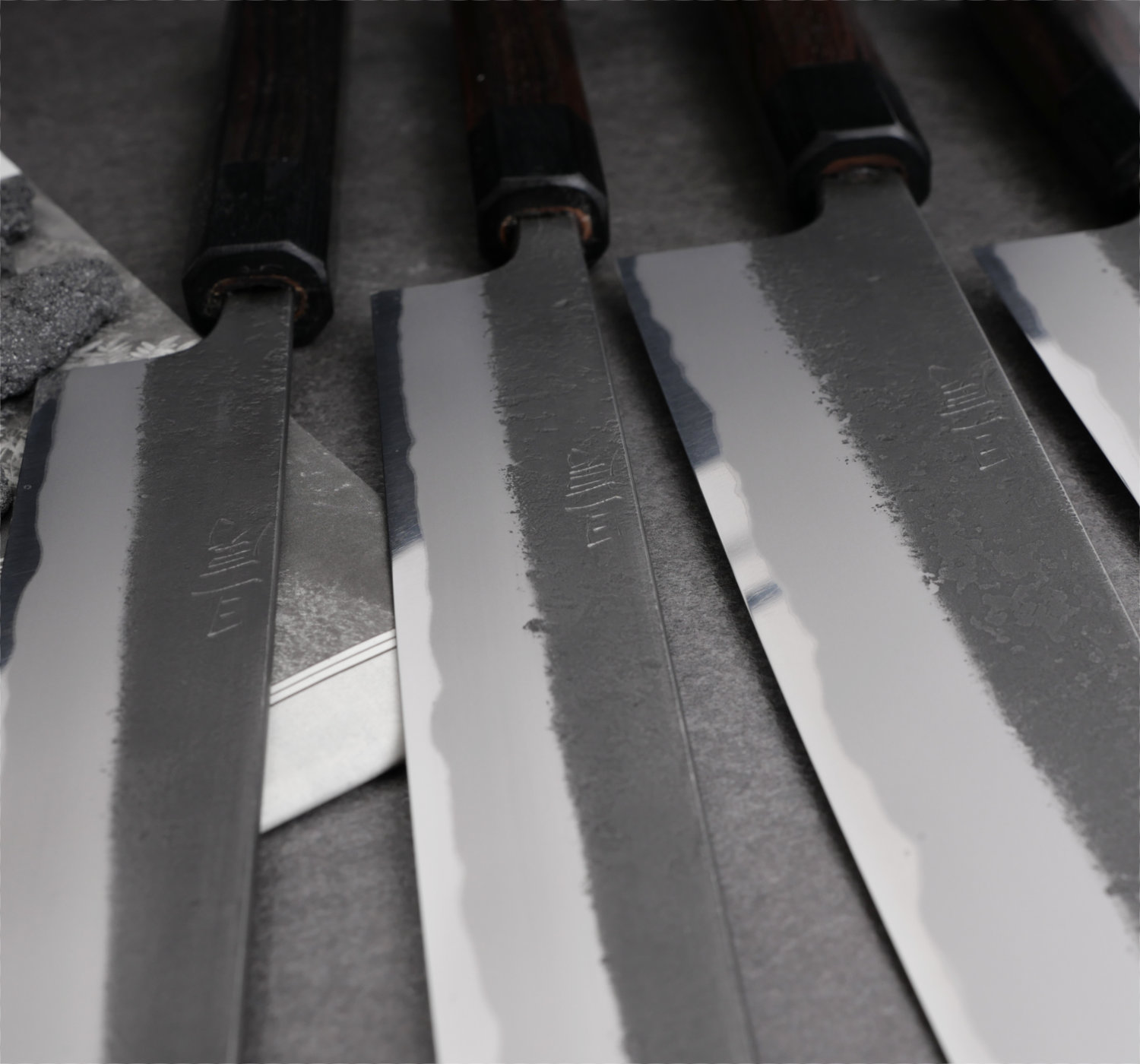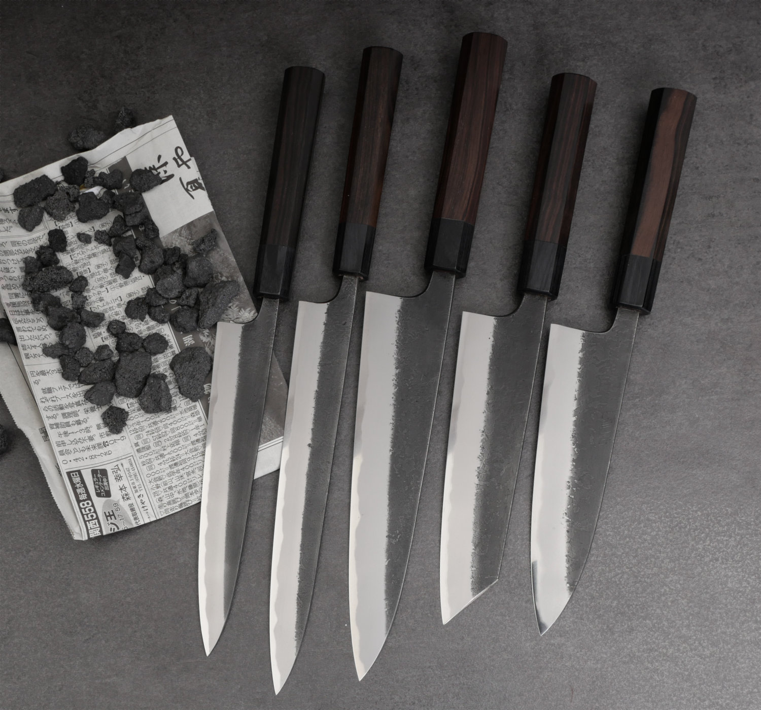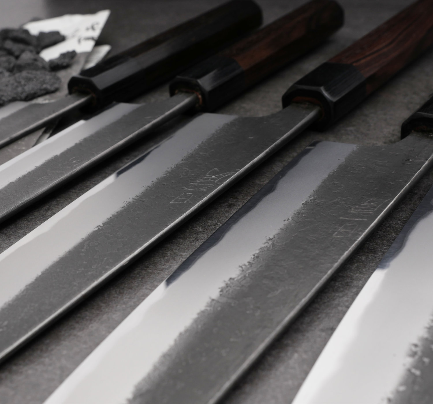 Toshihiro Wakui är mycket talangfull och han tillverkar väldigt välsmidda knivar i kolstål. I denna serie använder han kärnstålet är Aogami#2 som han väller ihop med mjukt järn (warikomi). Det vanliga är att smeder köper in färdiglaminerat stål, men Wakui väller numer samman sitt eget bladmaterial för att få det exakt som han vill. Bladets finish kallas nashiji kurouchi vilket är en grov och svärtad yta. Trots den råa finishen har Wakui rundat av alla kanter och gett bladet mjuka former. Han taperar bladen med stor skicklighet (avsmalning från rygg till spets) och kniven ligger därför väldigt bra i handen. Handtaget är åttakantig i träslaget macassar ebenholts. Det har väldigt fin lyster och bra vikt. Macassar ebenholts är väldigt dyr men till denna serie behöver skaftet ha rätt vikt för att matcha bladets tyngd.