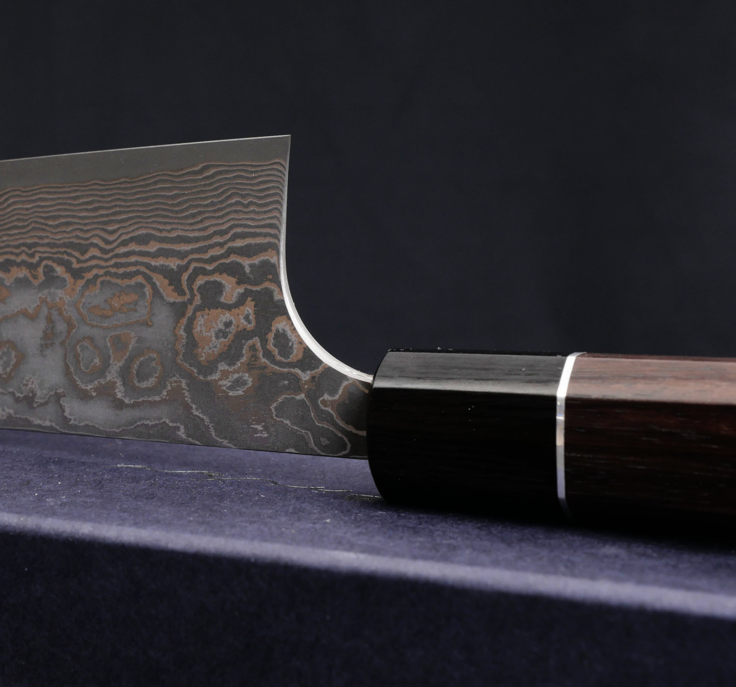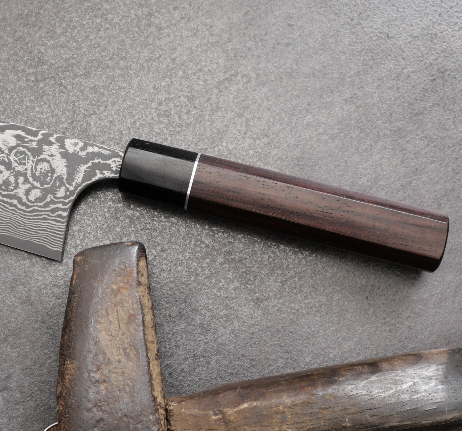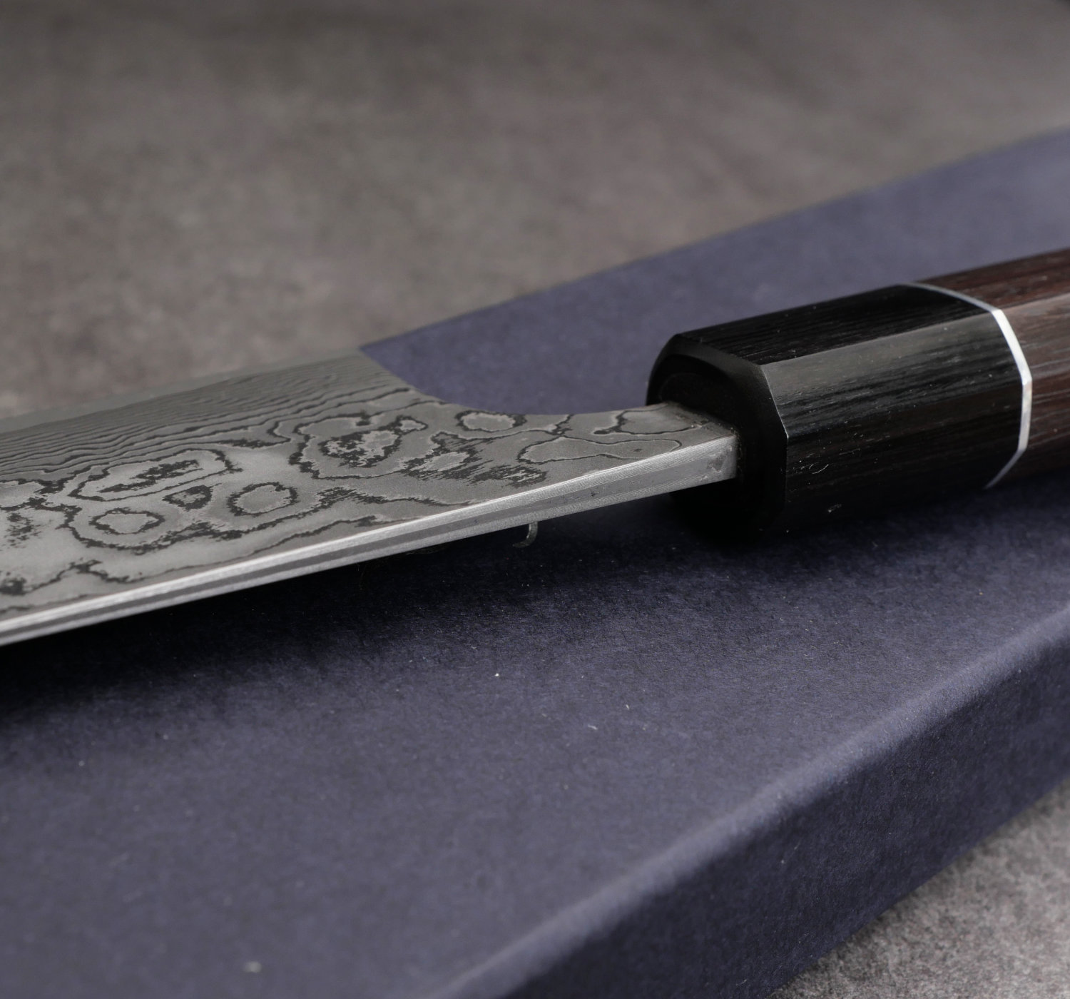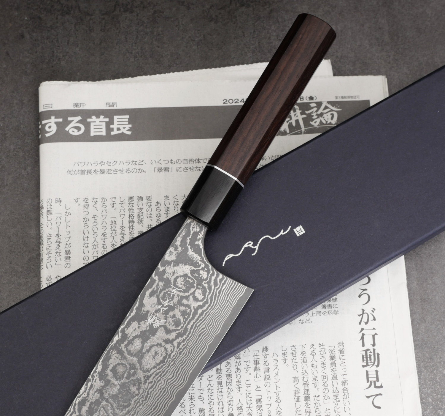 En handsmidd kniv från Anryu knives i Takefu Knife Village. Smedjan leds av Takumi Ikeda som tagit över efter att Katsushige Anryu gick i pension för ett antal år sedan. Knivarna är smidda helt för hand i det rostfria stålet VG-10 försetts med en vacker kappa av nickeldamaskus. Knivarna är mycket välsmidda. Ryggen är kraftig och smalnar av tydligt fram emot spetsen, samtidigt som eggen är mycket tunn och delikat.
