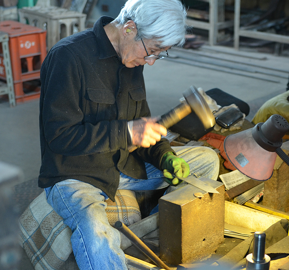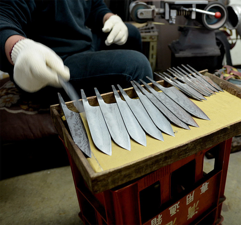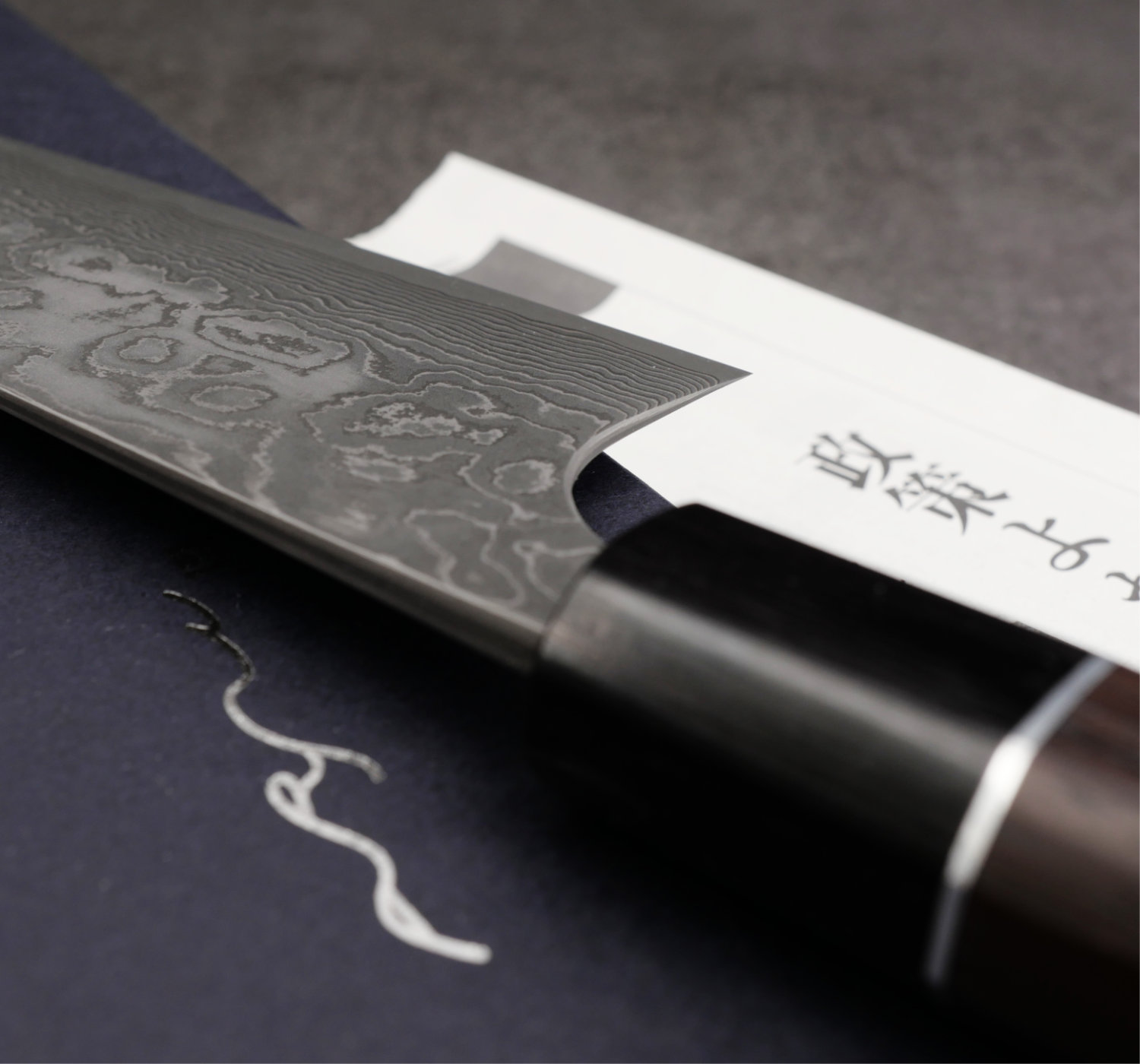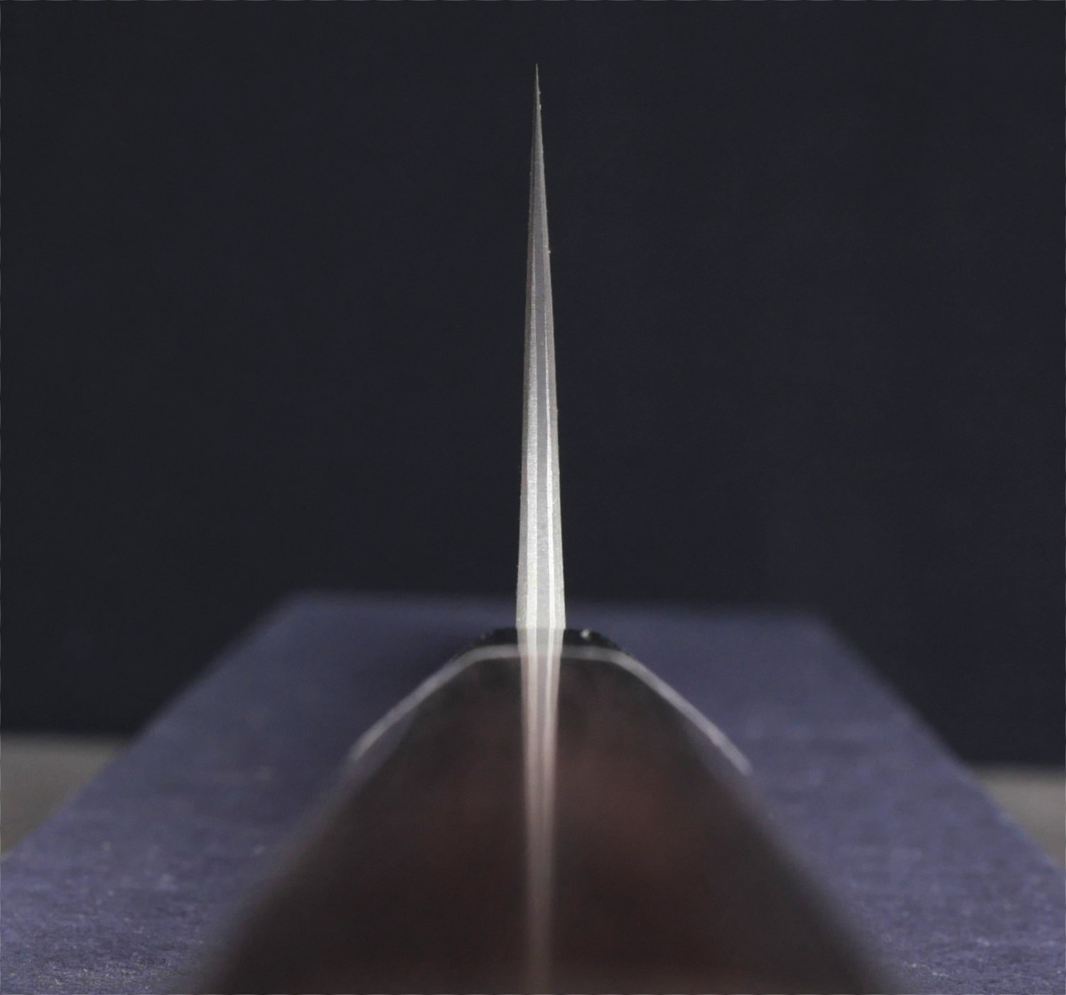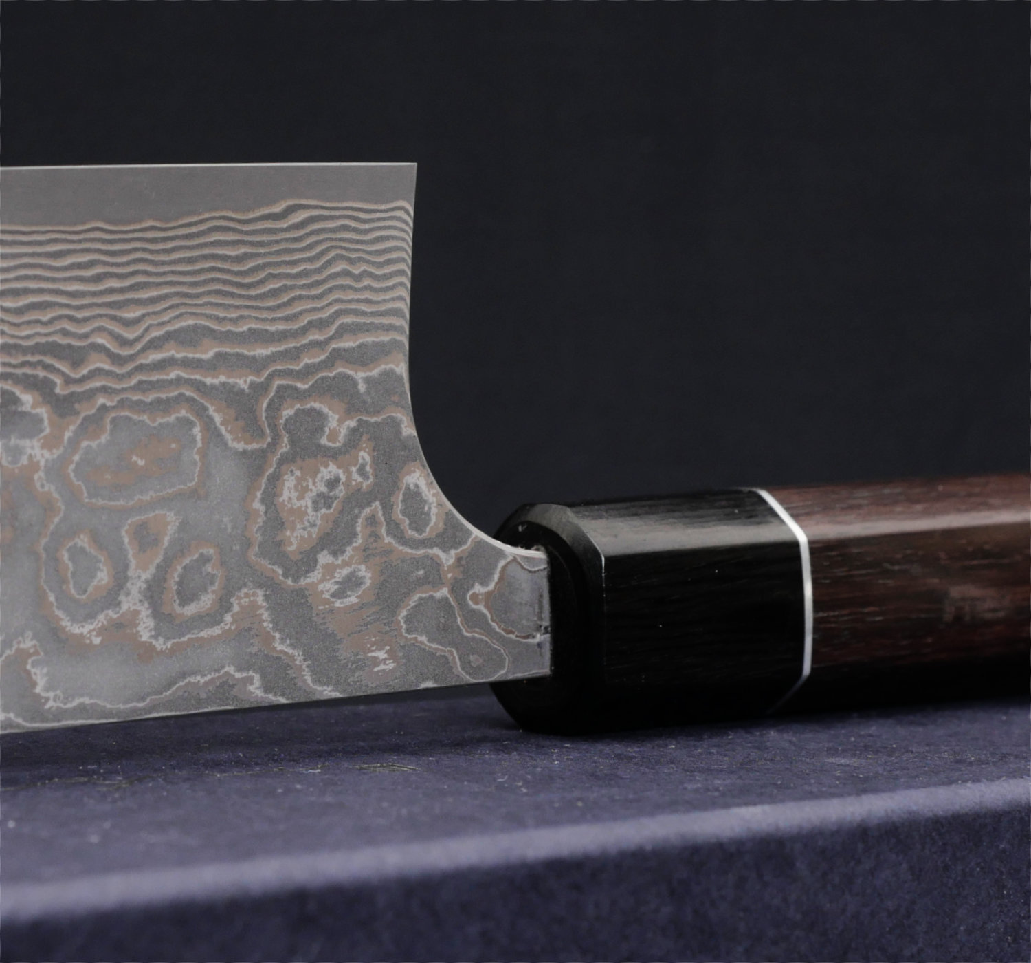 En handsmidd kniv från Anryu knives i Takefu Knife Village. Smedjan leds av Takumi Ikeda som tagit över efter att Katsushige Anryu gick i pension för ett antal år sedan. Knivarna är smidda helt för hand i det rostfria stålet VG-10 försetts med en vacker kappa av nickeldamaskus. Knivarna är mycket välsmidda. Ryggen är kraftig och smalnar av tydligt fram emot spetsen, samtidigt som eggen är mycket tunn och delikat.