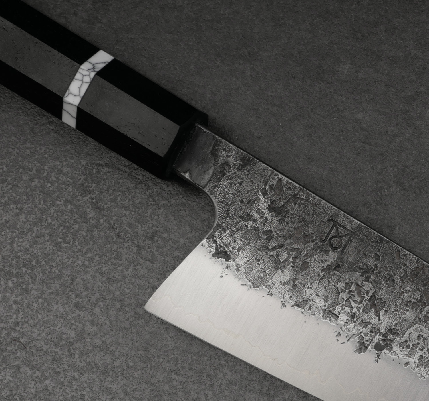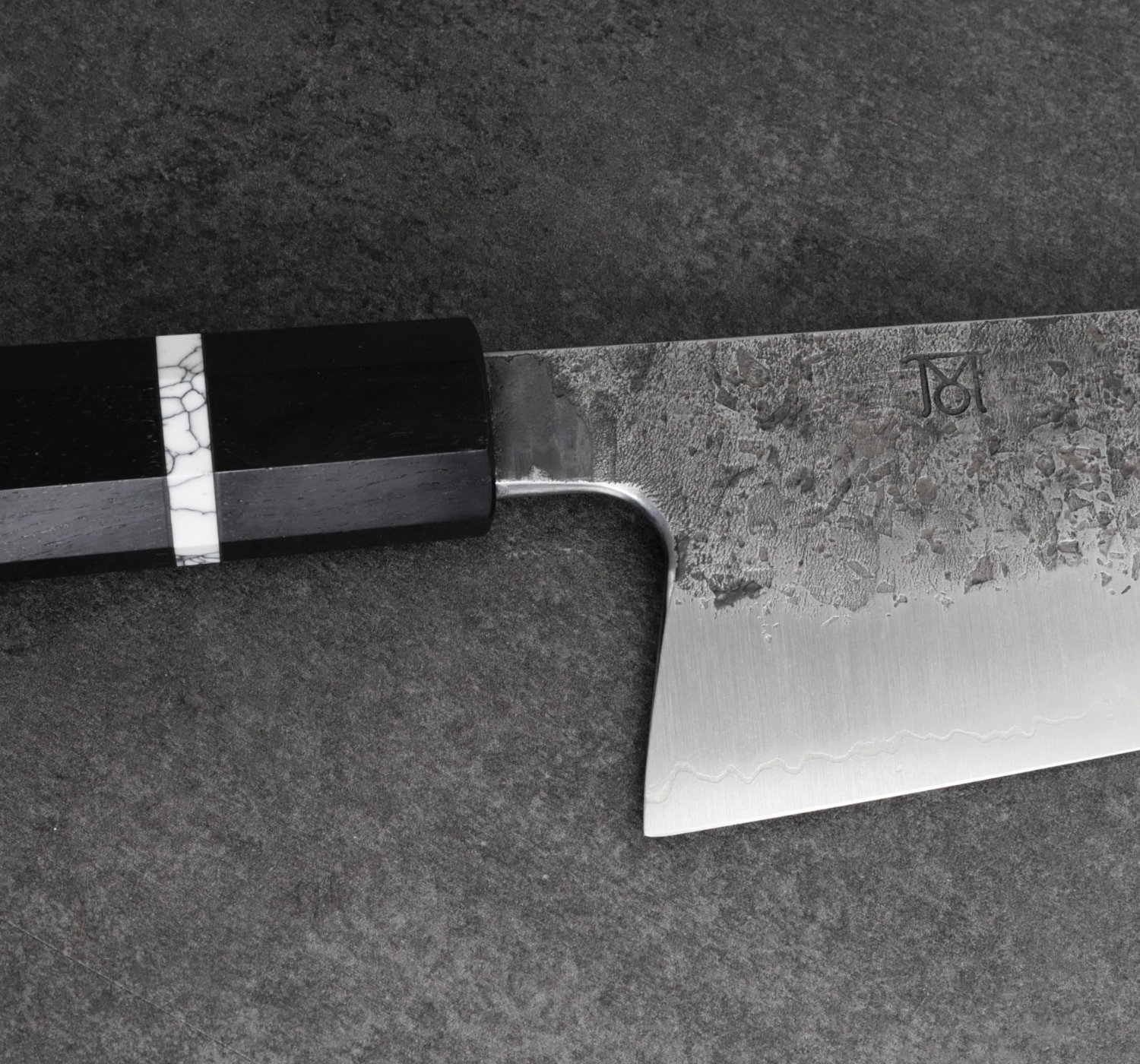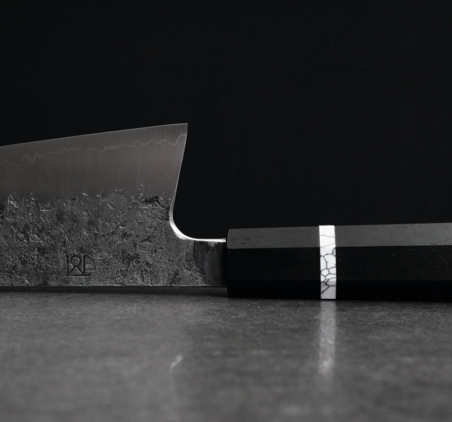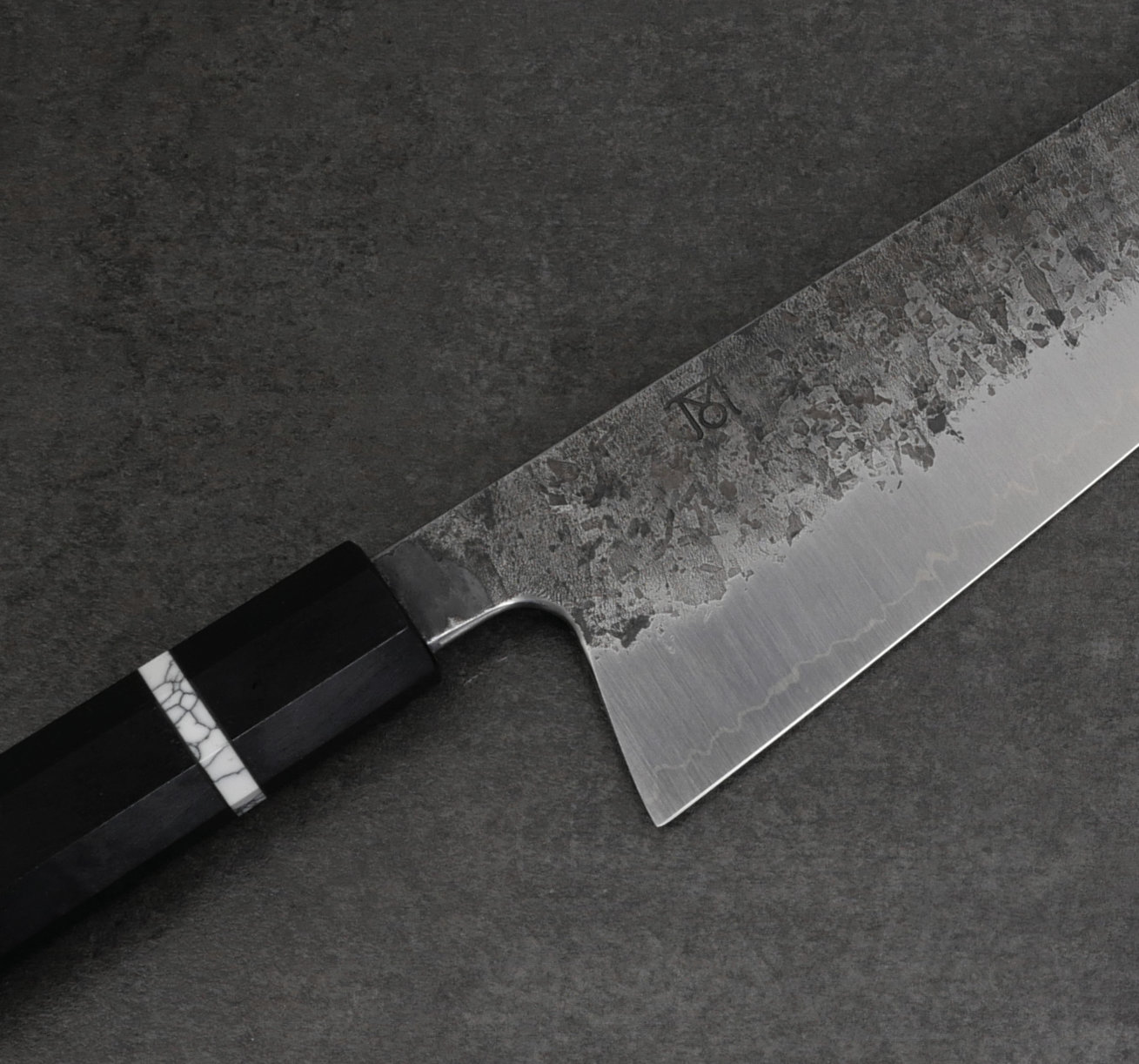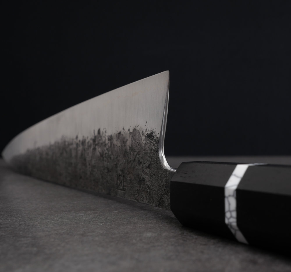 Kärnstålet 26C3 har laminerats med ett lager nickel samt cladding i järn. Spicy white är ett svenskt kolstål från Uddeholm som har stora likheter med Shirogami#2 och denna kniv tar en makalöst skarp egg. Bladet är laminerat för hand av Thomas Moberg (san mai = 3 lager). Finishen på bladsidorna är grov och svärtad från smidet. Japanerna kallar denna finish för kurouchi nashiji (svärtat päronskal).