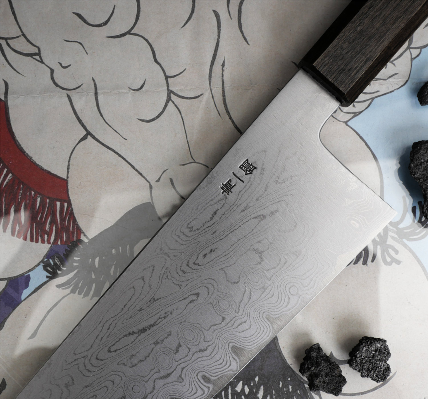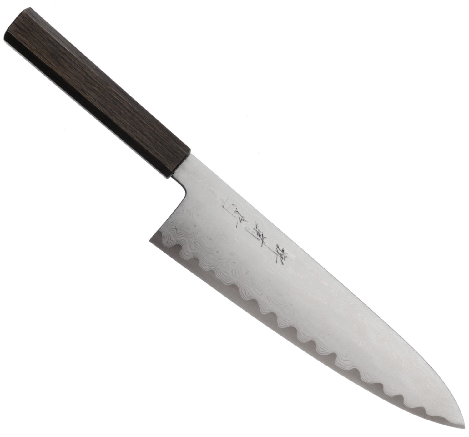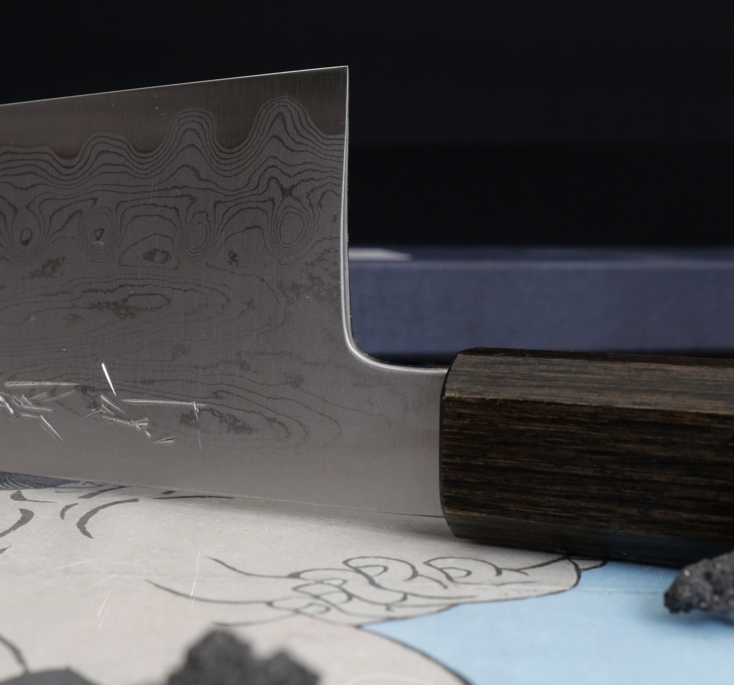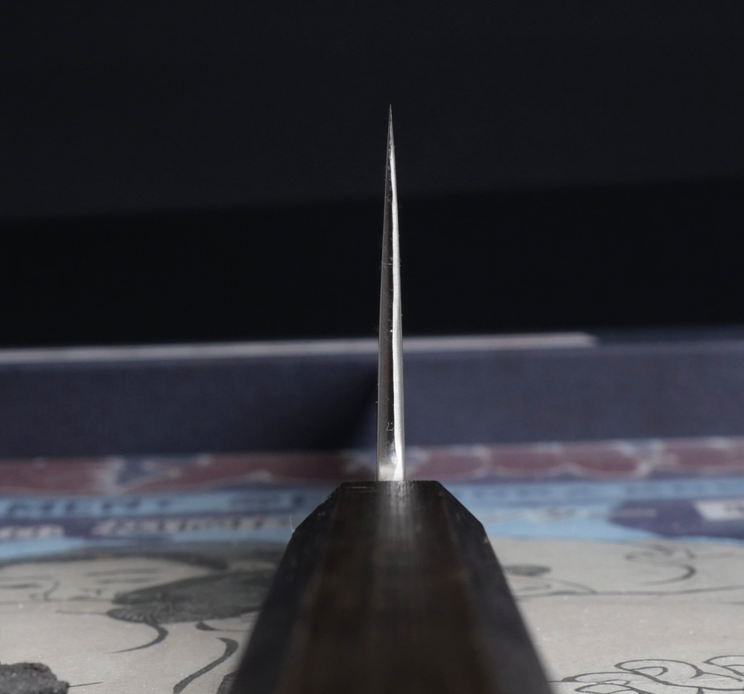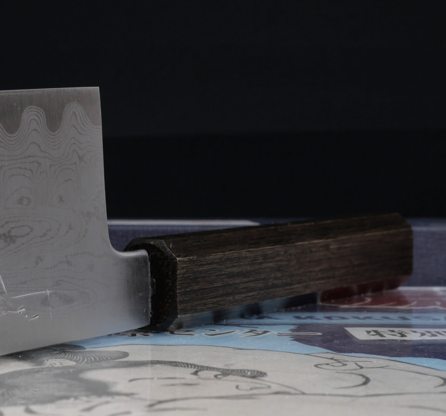 Kockkniv med 23 cm bladlängd och ett extra högt blad. I denna kniv används kolstålet Aogami#1 som tar en läskigt vass egg.