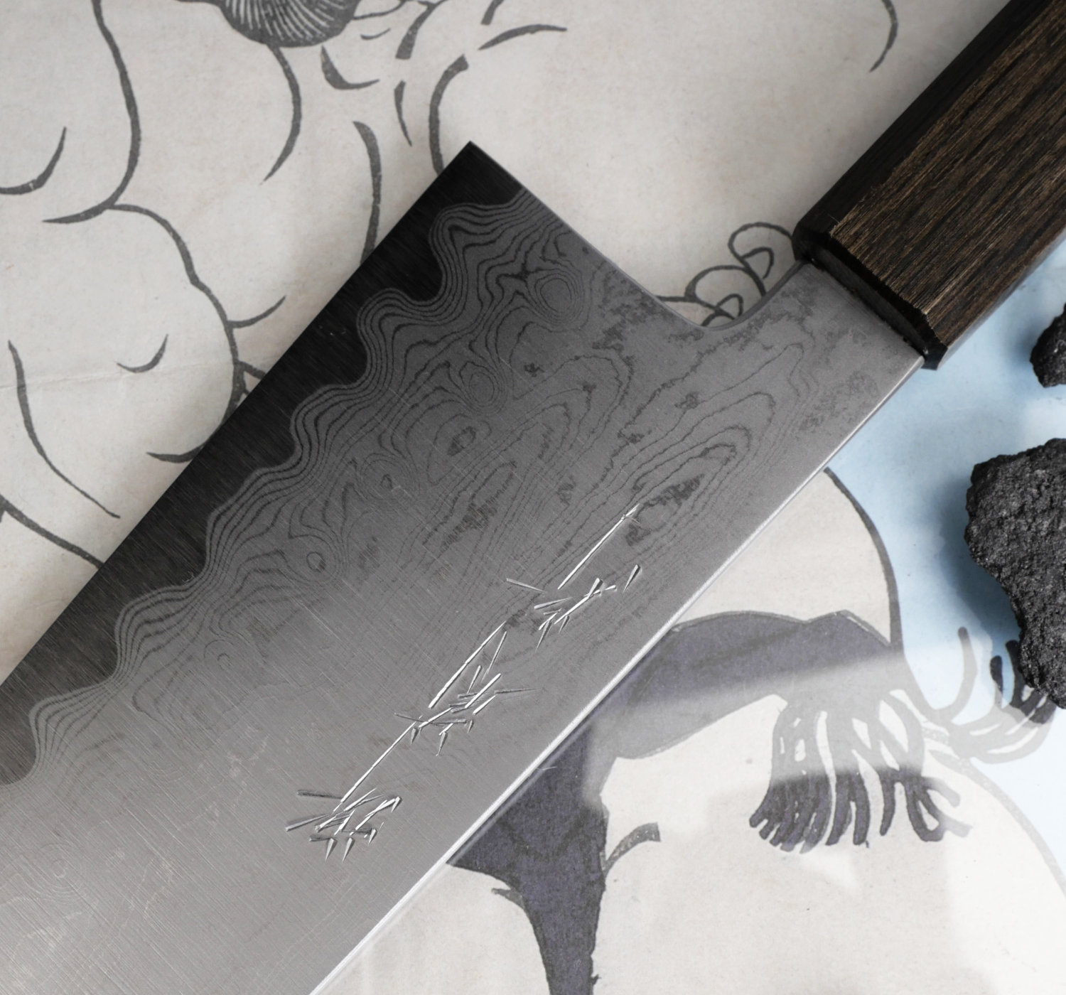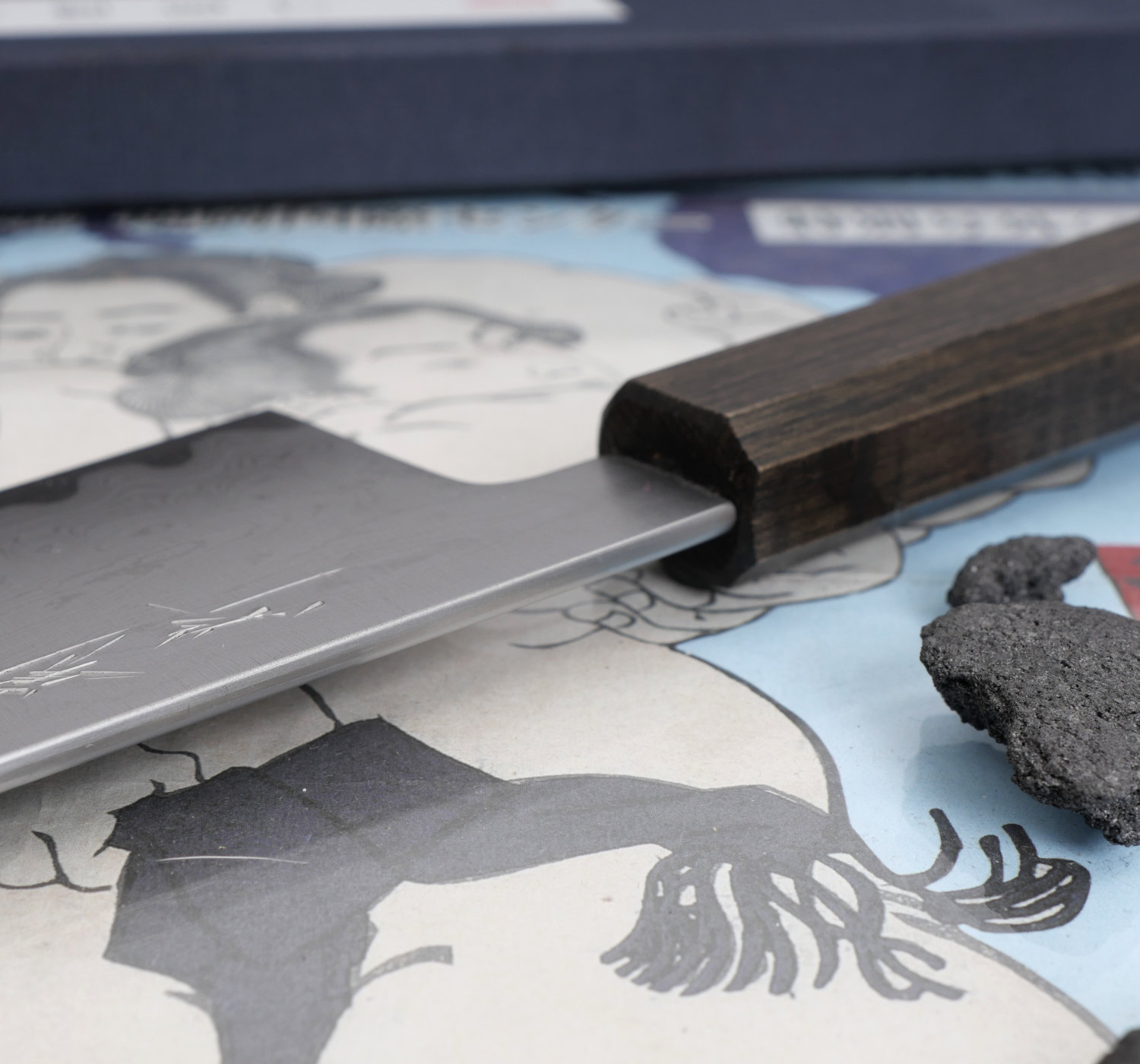 En mycket speciell kniv som tillverkas av Satoshi Nakagawa, en av de skickligaste smederna i Sakai, Japan. Efter att ha arbetet 16 år som smed hos Shiraki har Nakagawa blivit 'independent' och bestämmer själv över formgivning och produktionsmetoder. Han smider sina blad enligt klassisk japansk smidesteknik och klingan håller högsta tänkbara kvalitet. Kniven har behaglig tyngd och ligger som gjuten i handen. Själva eggen är mycket tunn och kniven skär fantastiskt bra.