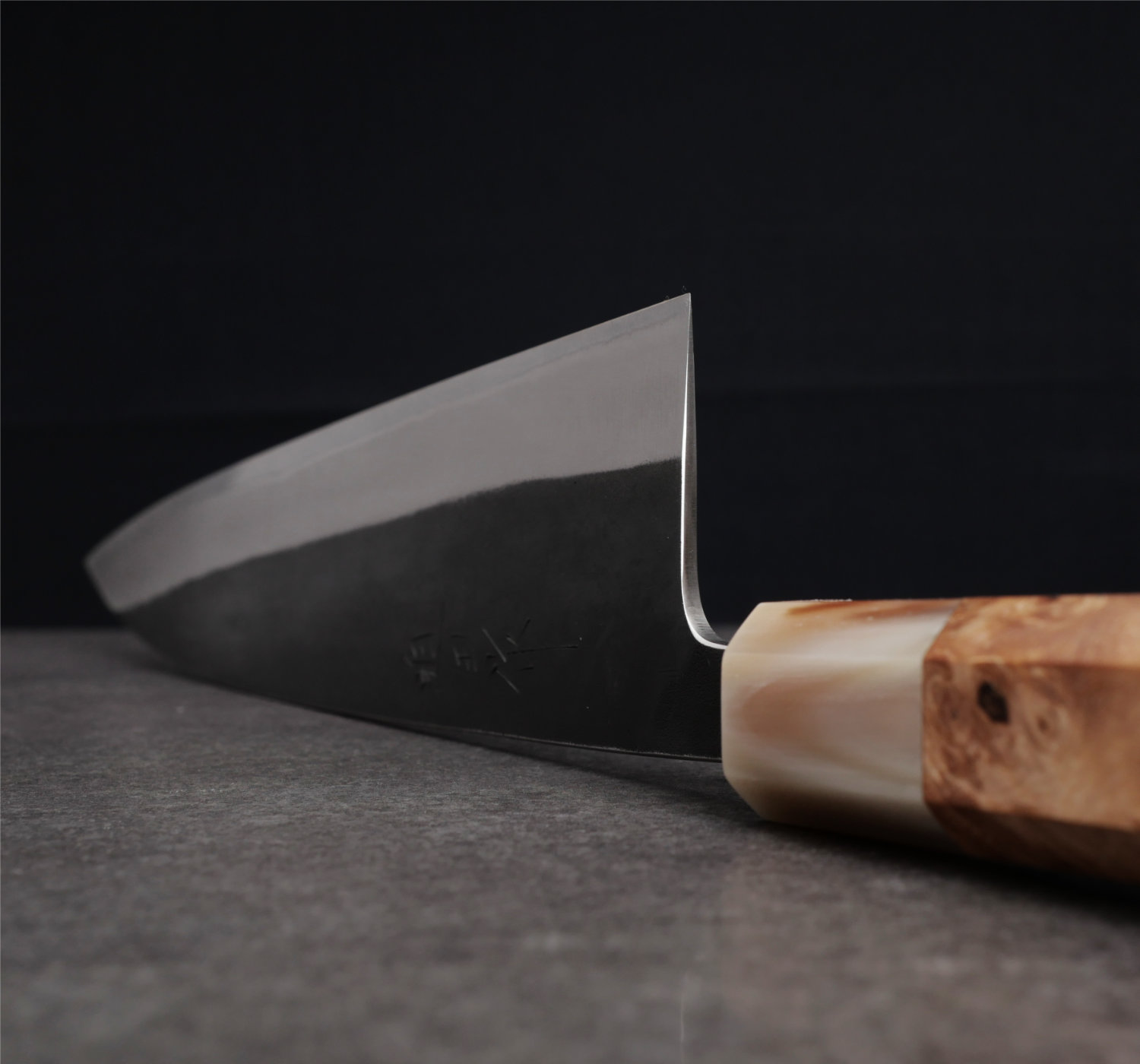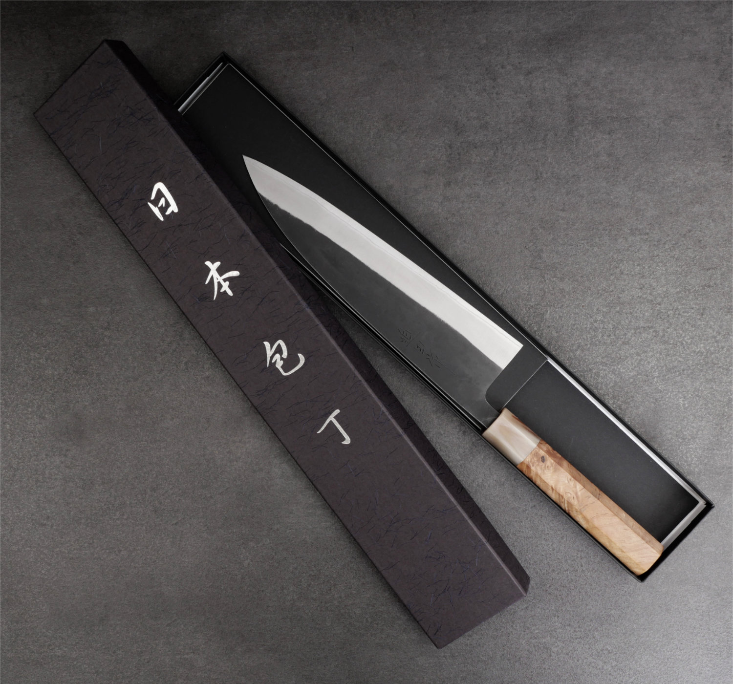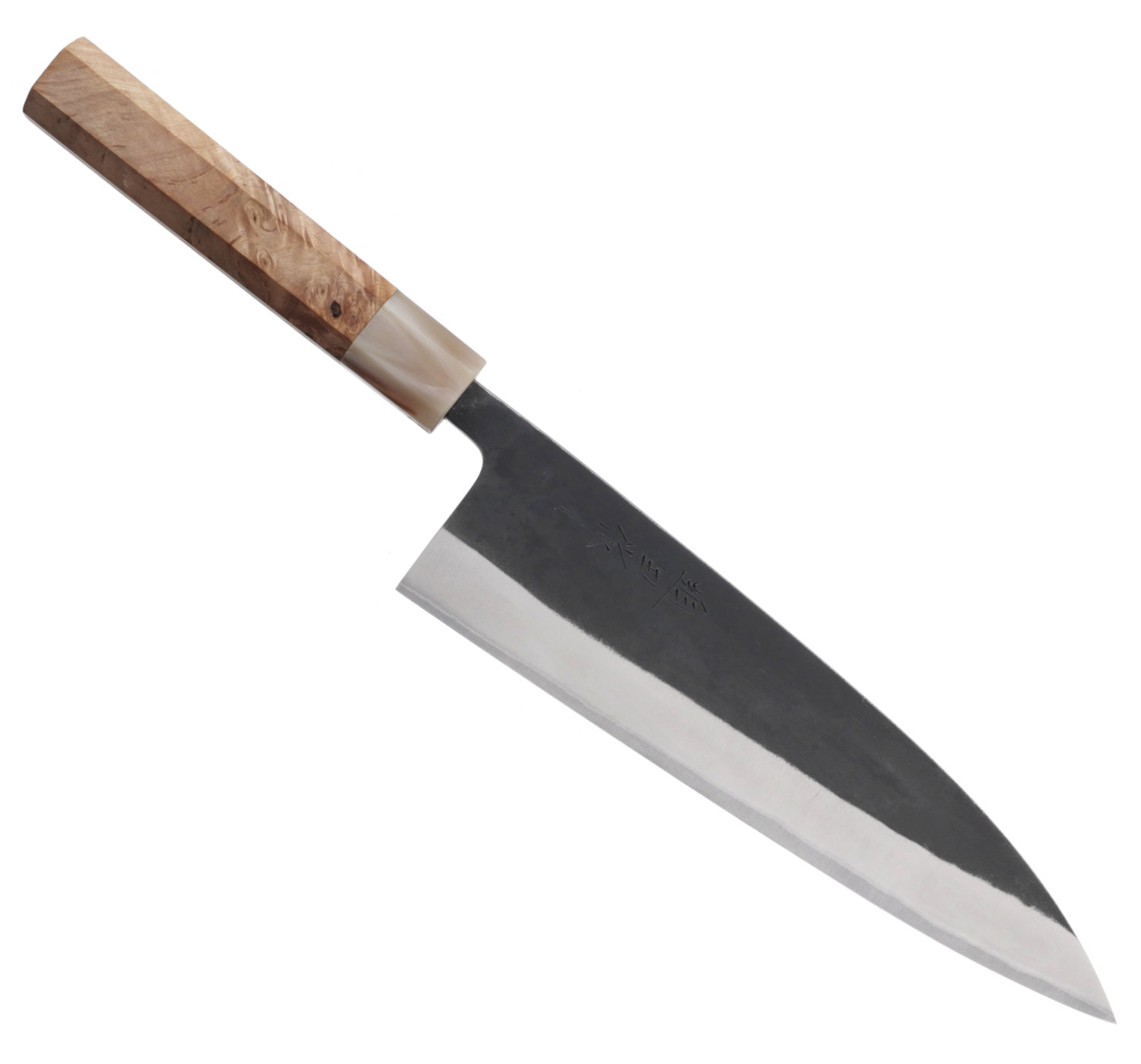 Sakoda san handsmider riktigt fina knivar med ordentlig vikt. Särskilt taperingen imponerar stort på oss. Kniven har en tjock rygg närmast skaftet, som sedan taperar ut på ett mycket fint sätt. Det här är kniven för dig som söker en hög kockkniv med god vikt, tunn egg och en flack profil. Vi rekommenderar!