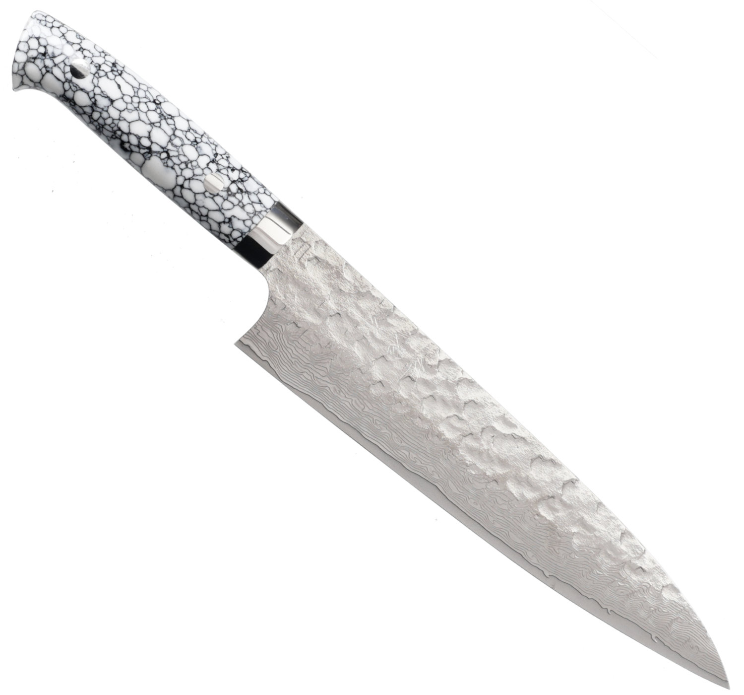 Ett vackert mästerverk från mästaren Takeshi Saji - Kockkniv, gyuto, med 21 cm långt blad. Bladet är högblank med vackert damaskusstål med hammarbankad finish.