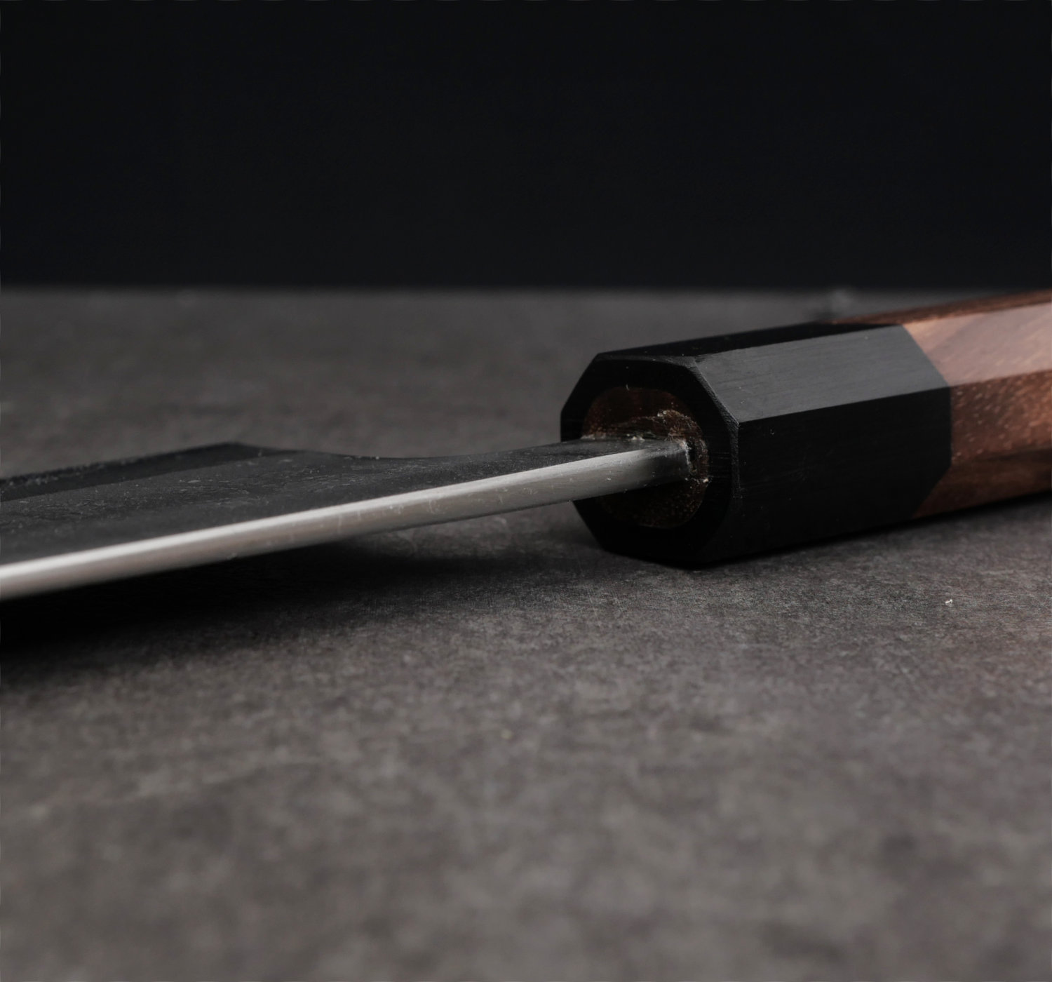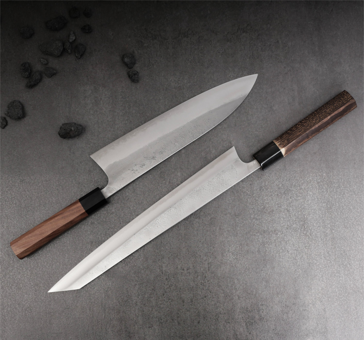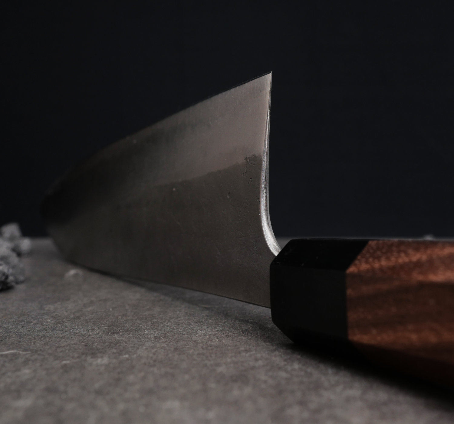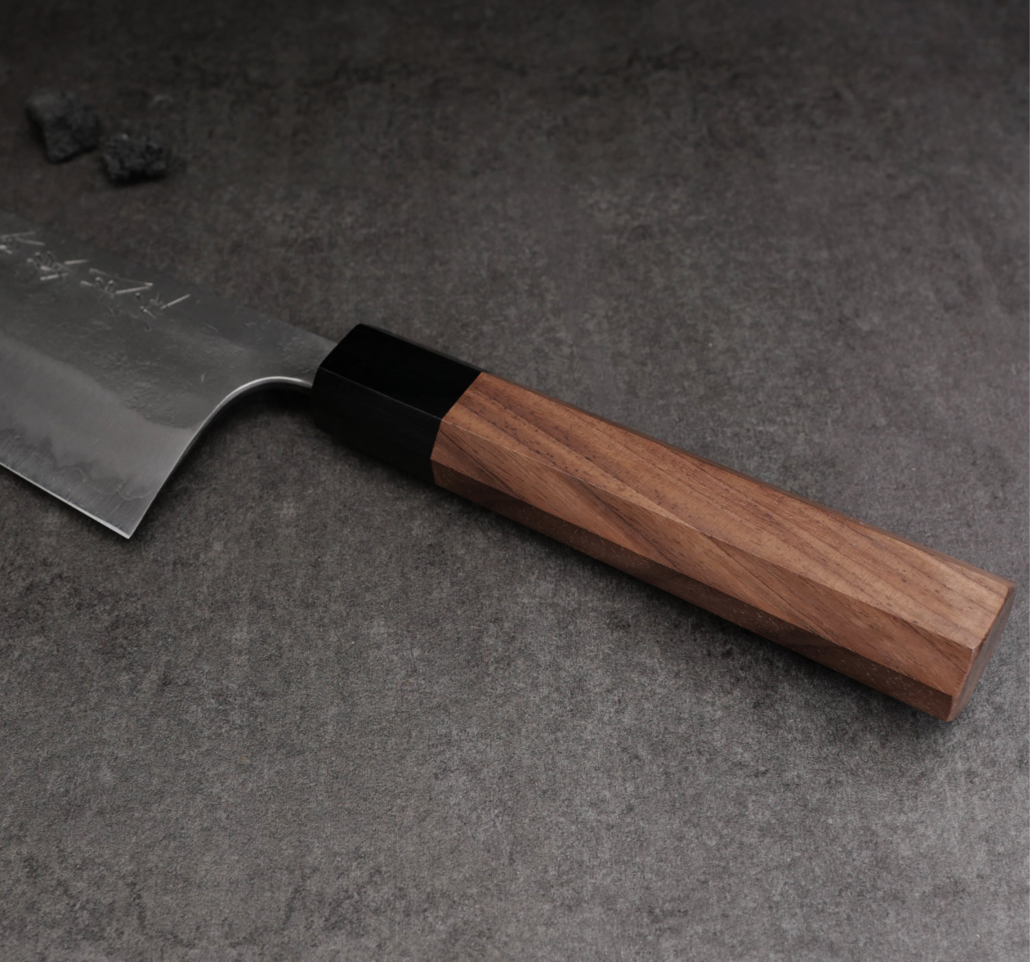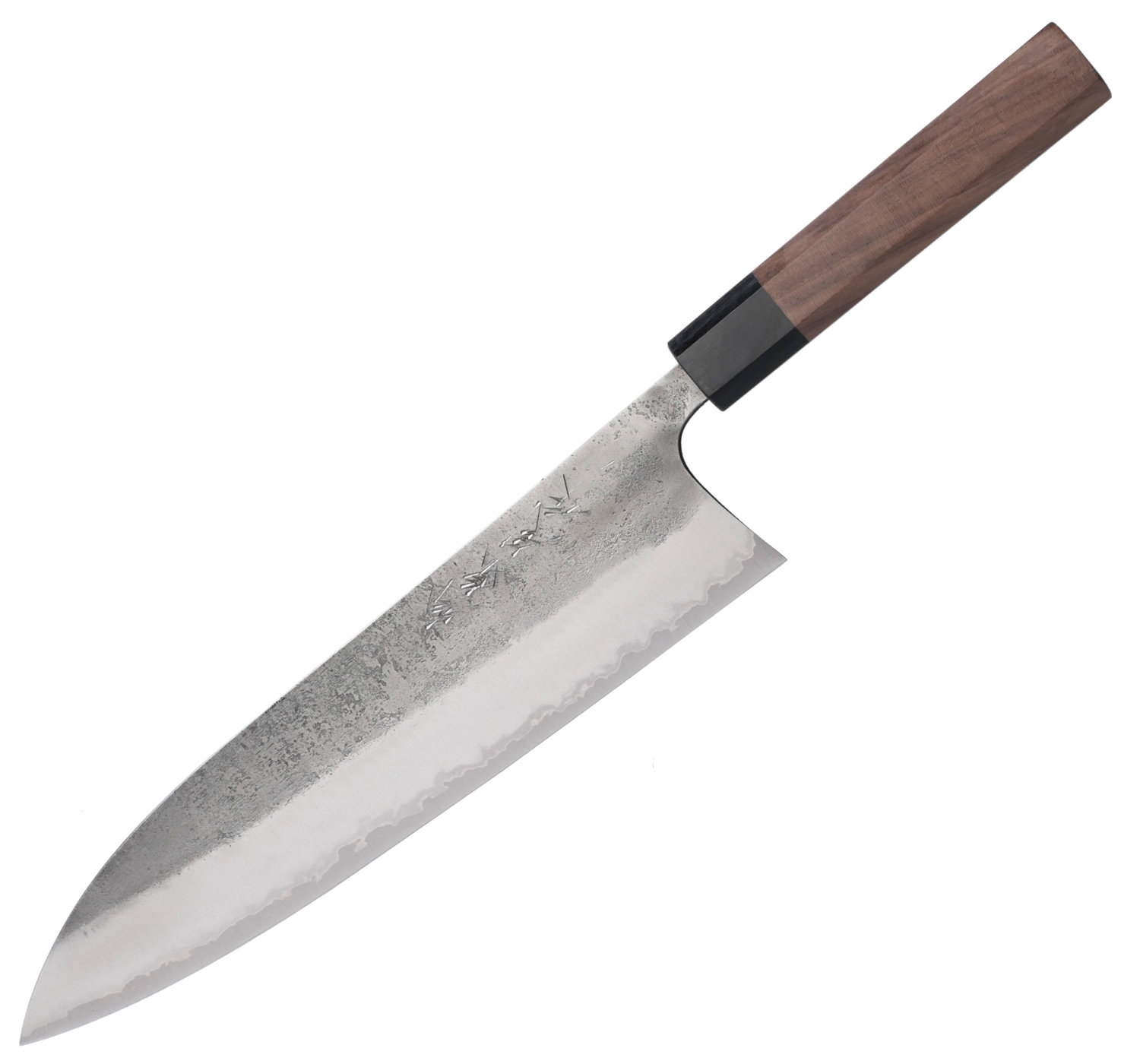 Kärnstålet, aogami#2, är ett hårt kolstål som tar en aggressiv egg som håller skärpan länge. Finishen heter nashiji, en rå och skrovlig yta. Knivarna har tunna eggar och dom ligger suveränt i handen. Skaftet är åttakantigt och tillverkas av valnöt.