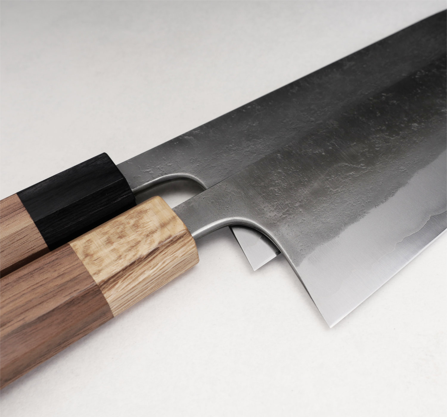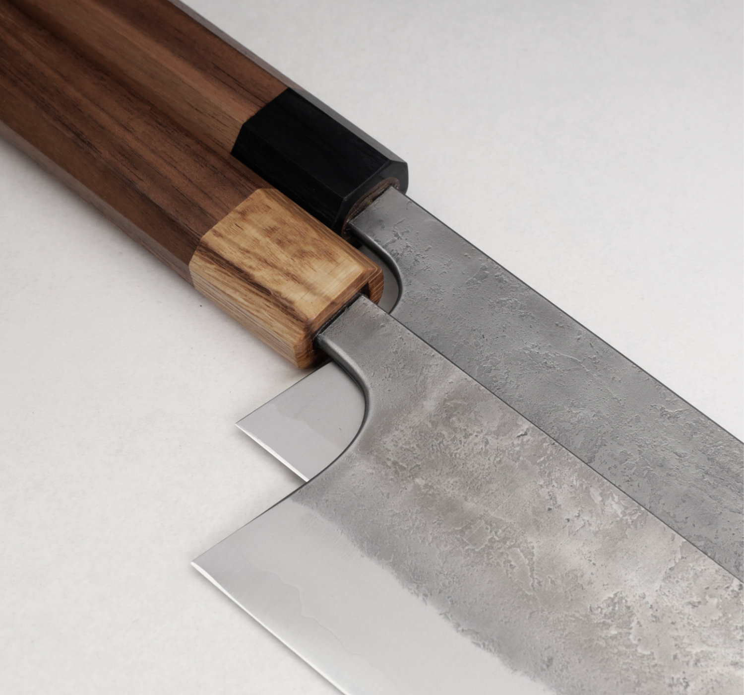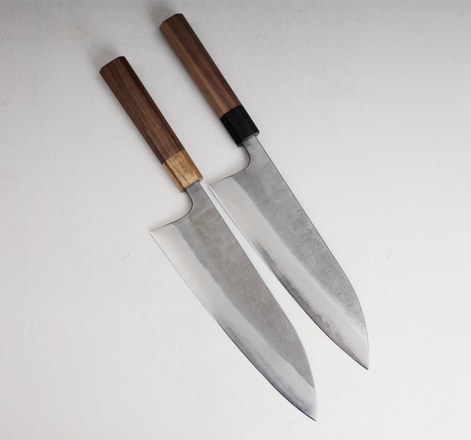 Kärnstålet, aogami#2, är ett hårt kolstål som tar en aggressiv egg som håller skärpan länge. Finishen heter nashiji, en rå och skrovlig yta. Knivarna har tunna eggar och dom ligger suveränt i handen. Skaftet är åttakantigt och tillverkas av valnöt med bolster i ek.