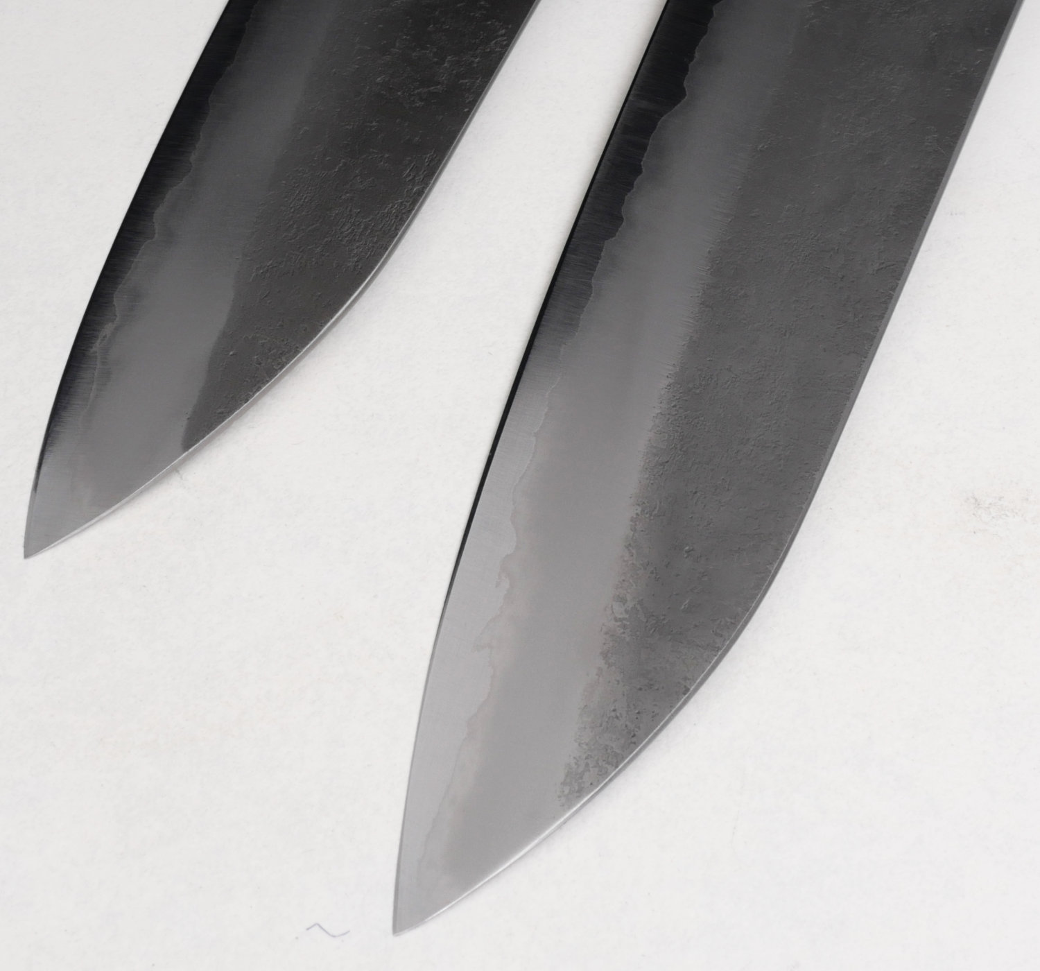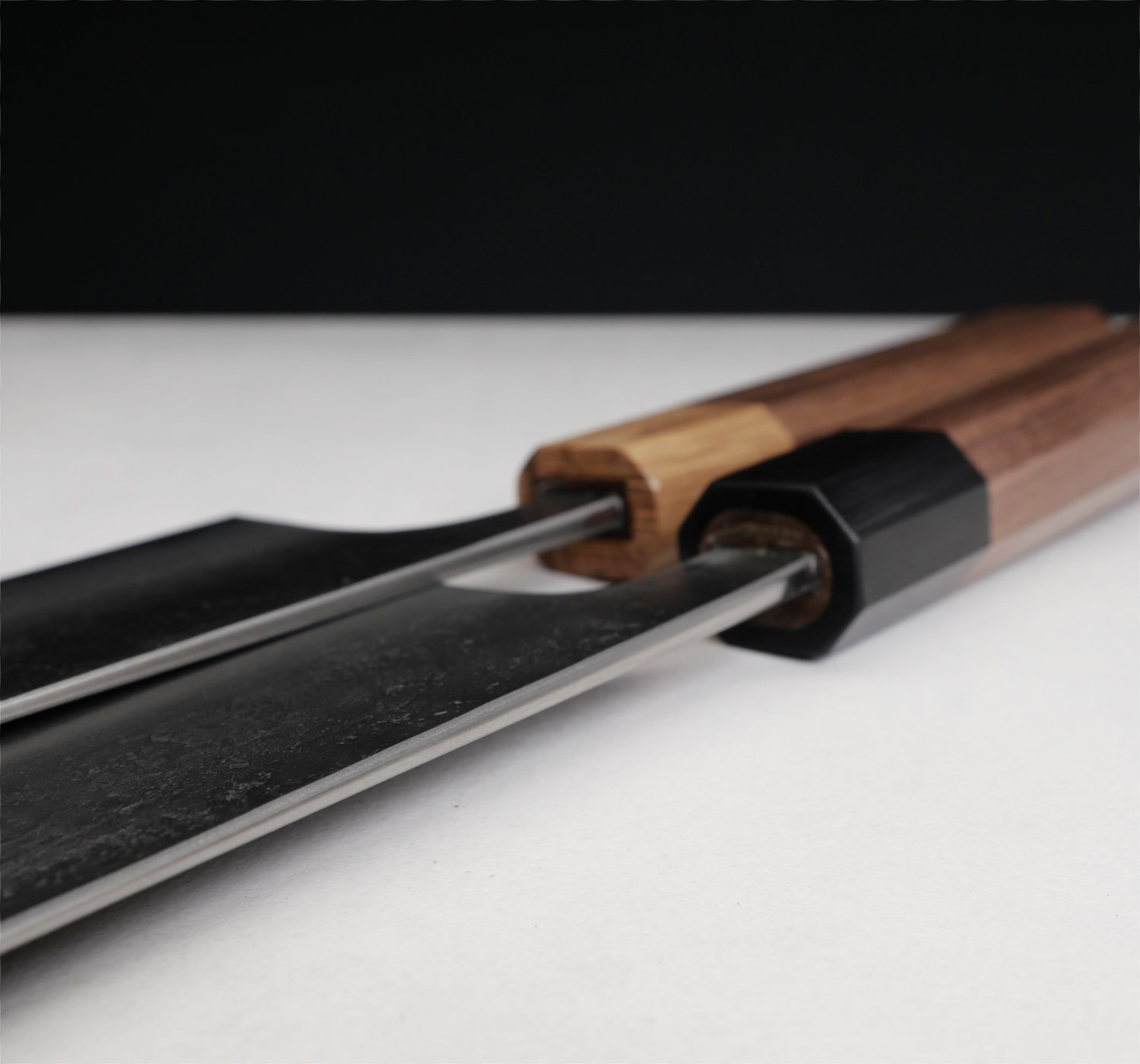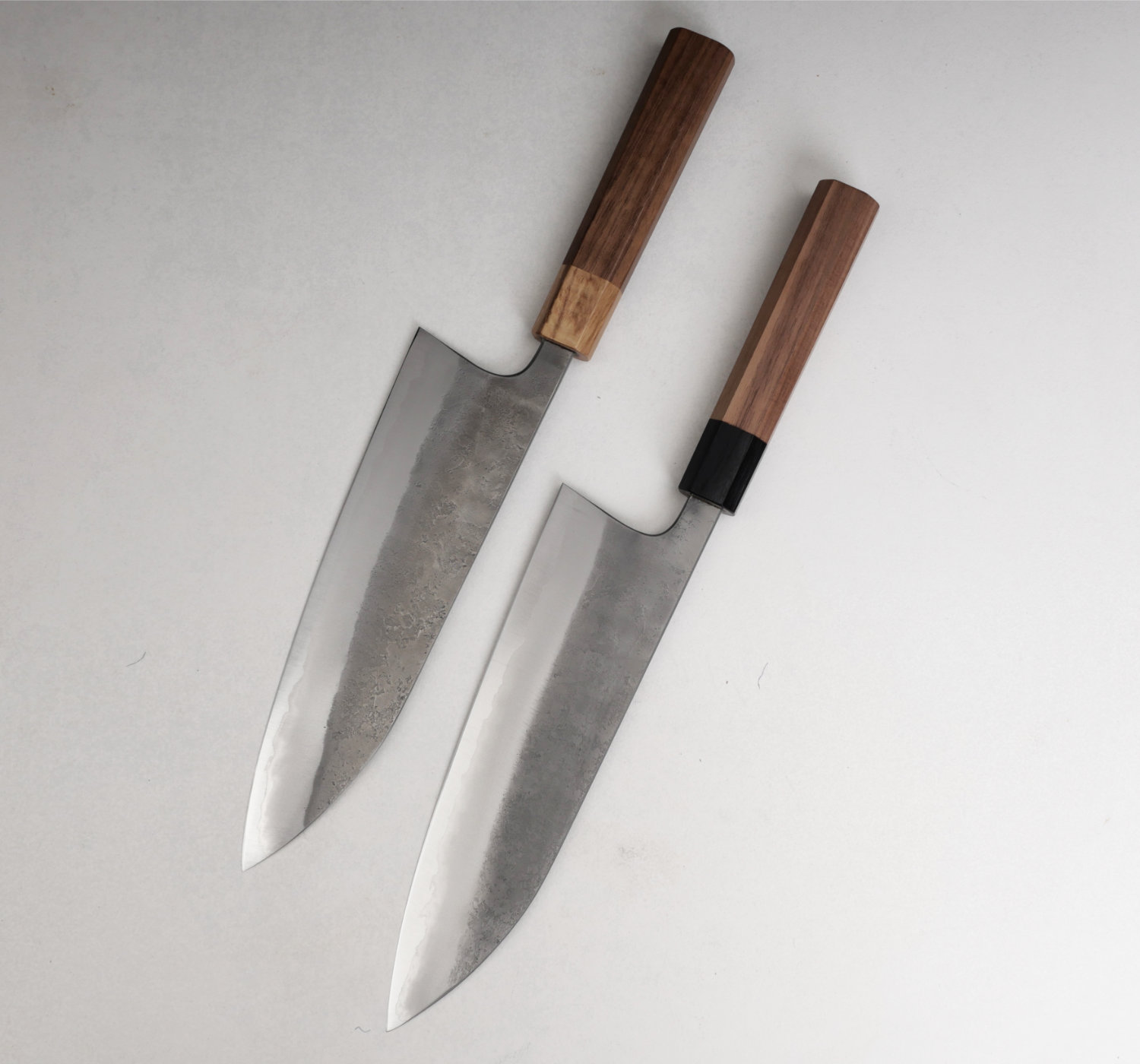 Kärnstålet, aogami#2, är ett hårt kolstål som tar en aggressiv egg som håller skärpan länge. Finishen heter nashiji, en rå och skrovlig yta. Knivarna har tunna eggar och dom ligger suveränt i handen. Skaftet är åttakantigt och tillverkas av valnöt med bolster i ek.