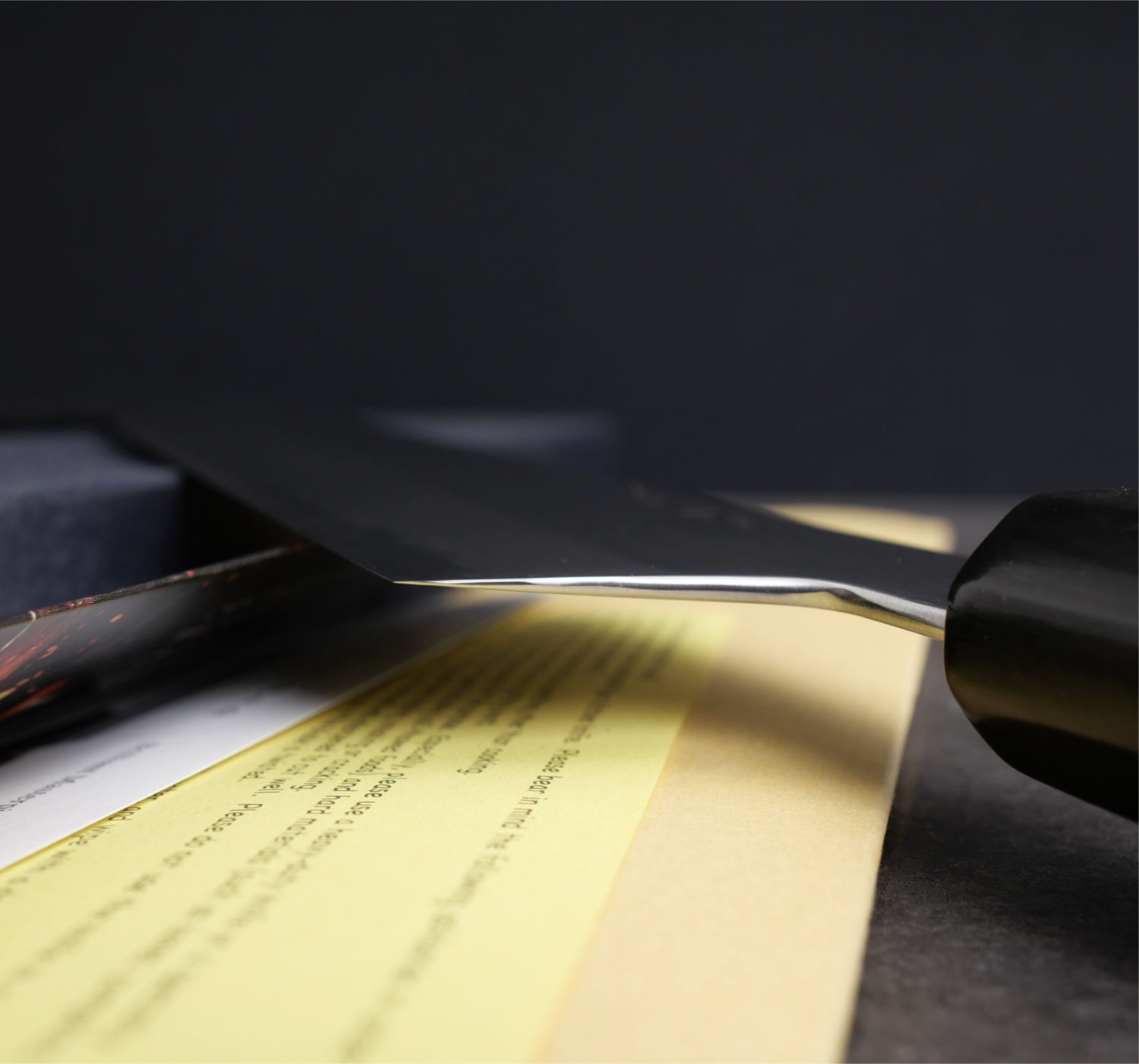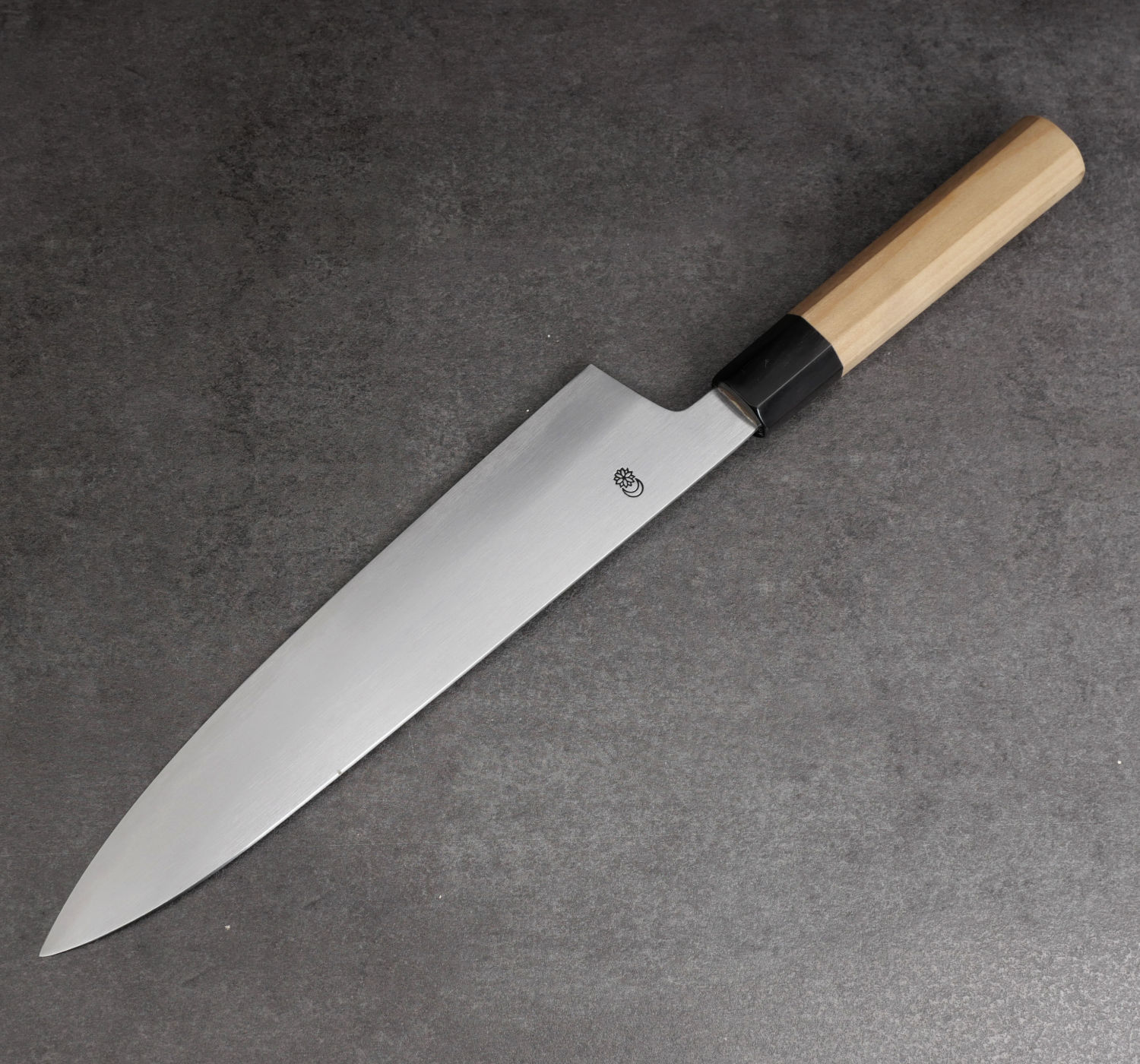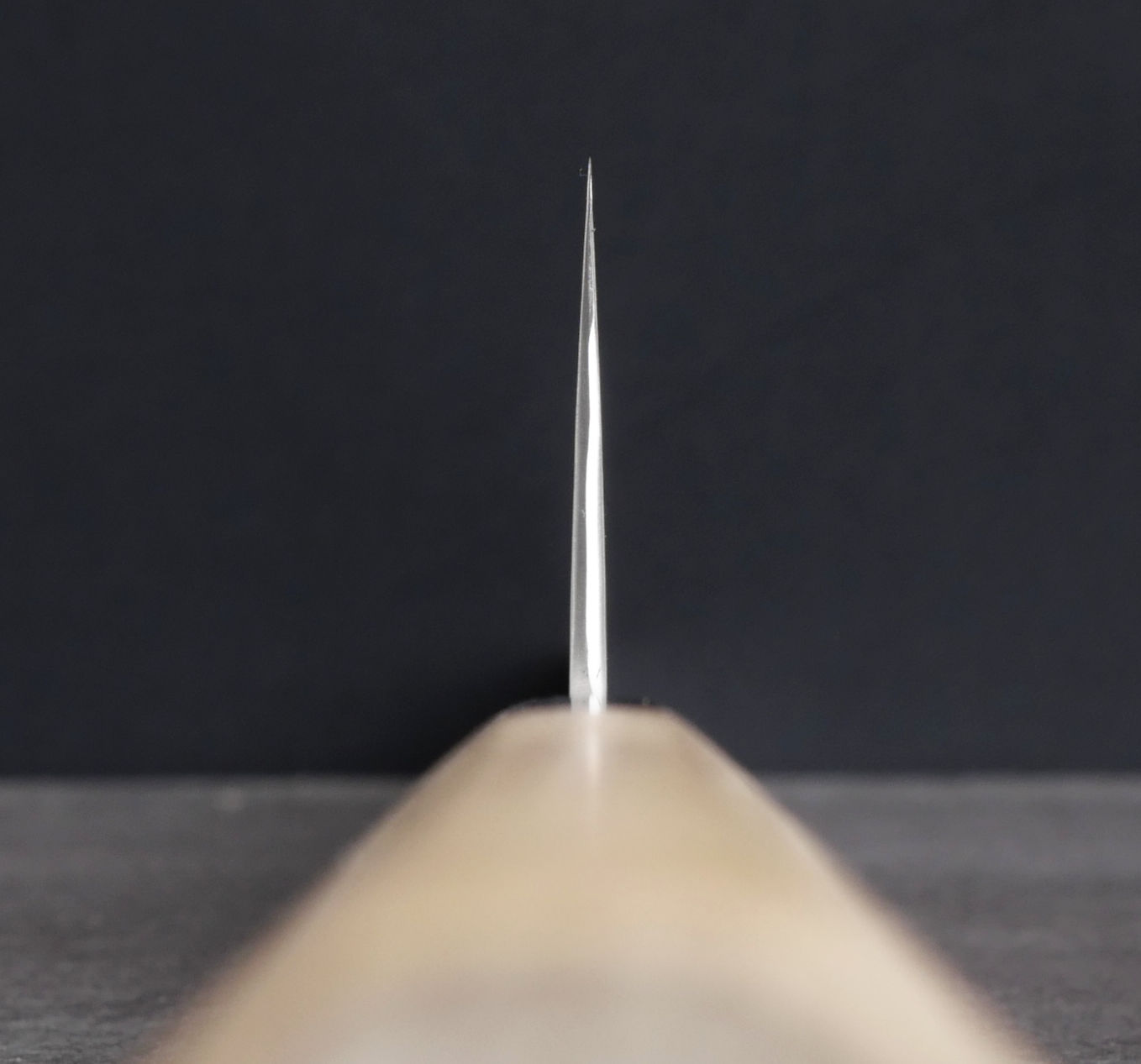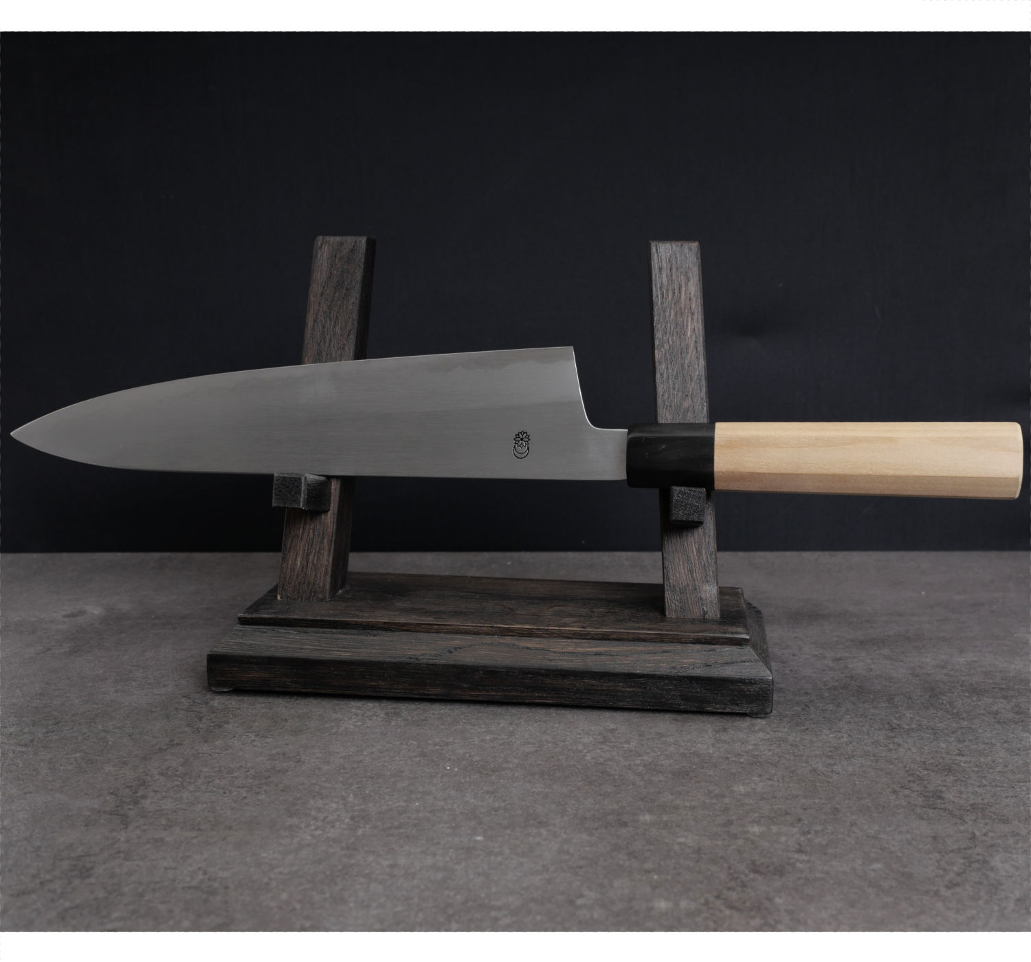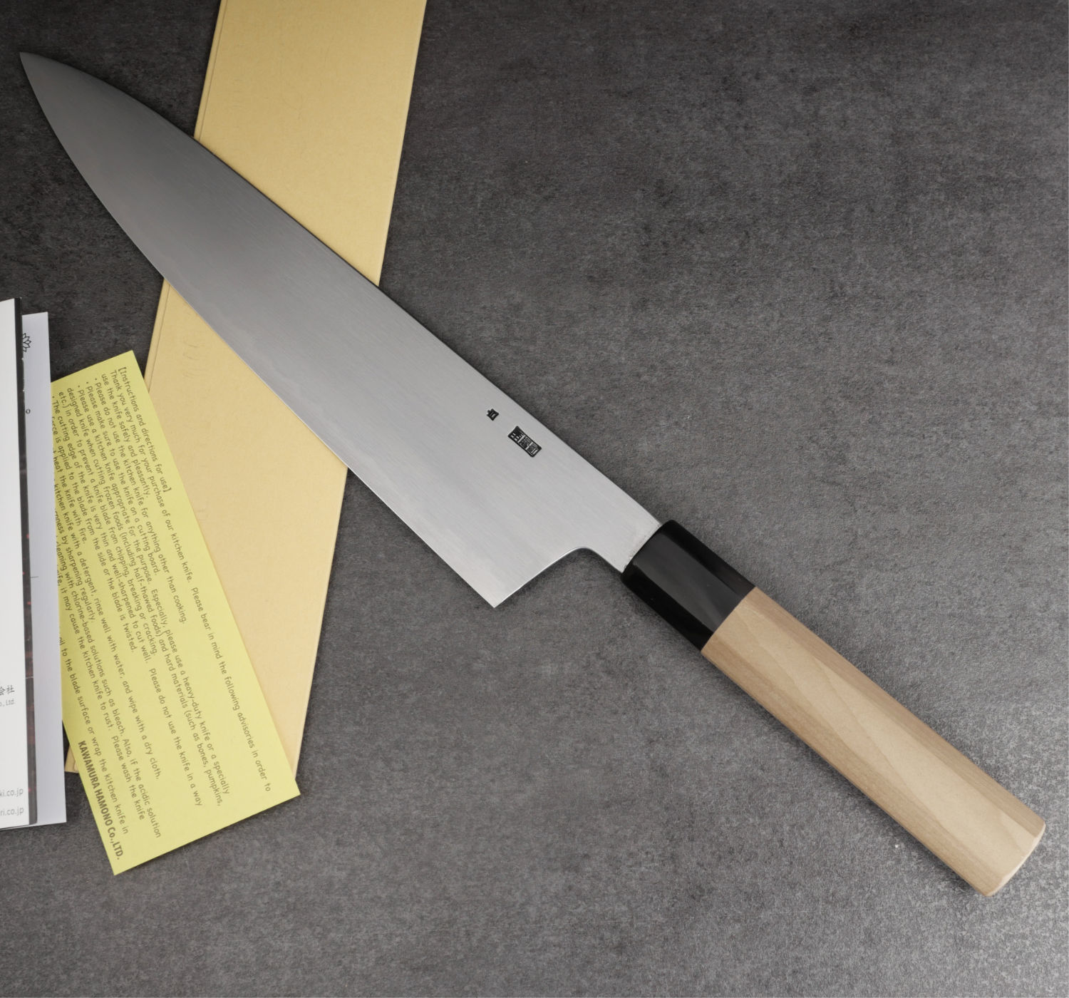 Knivarna utgör själva grundtanken bakom smideskonsten i den japanska staden Sakai. Knivarna tillverkas helt för hand av den mycket skickliga smeden Yoshikazu Tanaka och han använder kolstålet shirogami#2 som smids och värmebehandlas med stor omsorg. Finishen på bladet kallas migaki, vilket är en halvblank finish med horisontelly repmönster. Hairline finish kan det också kallas, men då är oftast repstrukturen aningen grövre. En riktigt fin kniv med stor personlighet.