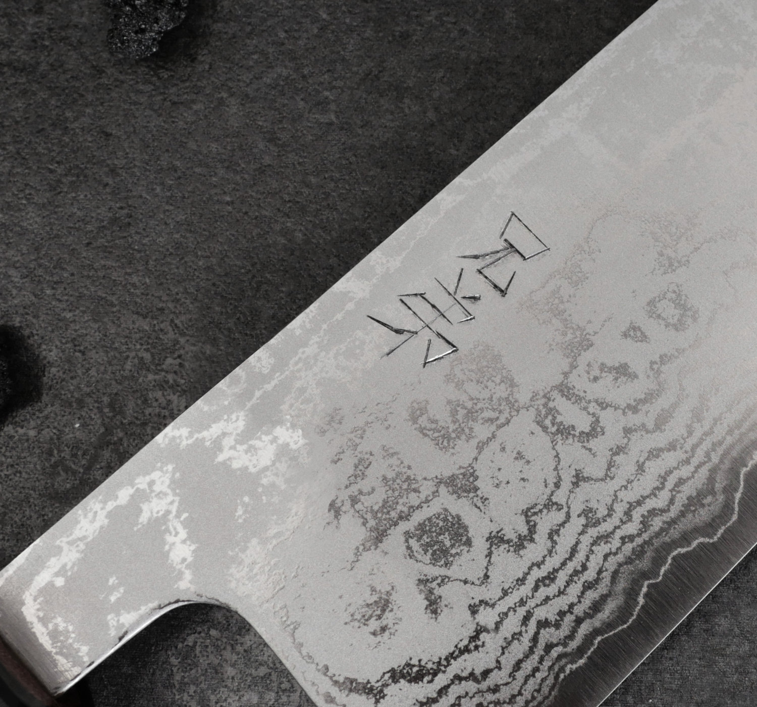 Kanji graveras med en traditionell mejsel och en liten hammare, på samma sätt som japanska smeder signerar sina handgjorda knivar.