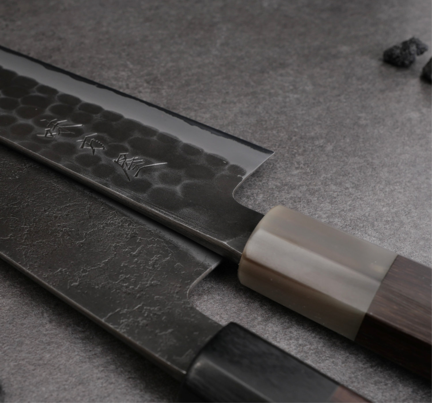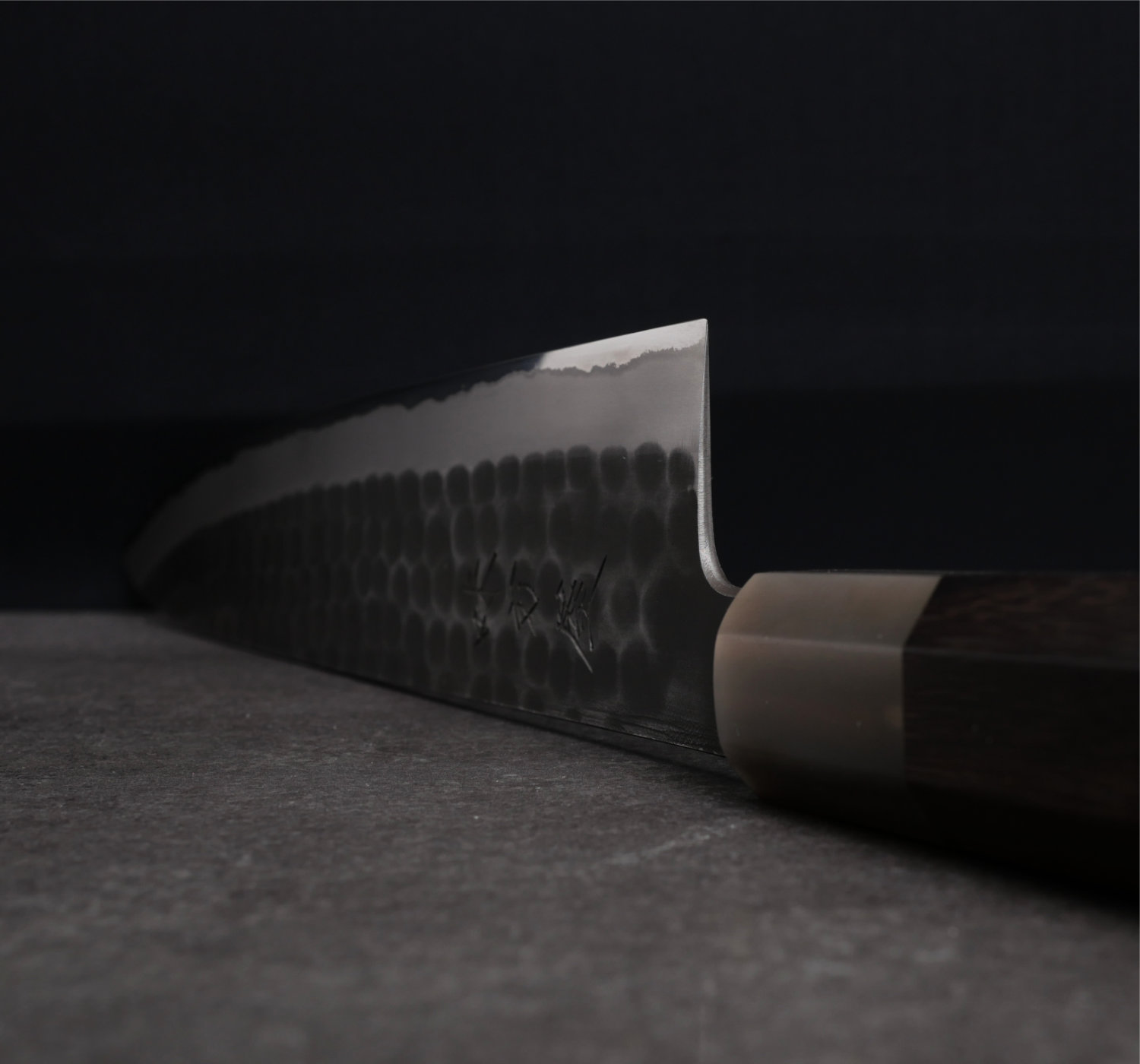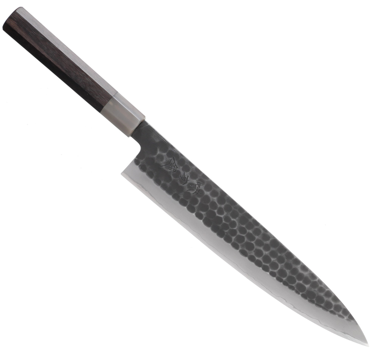 Bladets finish är tsuchime kurouchi, en hammarbankad och svartoxiderad yta. Kniven har ett åttakantigt skaft i rosewood med bolster i ljust buffelhorn.