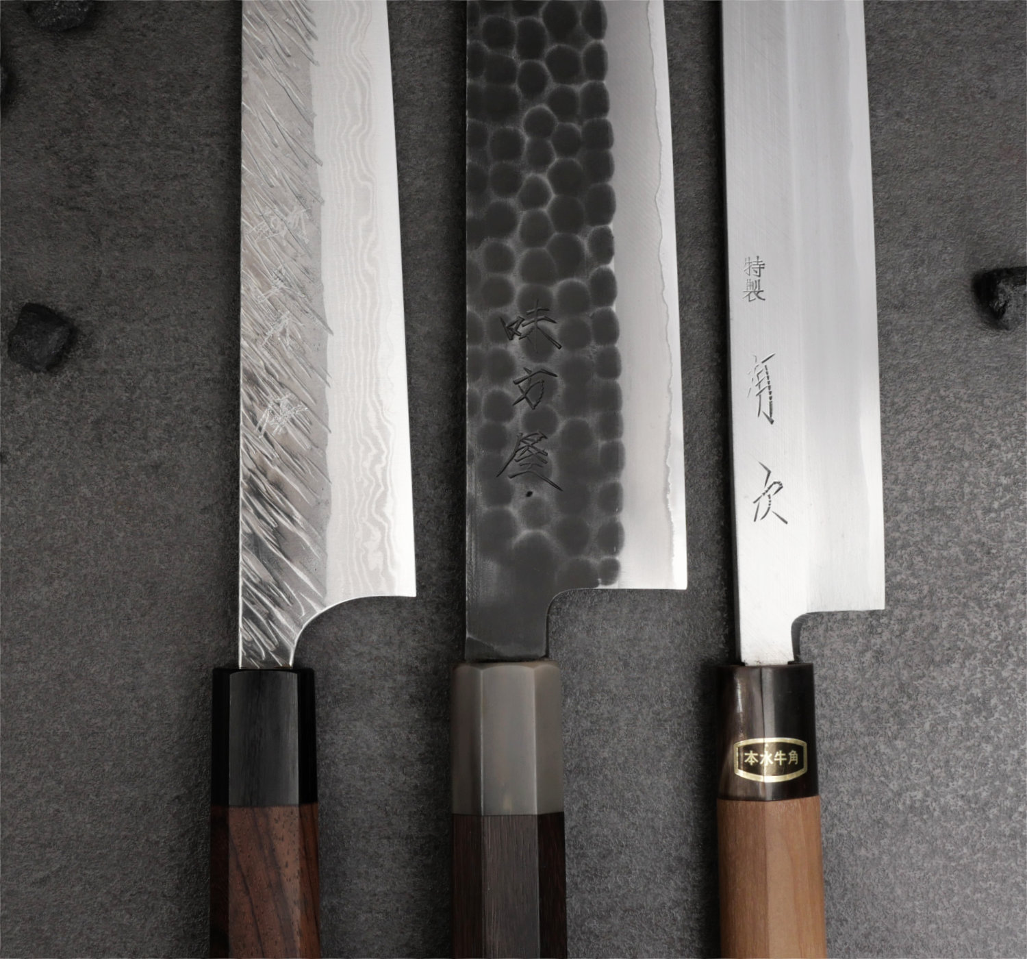 Mutsumi Hinoura har skapat en kniv med rejäl tyngd, samtidigt som eggen är mycket tunn och delikat. Den kraftiga ryggen har en tydlig tapering från smidet, och den fina konvexa geometrin gör att kniven skär exceptionellt väl.