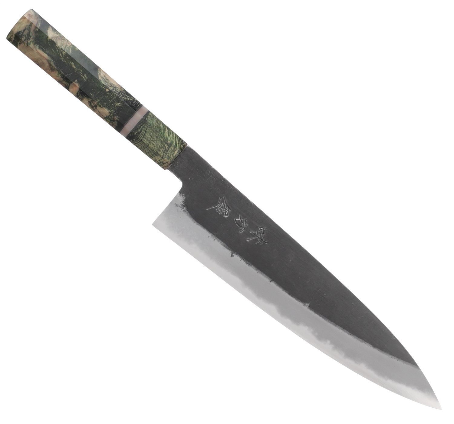 Kockkniv, gyuto, med 218 mm långt blad, fantastick tapering och med ett vackert skaft i stabiliserad lönn med en spacer i buffelhorn.
