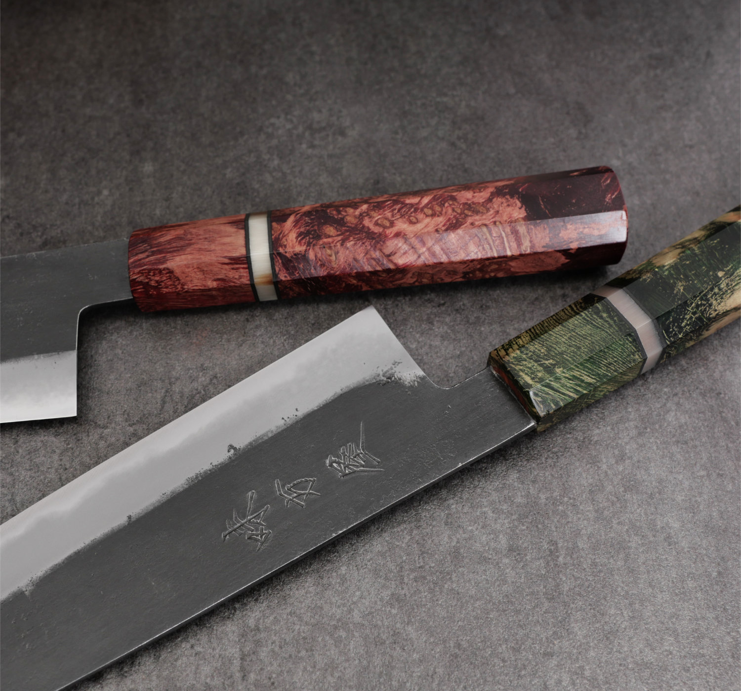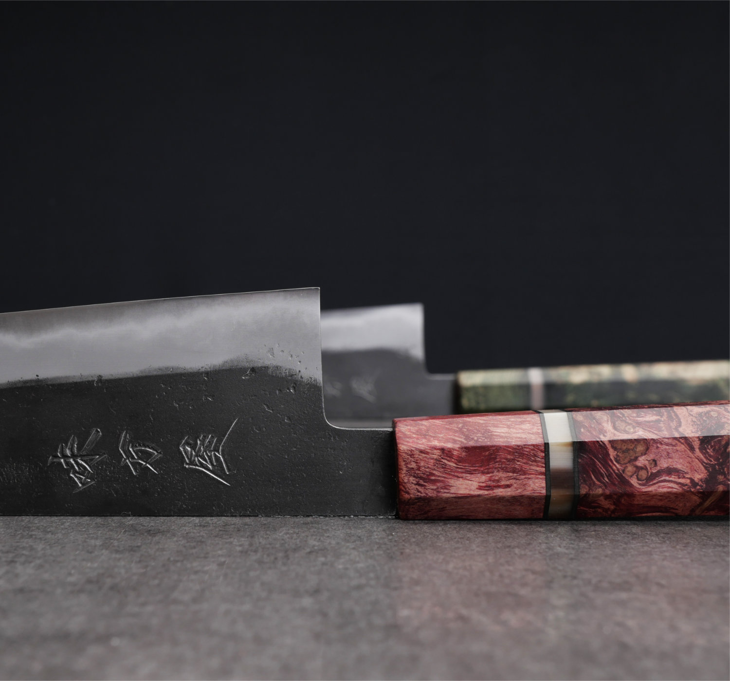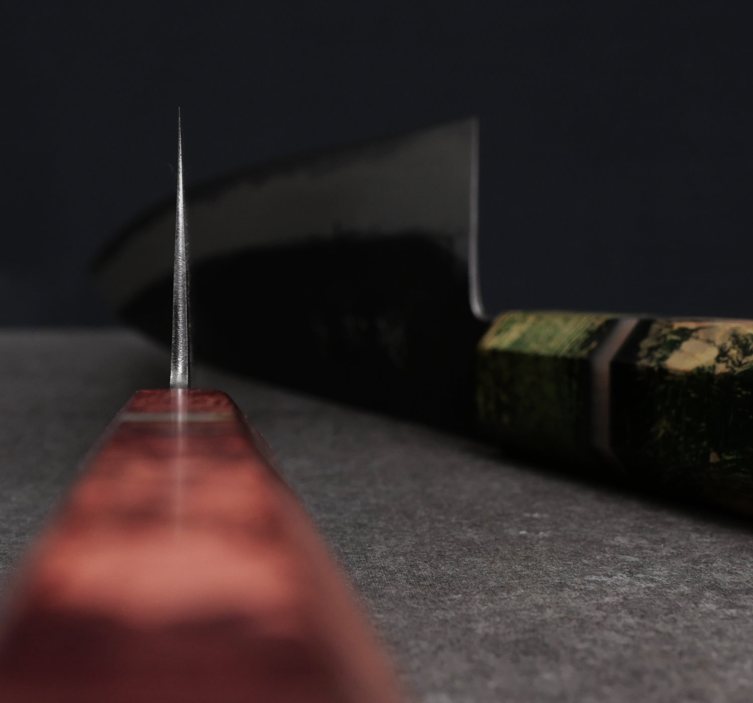 Som avslutning har den tunna och fina eggen försetts med en vacker kasumifinish. Kasumi är en dimmig och silkeslen finish som förhöjer kontrasten mellan det blanka kärnstålet och det utanpåliggande mjukare lagret. Det är få knivar som levereras med så vacker finish på bladet.