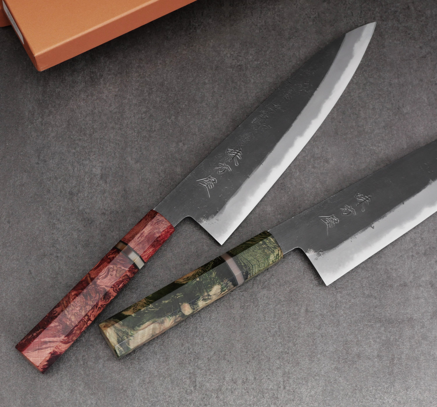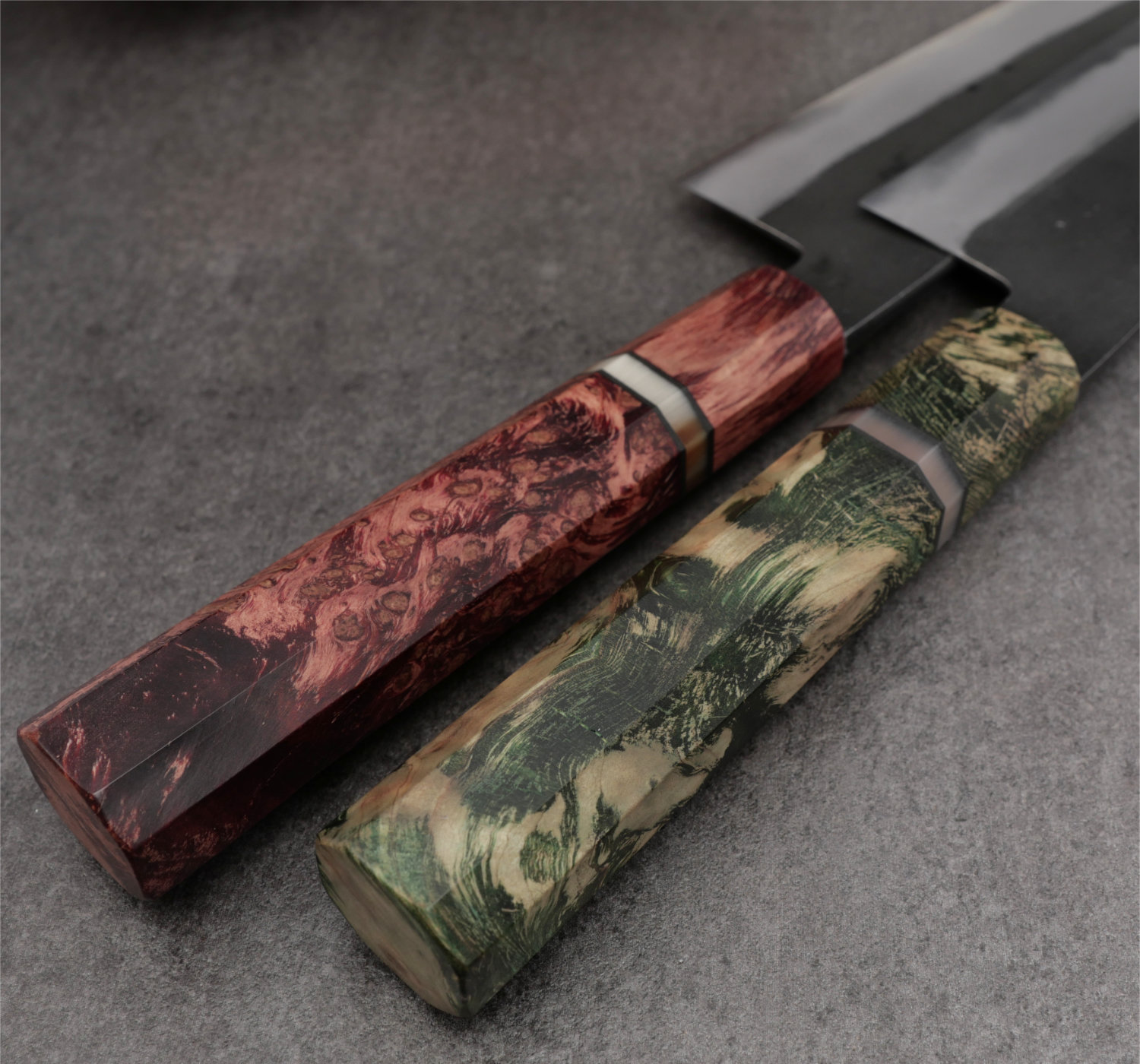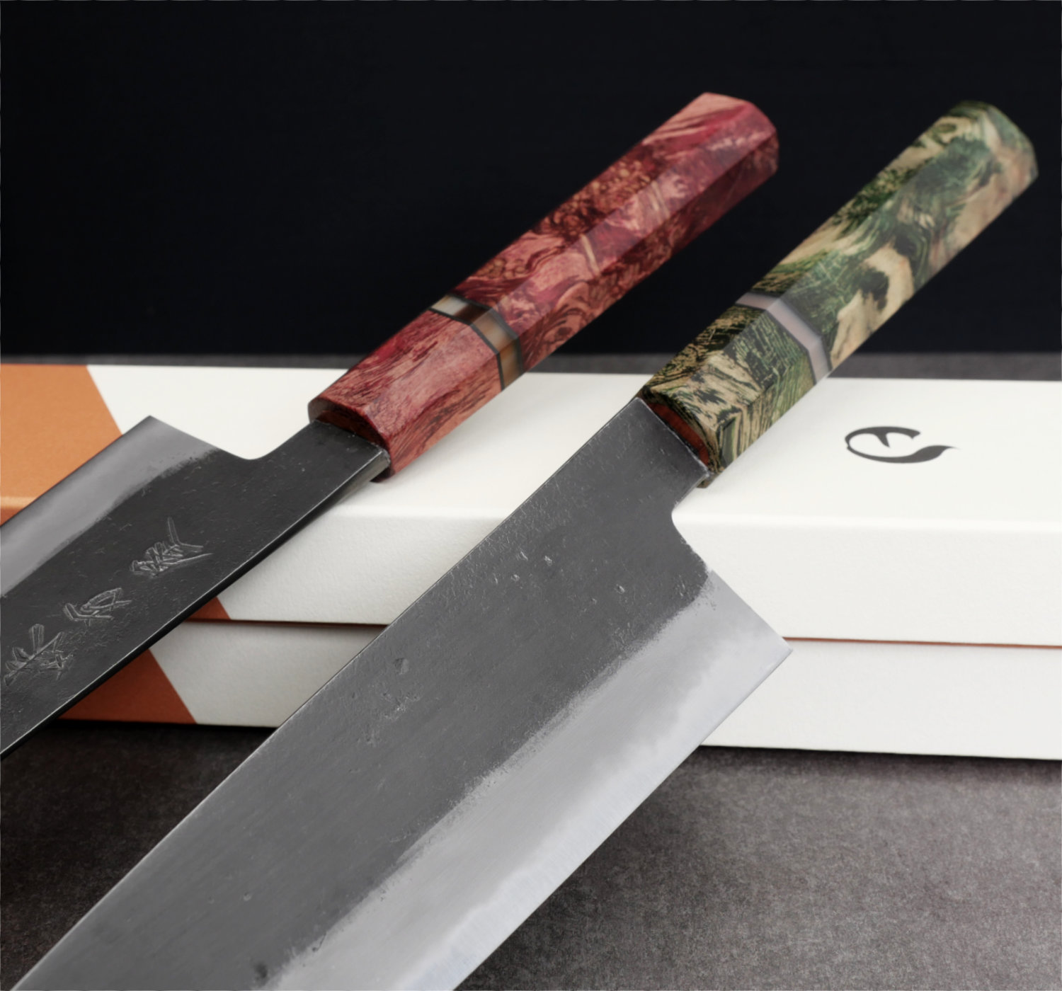 Som avslutning har den tunna och fina eggen försetts med en vacker kasumifinish. Kasumi är en dimmig och silkeslen finish som förhöjer kontrasten mellan det blanka kärnstålet och det utanpåliggande mjukare lagret. Det är få knivar som levereras med så vacker finish på bladet.