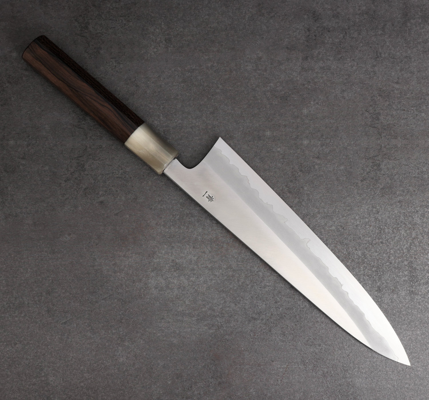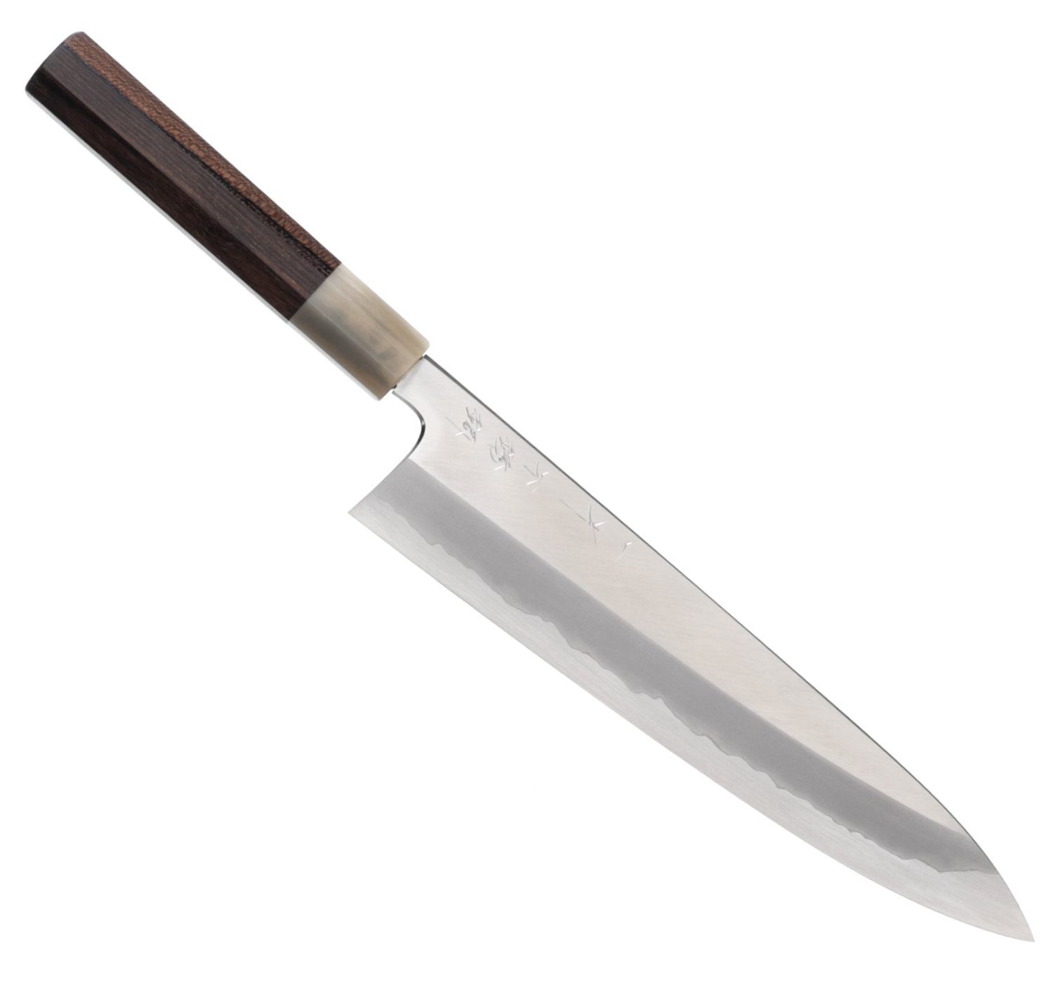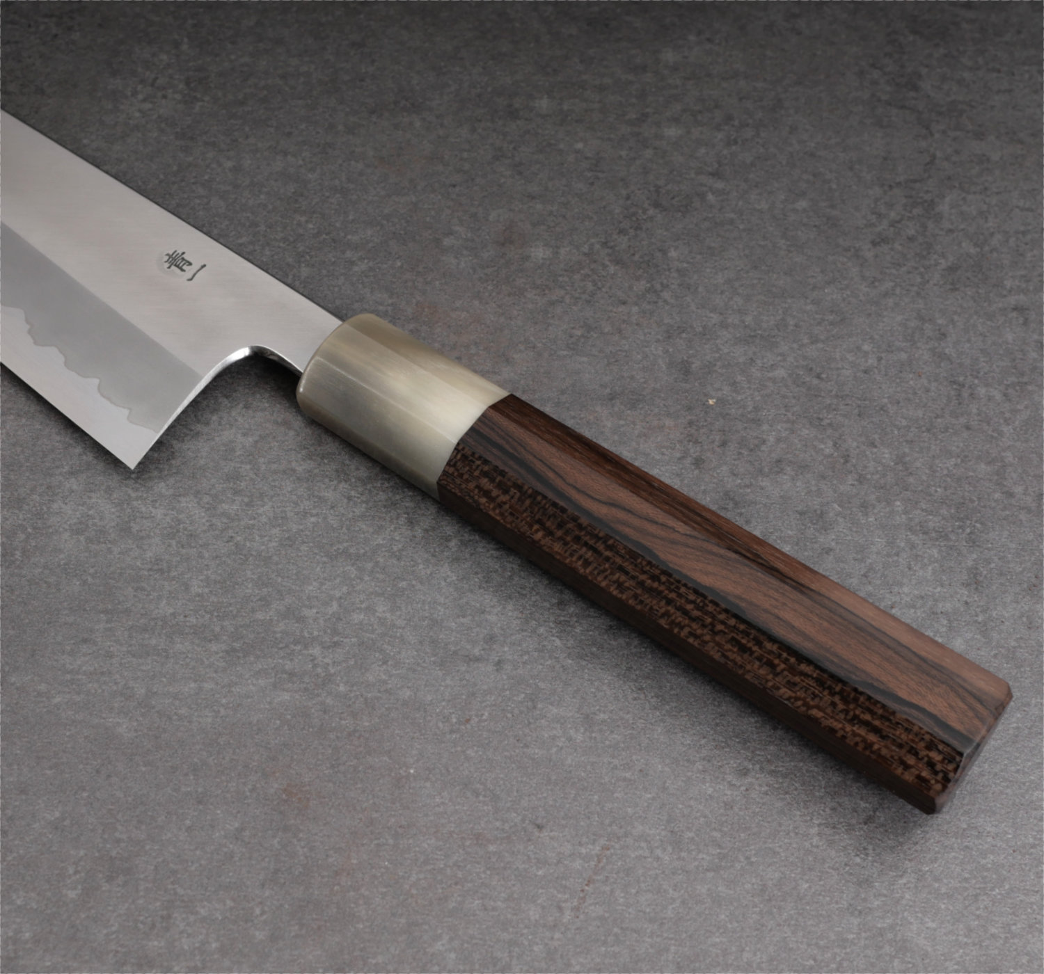 Bladet har klassisk gyuto-profil med tunn geometri och god balans. Skaftet är åttakantigt och tillverkas av Ziricote med bolster av buffelhorn.