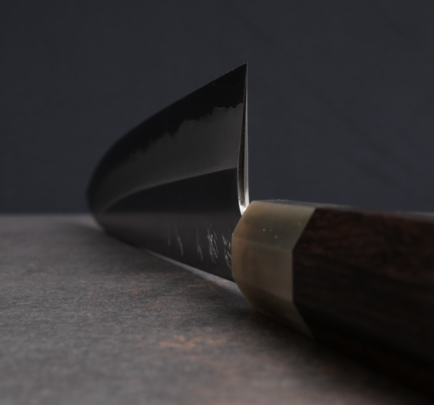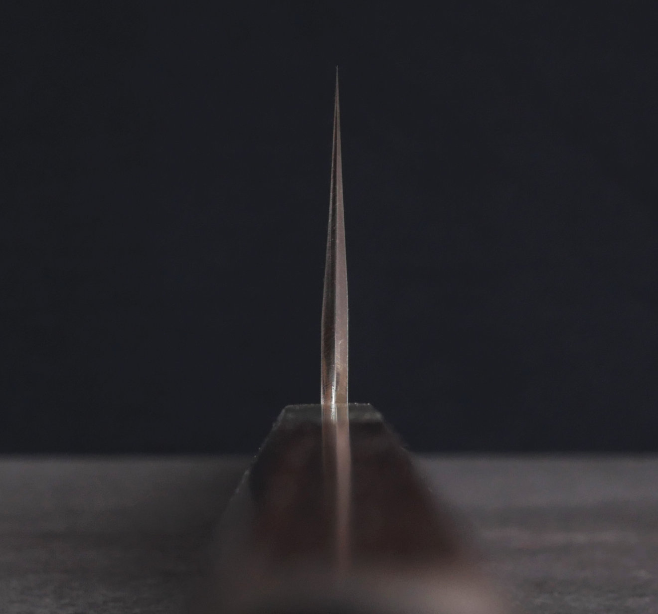 Kärnstålet är Aogami #1, ett rent kolstål som tar en mycket fin och aggressiv egg. Runt kärnan ligger en mjuk rostfri kappa.