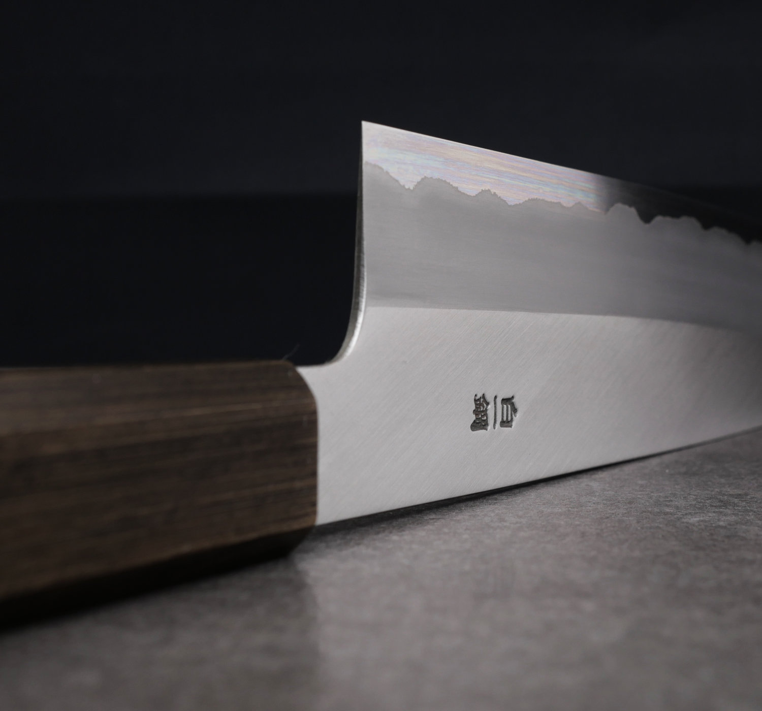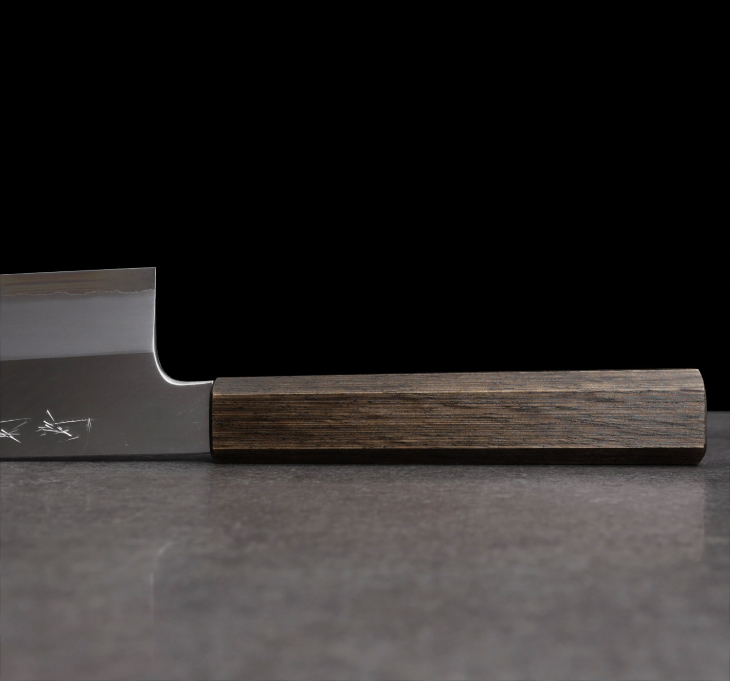 En extraordinär kniv skapad av mästaren Togashi san, en framstående smed från Sakai, Japan. Genom att använda sig av klassisk japansk smidesteknik har han skapat en klinga av absolut högsta kvalitet. Den här kniven använder kolstålet shirogami#1, vilket ger en imponerande skarp egg. För att säkerställa enkel underhåll och skydda mot rost har bladet laminerats med ett lager rostfritt stål på varje sida. Eftersom eggen är tunn kräver den omsorg, med enkel torkning efter användning och undvikande av fukt. Kniven är ergonomiskt utformad med en skön tyngd, vilket gör den lätt att hantera och den fantastiska skärpan gör den till en glädje att använda.