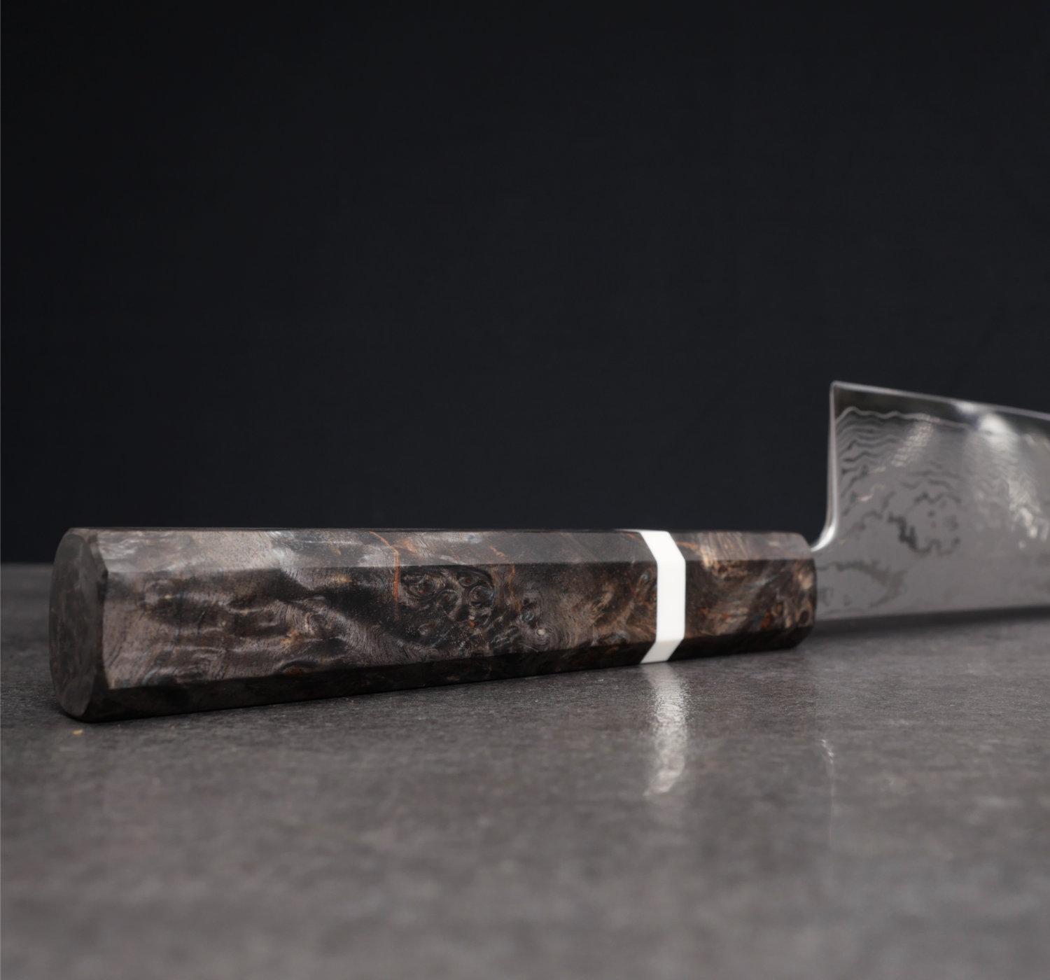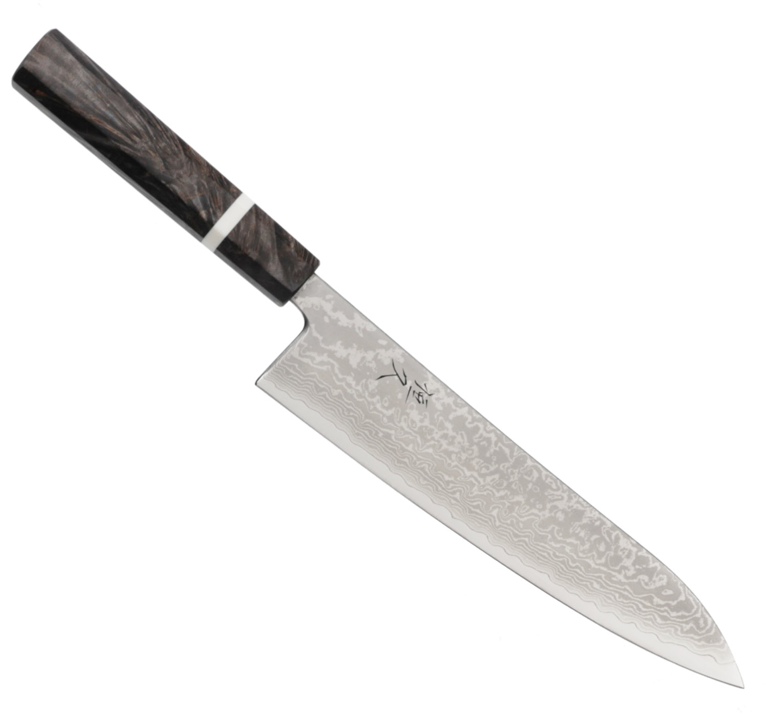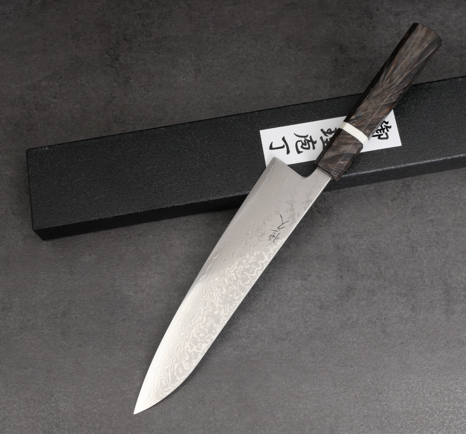 En handsmidd kockkniv med 213 mm långt blad i rostfritt VG-10 damaskus-stål.
