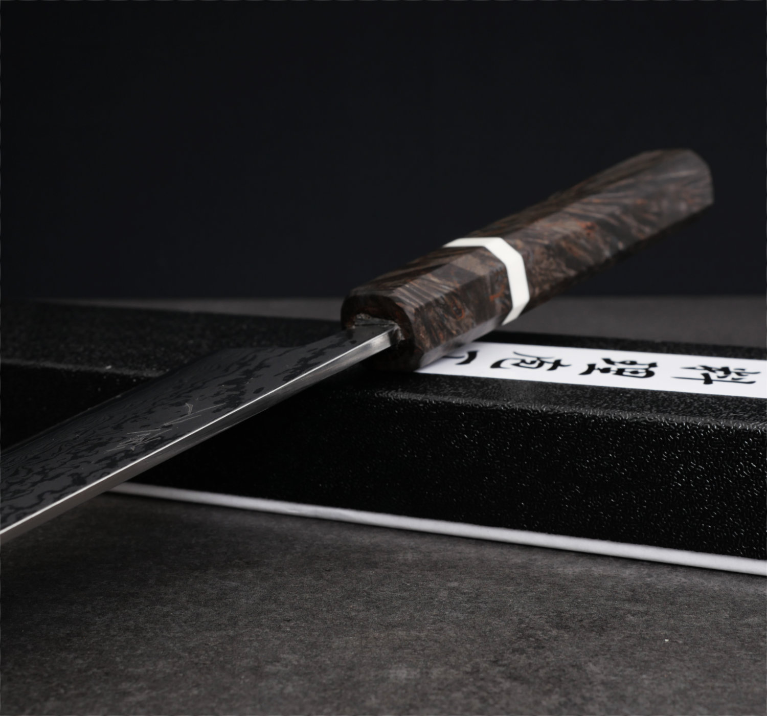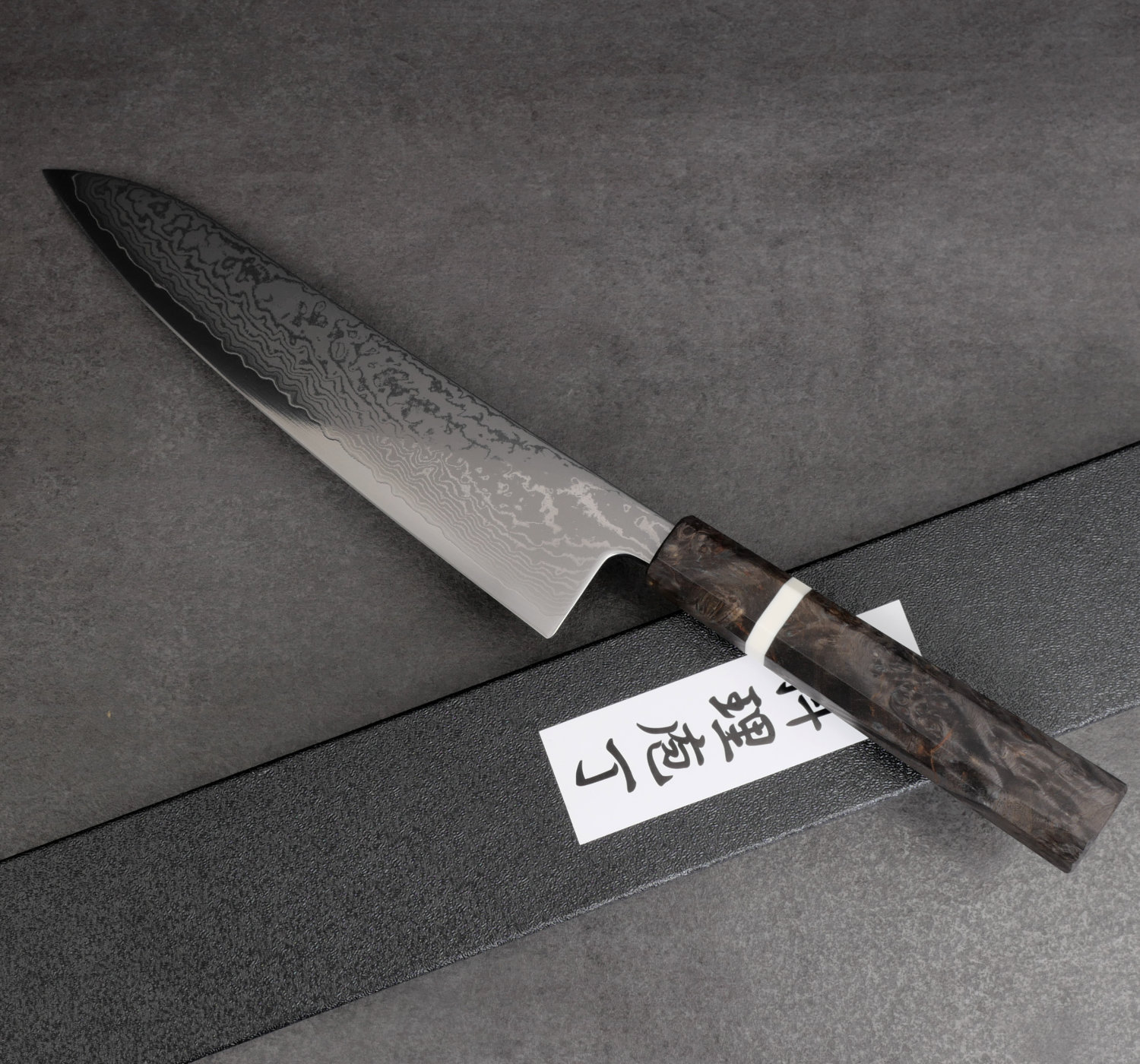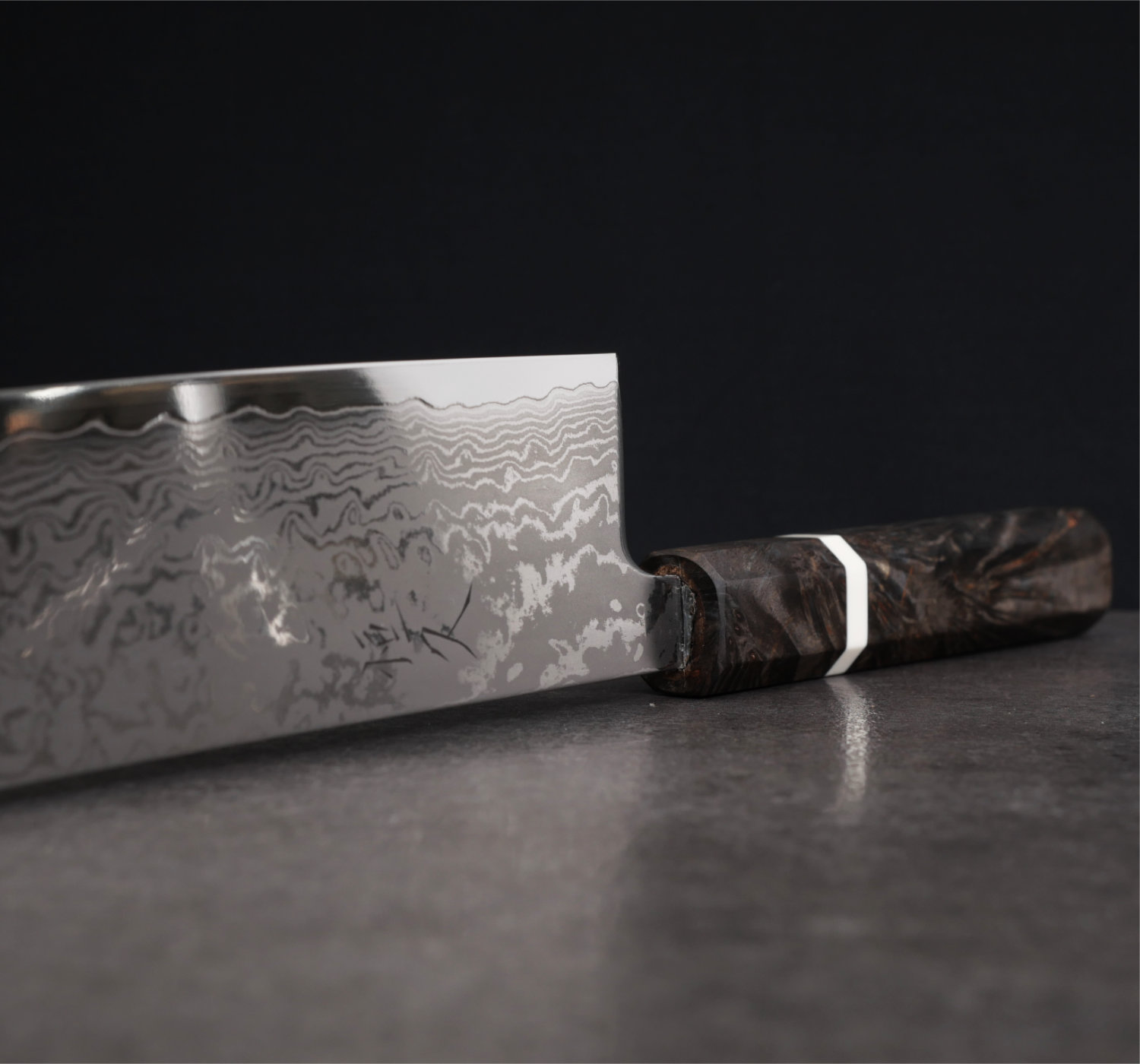 En handsmidd kockkniv med 213 mm långt blad i rostfritt VG-10 damaskus-stål.