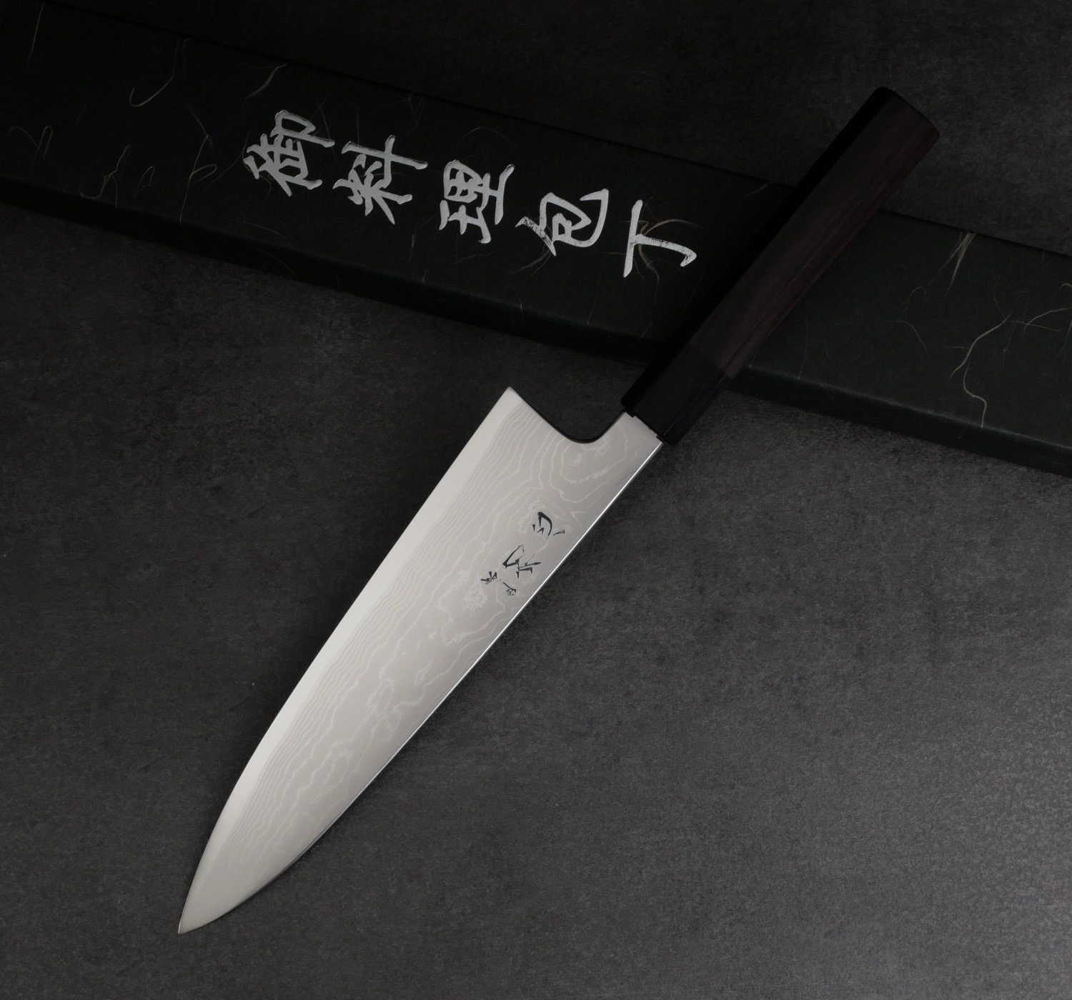 En japansk kockkniv, gyuto, med 21 cm långt blad. Kärnstålet är Aogami#1 som omges av flera lager järn, sk damaskusstål.