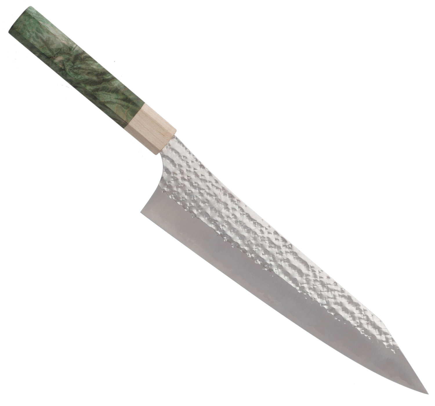 Kockkniv, gyuto, med 247 mm långt blad. Detta exemplar har ettåttakantigt skaft i stabiliserad lönn.