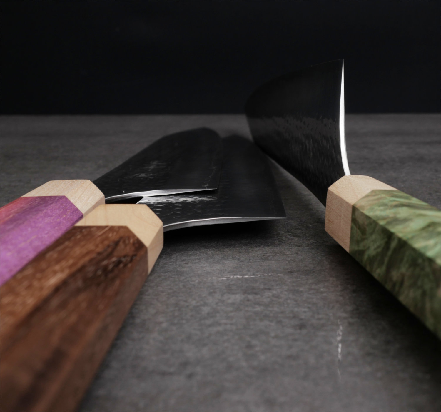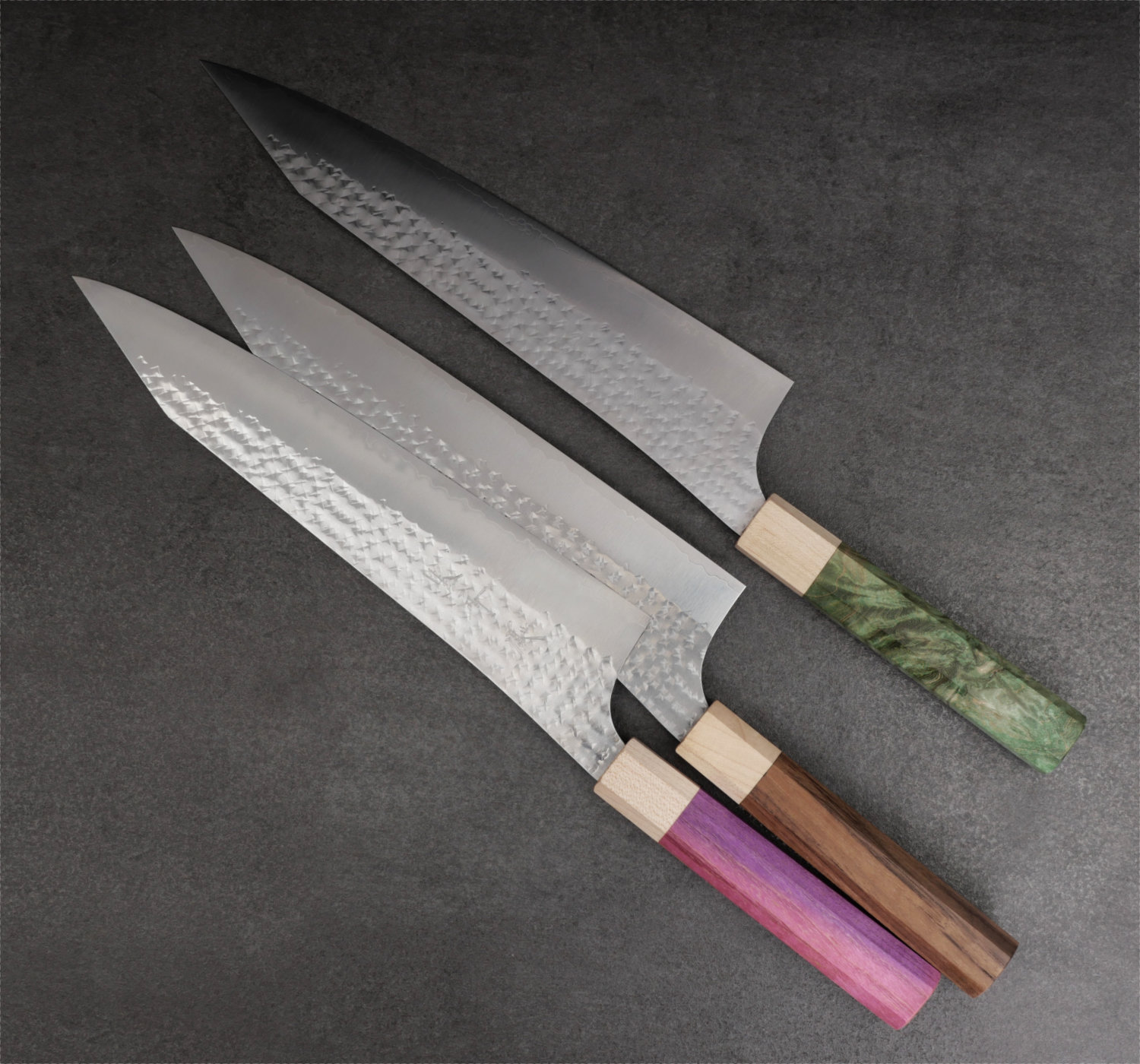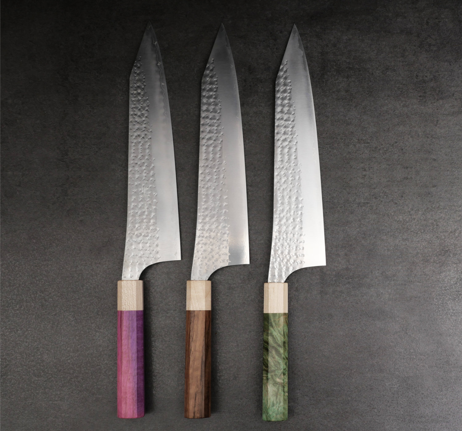 Yu Kurosaki tillhör den nya generationen av japanska smeder. Hans knivar är bedårande vackra och han använder enbart marknadens främsta material. I denna serie kombinerar han det toppresterande rostfria pulverstålet SG2 med hammarbankade bladsidor som polerats skinande blanka. Till detta monteras ett vackert 8-kantigt träskaft. Bladen är mycket tunna och håller skärpan exeptionellt länge tack vare det hårda pulverstålet. Vikten är väl avvägd och knivarna ligger suveränt i handen.
